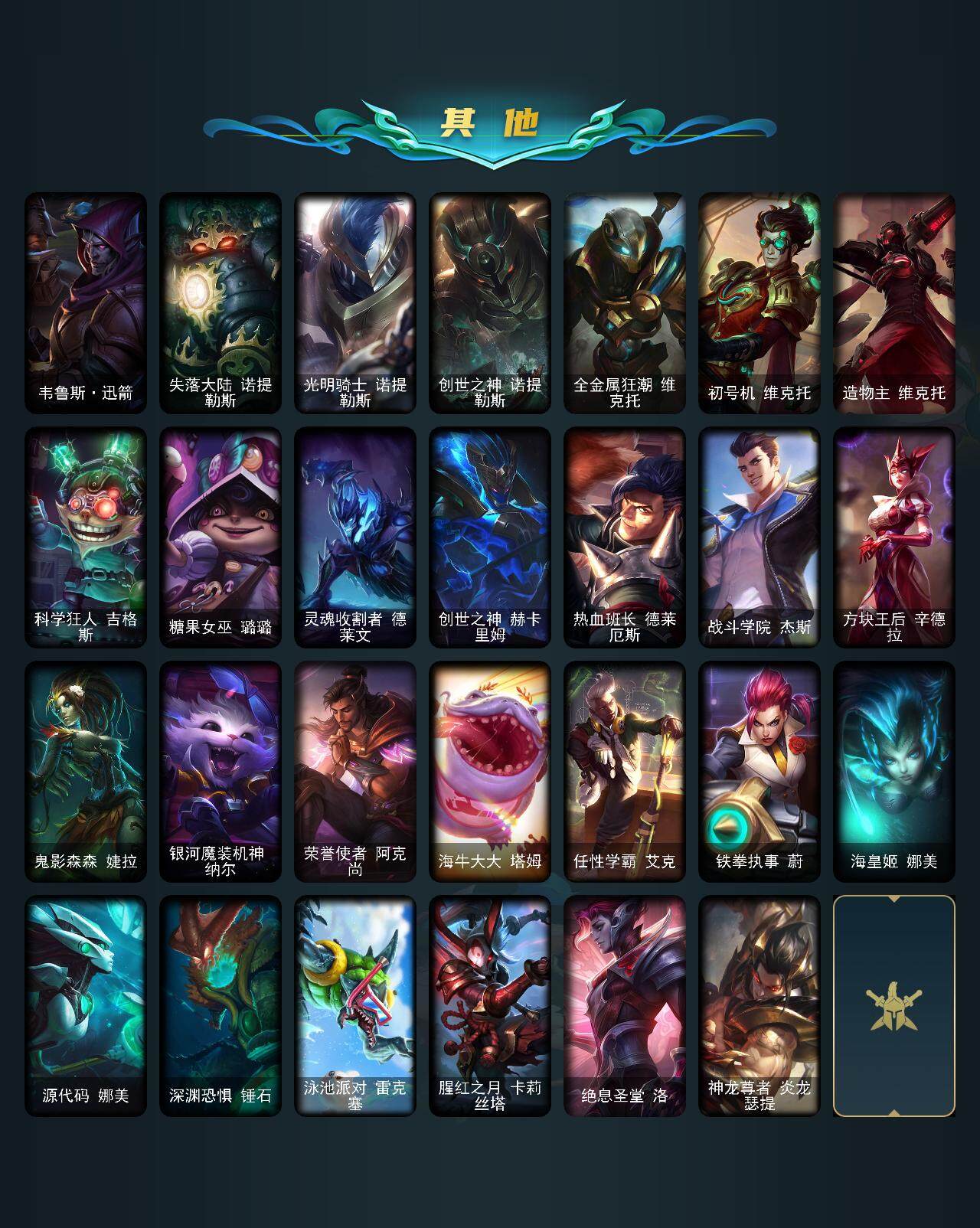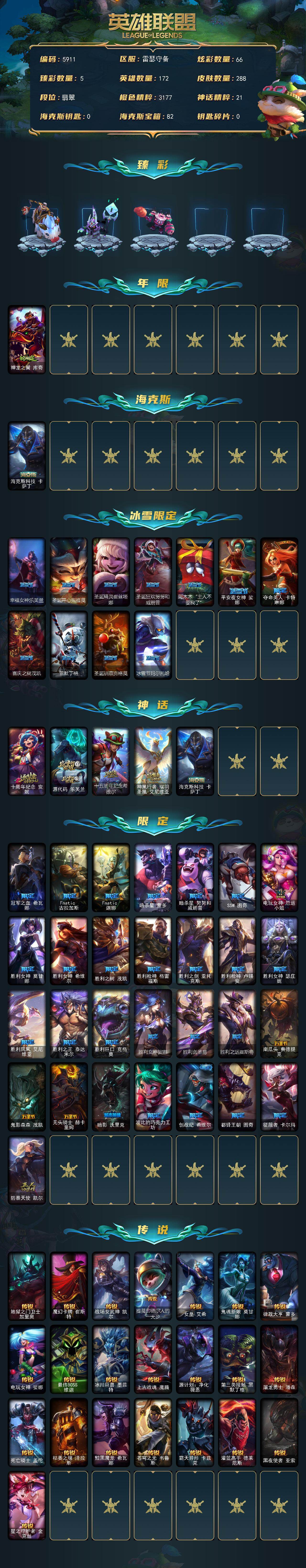 172英雄-288皮肤-172英雄/288皮肤/5神话/41限定/5臻彩/66炫彩/22传说/74史诗/流光翡翠/十周年纪念 安妮/源代码 乐芙兰/十五周年纪念 希维尔/神凰行者 瑞羽圣凰 艾尼维亚/海克斯科技 卡萨丁/无畏骑士 瑟庄妮 赤子初心/战斗学院 卡特琳娜 盛典礼服/最终boss 维迦 里·大魔王/可爱可爱粉红红 布里茨/幽梦玫瑰辛德拉纯洁花蕾/神龙之翼 库奇/幸福女神乐芙兰/圣诞开心鬼提莫/圣诞精灵崔丝塔