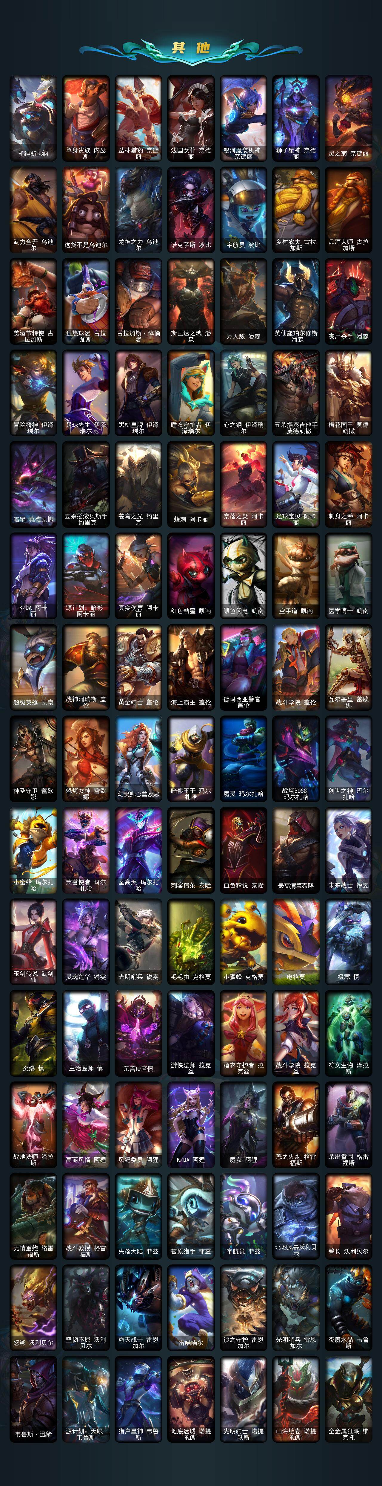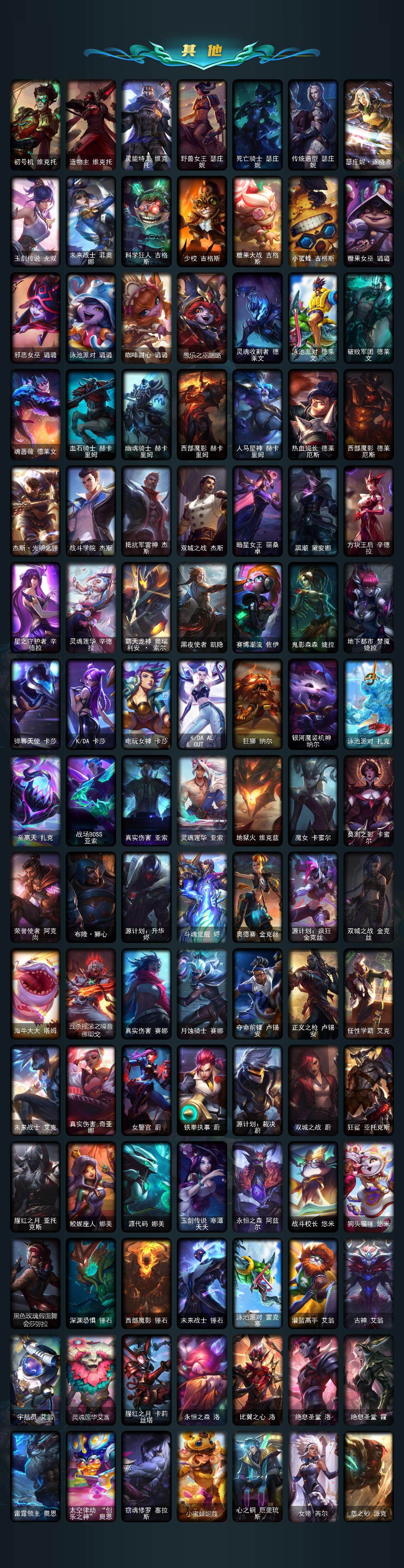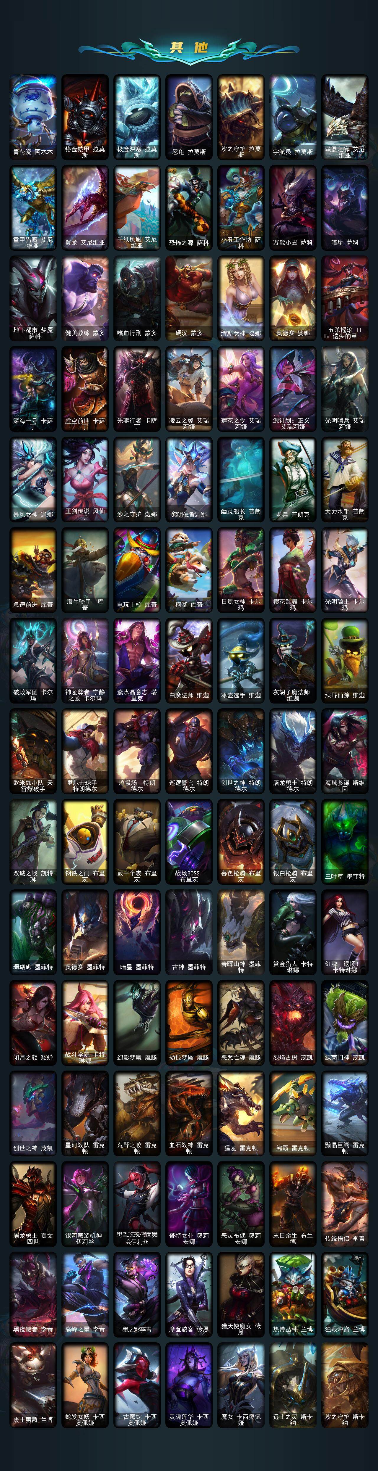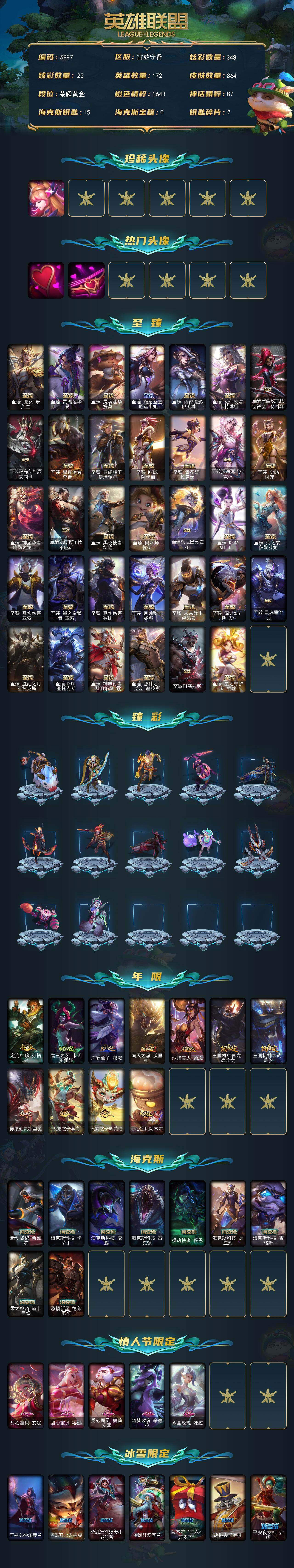 172英雄-864皮肤-172英雄/864皮肤/3终极/55神话/98限定/25臻彩/348炫彩/74传说/174史诗/黄金/十周年纪念 安妮/源代码 乐芙兰/十五周年纪念 希维尔/水晶圣骑 艾希/新卧虎藏龙 贾克斯/暗星 科加斯/神凰行者 瑞羽圣凰 艾尼维亚/黎明使者 卡尔玛/殿堂传奇薇恩/灰烬征服者 潘森/灰烬骑士 莫德凯撒/灰烬骑士 派克/海克斯科技 吉格斯/海克斯科技 卡萨丁/海克斯科技 雷克顿/海克斯科技