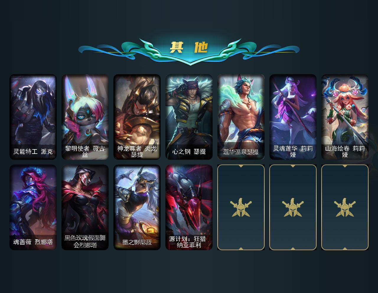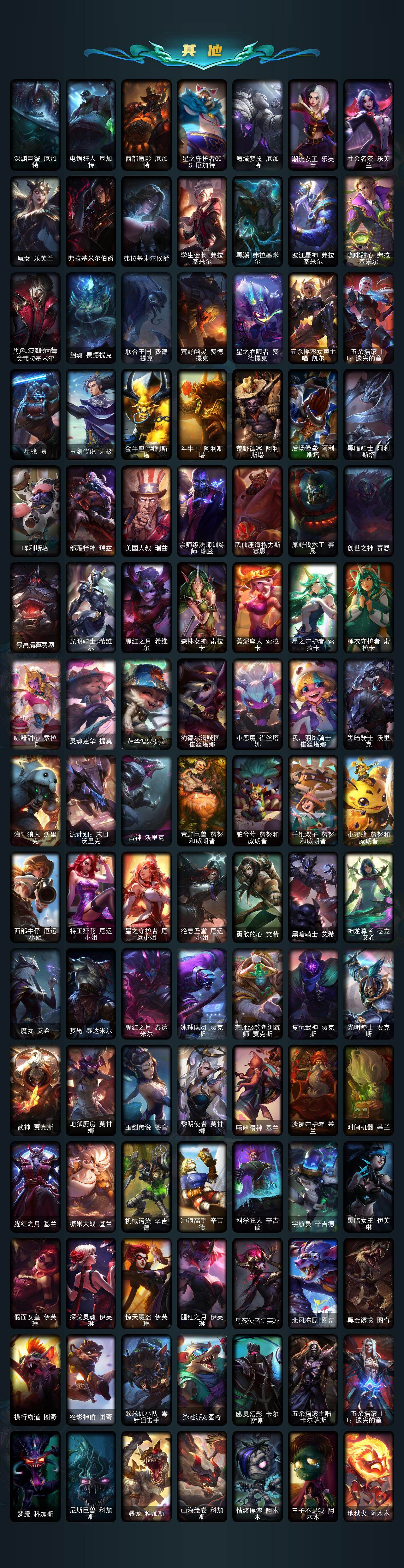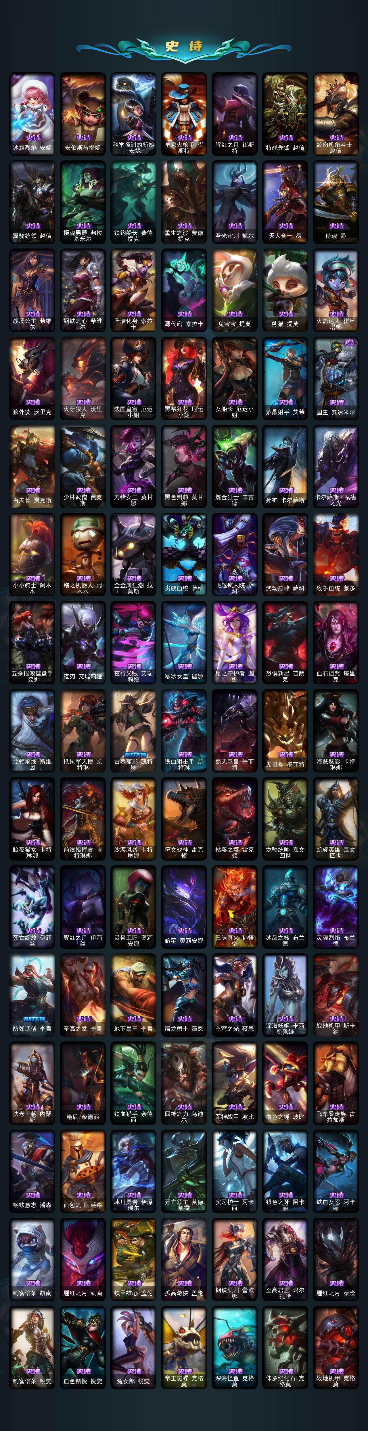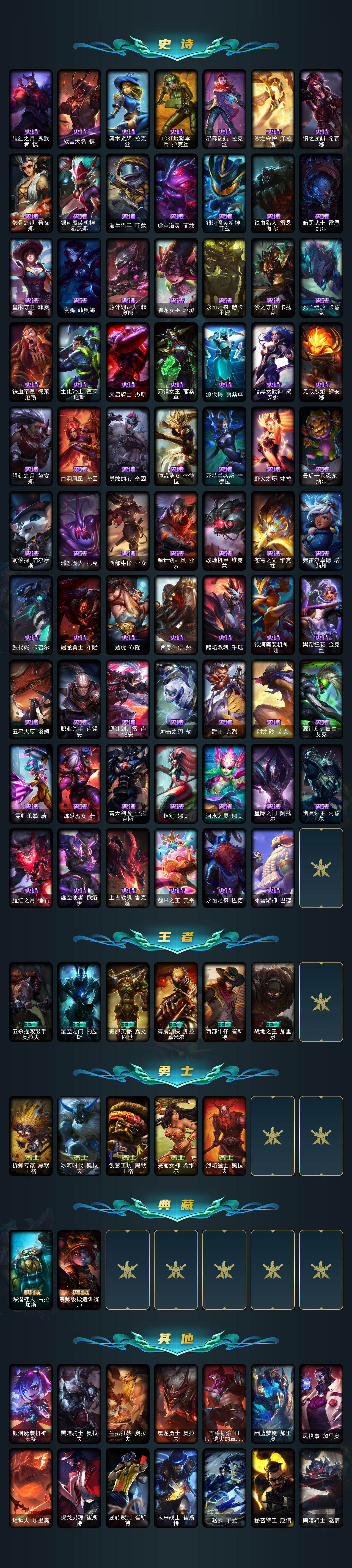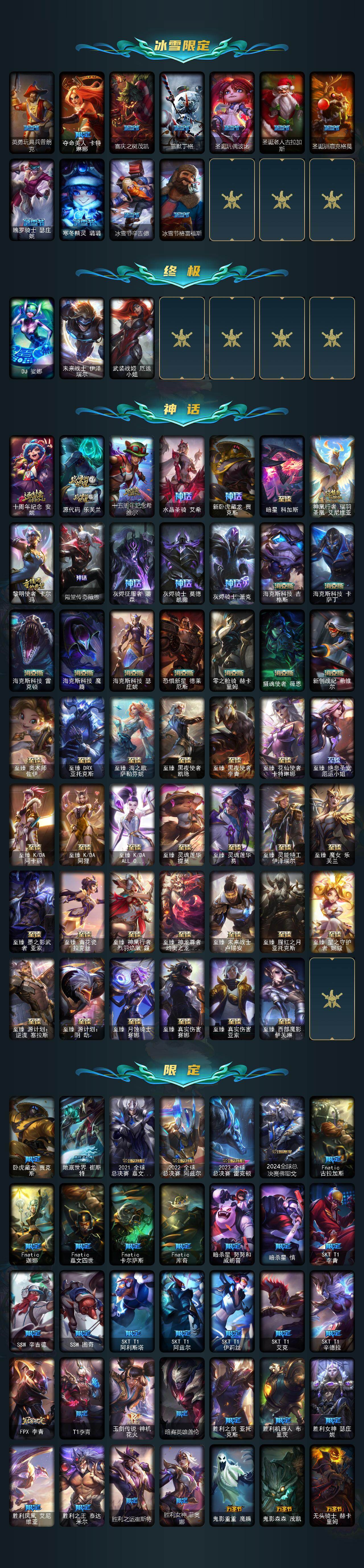 172英雄-864皮肤-172英雄/864皮肤/3终极/55神话/98限定/25臻彩/348炫彩/74传说/174史诗/黄金/十周年纪念 安妮/源代码 乐芙兰/十五周年纪念 希维尔/水晶圣骑 艾希/新卧虎藏龙 贾克斯/暗星 科加斯/神凰行者 瑞羽圣凰 艾尼维亚/黎明使者 卡尔玛/殿堂传奇薇恩/灰烬征服者 潘森/灰烬骑士 莫德凯撒/灰烬骑士 派克/海克斯科技 吉格斯/海克斯科技 卡萨丁/海克斯科技 雷克顿/海克斯科技