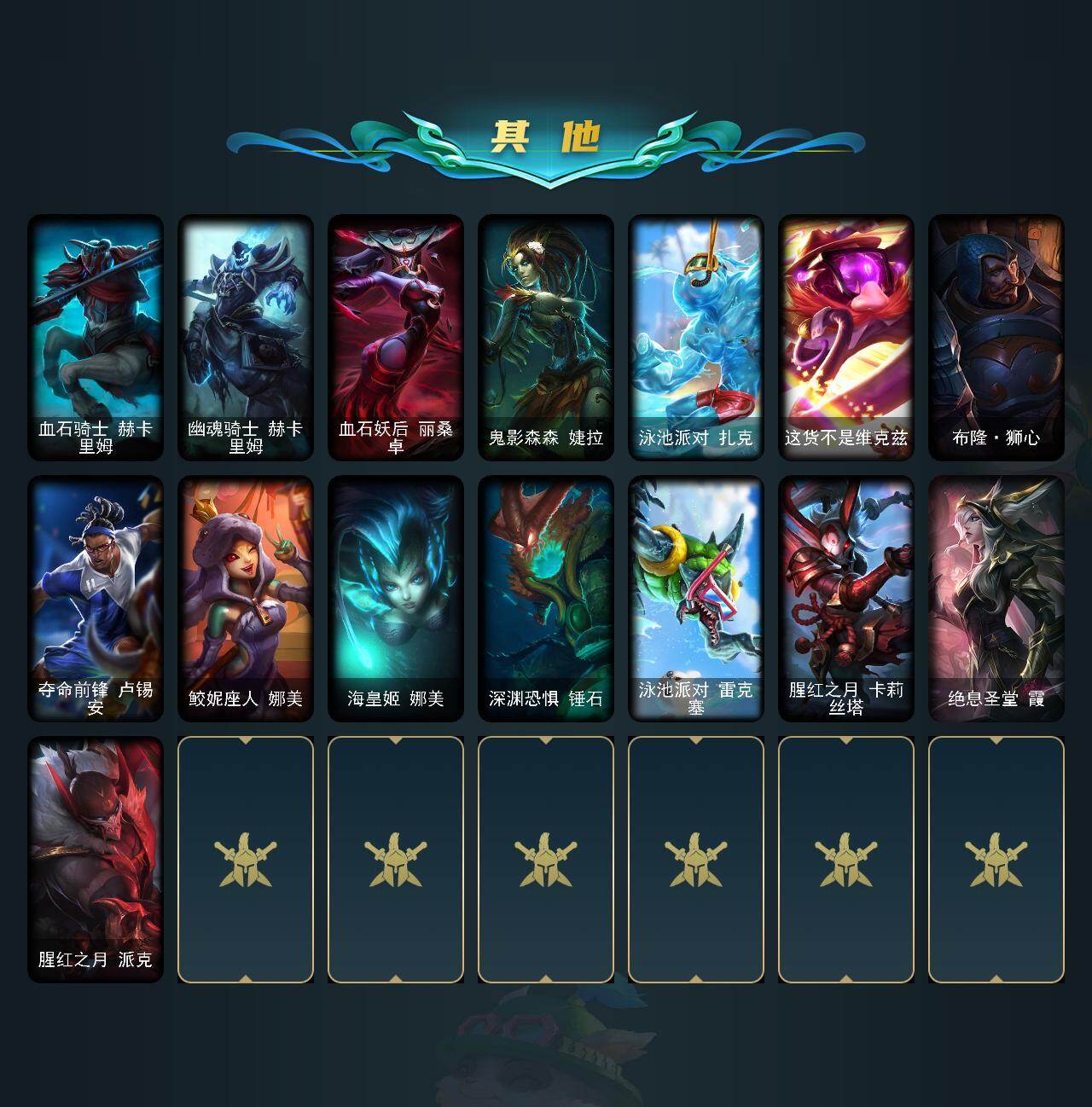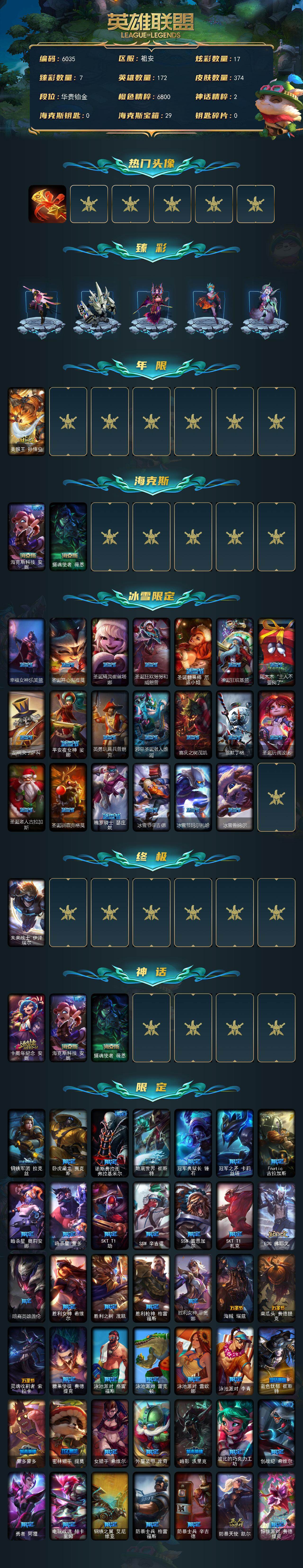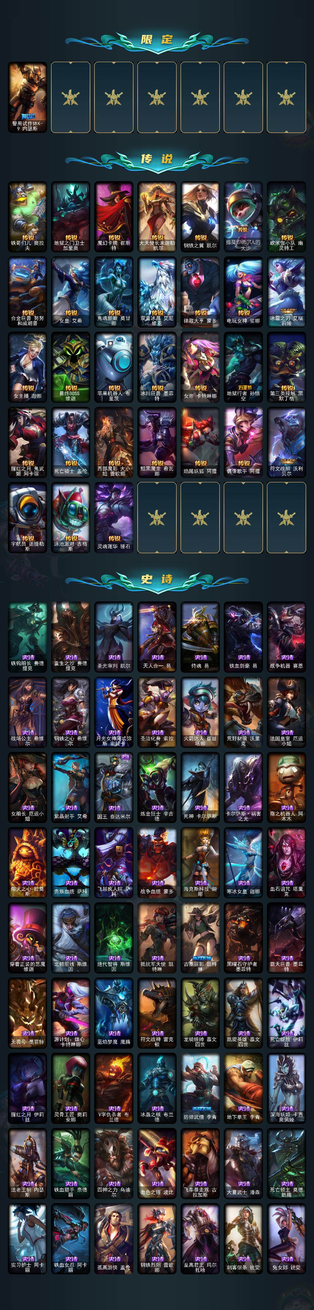 172英雄-374皮肤-172英雄/374皮肤/1终极/3神话/64限定/7臻彩/17炫彩/31传说/96史诗/铂金/十周年纪念 安妮/海克斯科技 安妮/摄魂使者 薇恩/卡特琳娜的匕首头像/天龙之子卡莎飞龙乘云/玉剑传说 无影 竞星/霸天巨兽·雪崩 墨菲特/星之吞噬者 莫甘娜 热情之末/灵魂莲华 锐雯 流火/魔女 阿卡丽 虚荣/净雪之月 莫甘娜 冬虹/美猴王 孙悟空/幸福女神乐芙兰/圣诞开心鬼提莫/圣诞精灵崔丝塔娜/