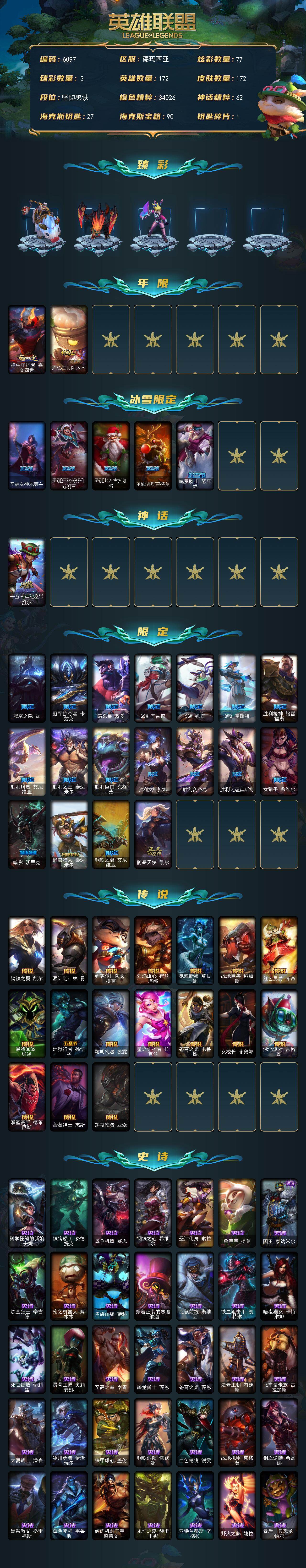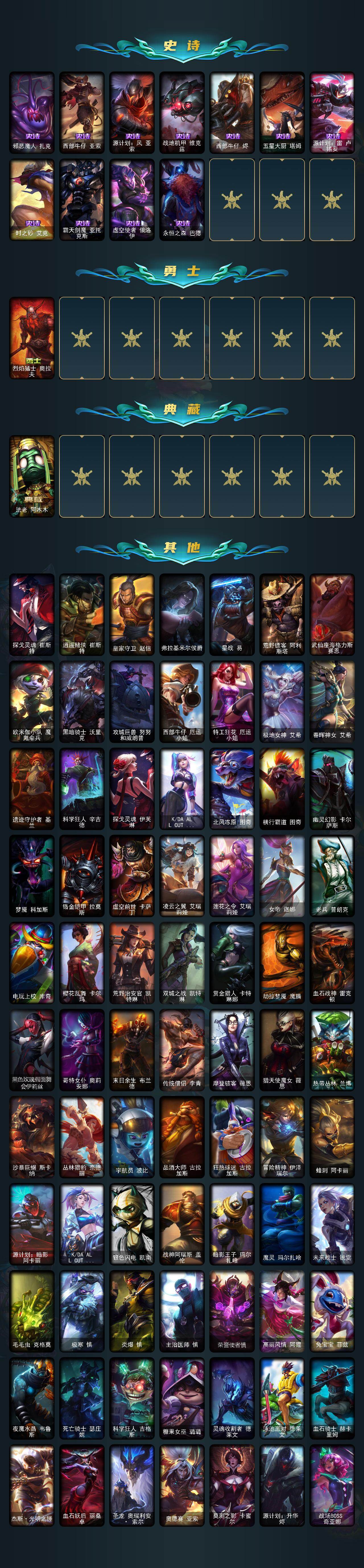 172英雄-172皮肤-172英雄/172皮肤/1神话/25限定/3臻彩/77炫彩/17传说/46史诗/未定级/十五周年纪念 希维尔/无畏骑士 瑟庄妮 赤子初心/山海绘卷 科加斯 朱红/幻灵战斗兔 锐雯 梦幻强袭/福牛守护者 嘉文四世/点心宝贝阿木木/幸福女神乐芙兰/圣诞狂欢努努和威朗普/圣诞老人古拉加斯/圣诞驯鹿克格莫/魄罗骑士 瑟庄妮/冠军之隐 劫/冠军掠夺者 卡兹克/暗杀星 蒙多/ssw 辛吉德/ssw 锤石/