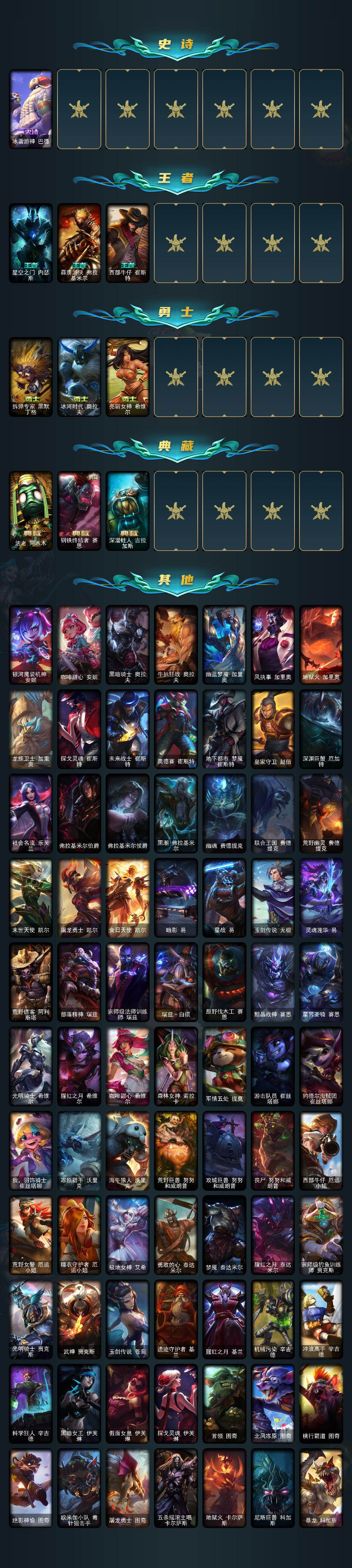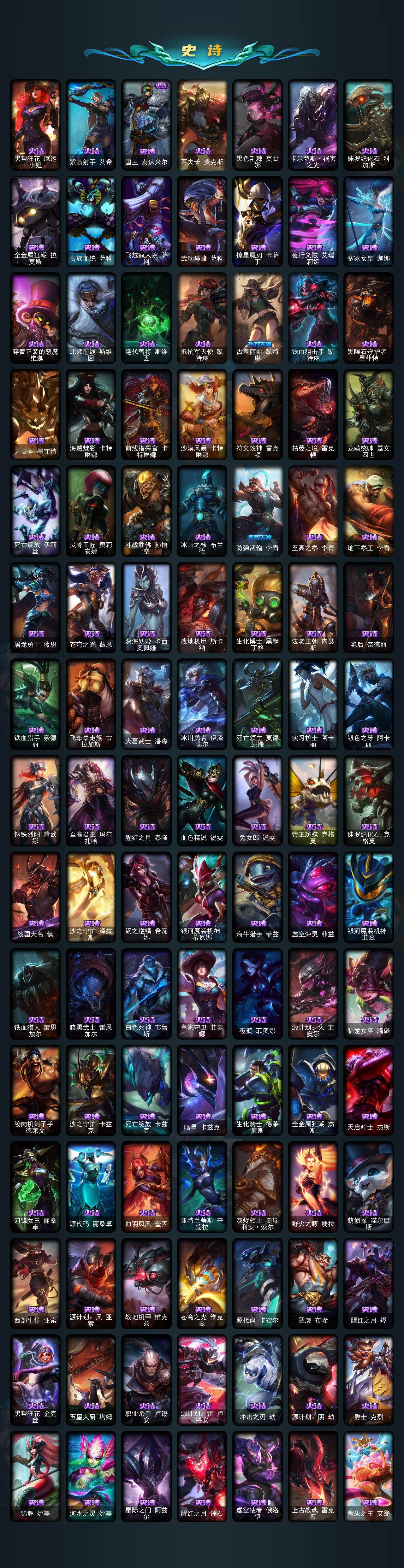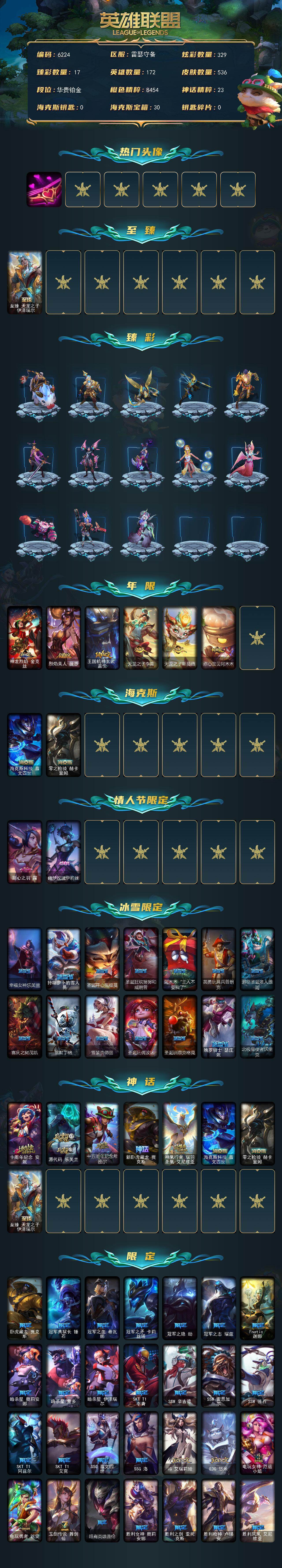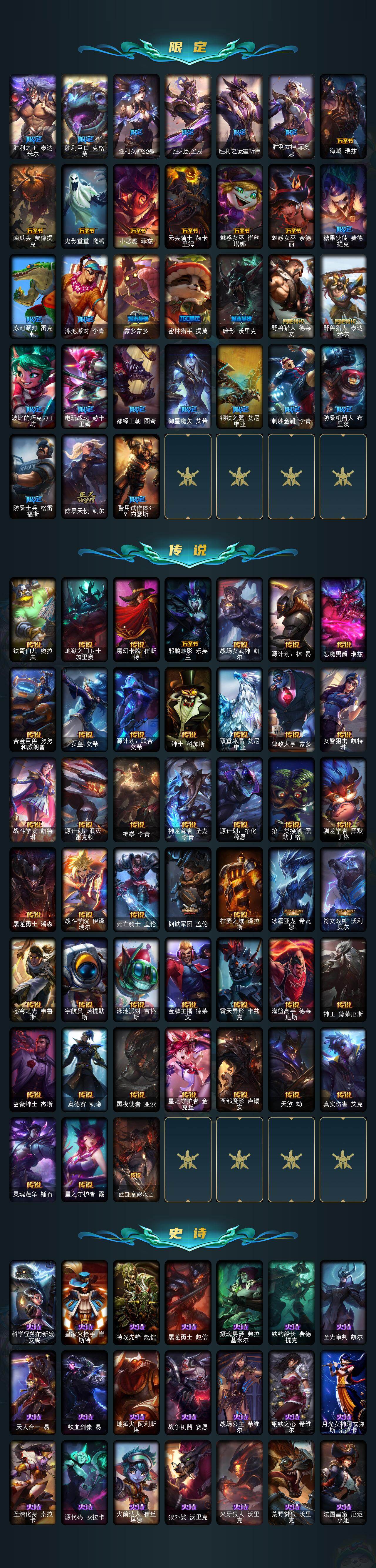 172英雄-536皮肤-172英雄/536皮肤/8神话/81限定/17臻彩/329炫彩/45传说/127史诗/铂金/十周年纪念 安妮/源代码 乐芙兰/十五周年纪念 希维尔/新卧虎藏龙 贾克斯/神凰行者 瑞羽圣凰 艾尼维亚/海克斯科技 嘉文四世/零之呛骑 赫卡里姆/至臻 天龙之子 伊泽瑞尔/爱情之歌头像/天龙之子卡莎飞龙乘云/无畏骑士 瑟庄妮 赤子初心/墨之影武者亚索金墨耀影/冠军之志 瑞兹 凯旋圣装/冠军掠夺者 卡兹