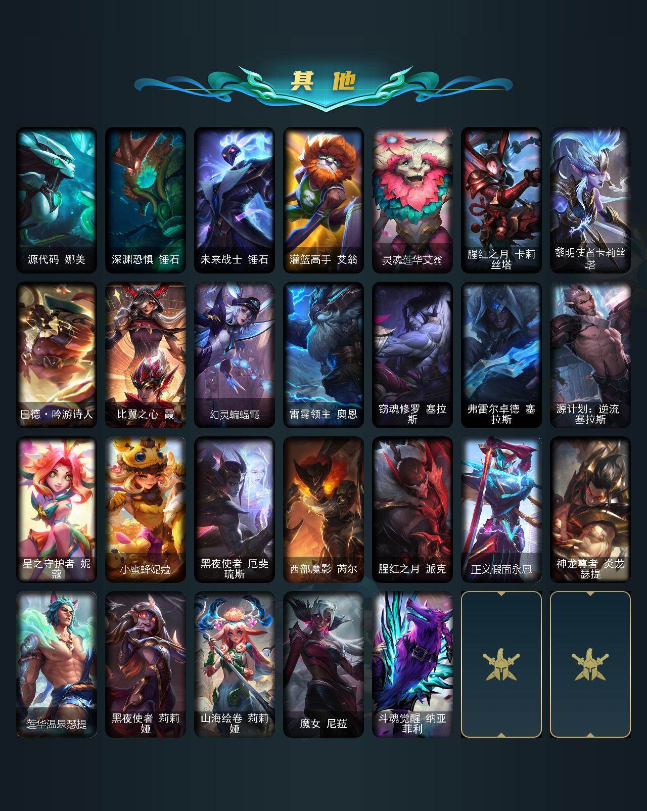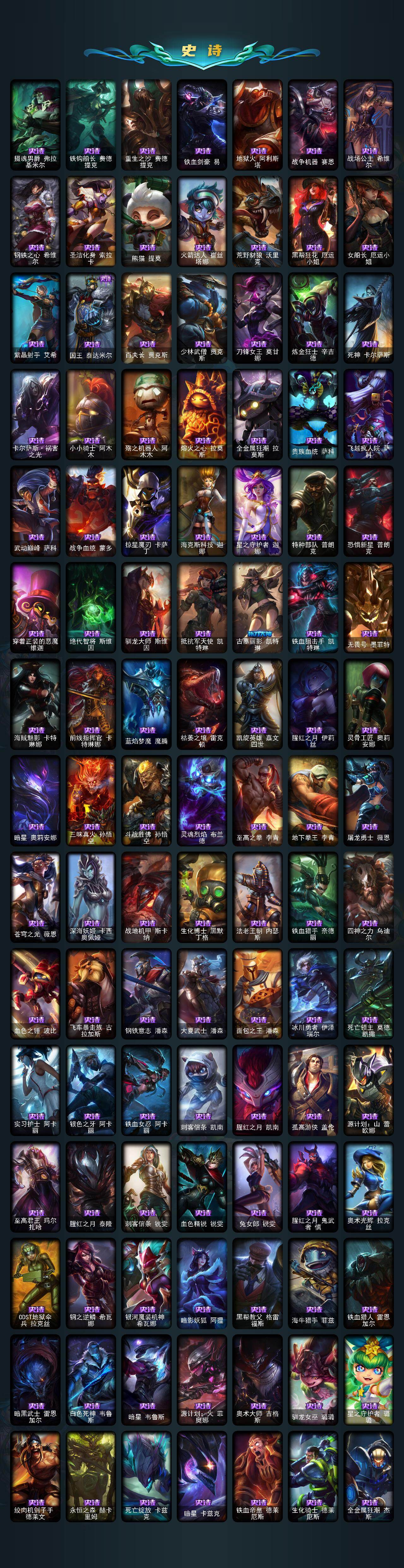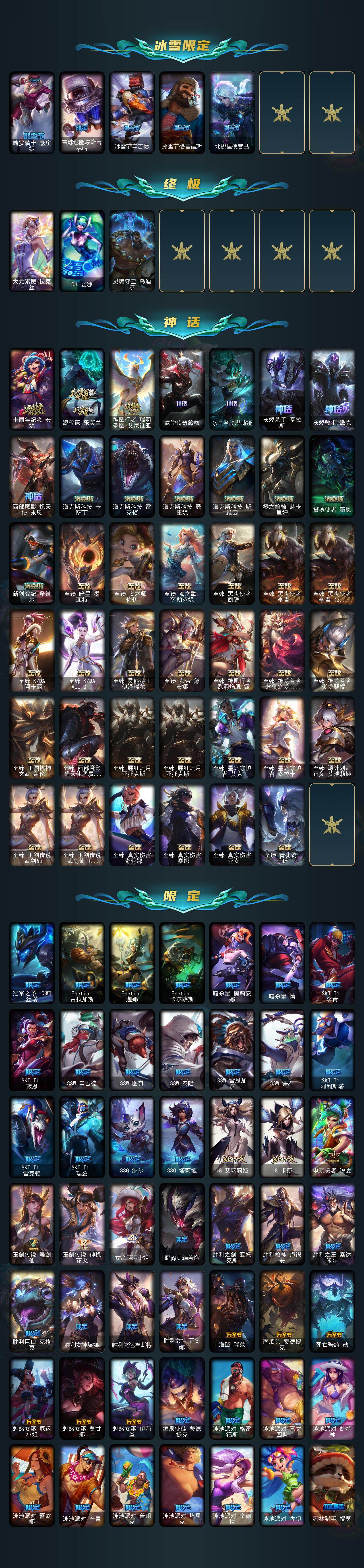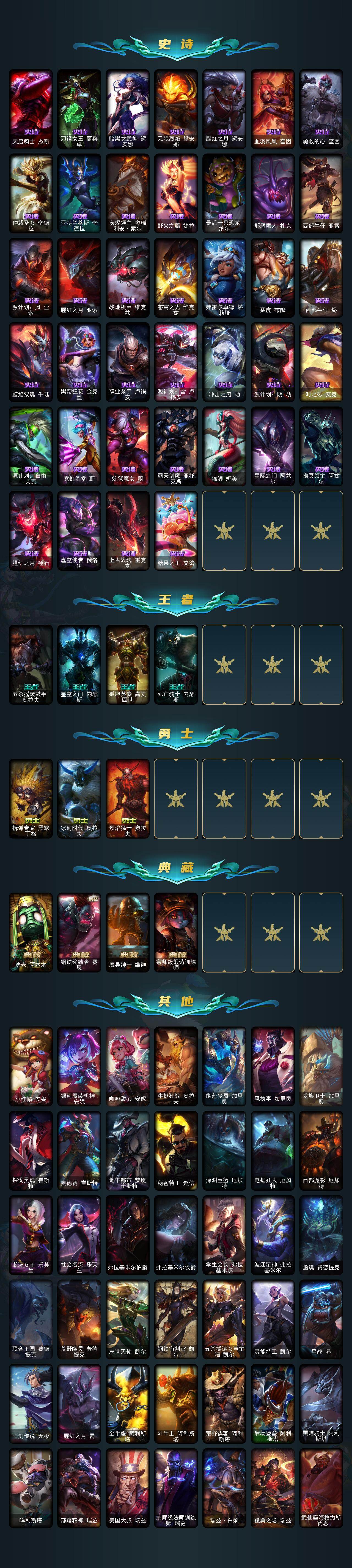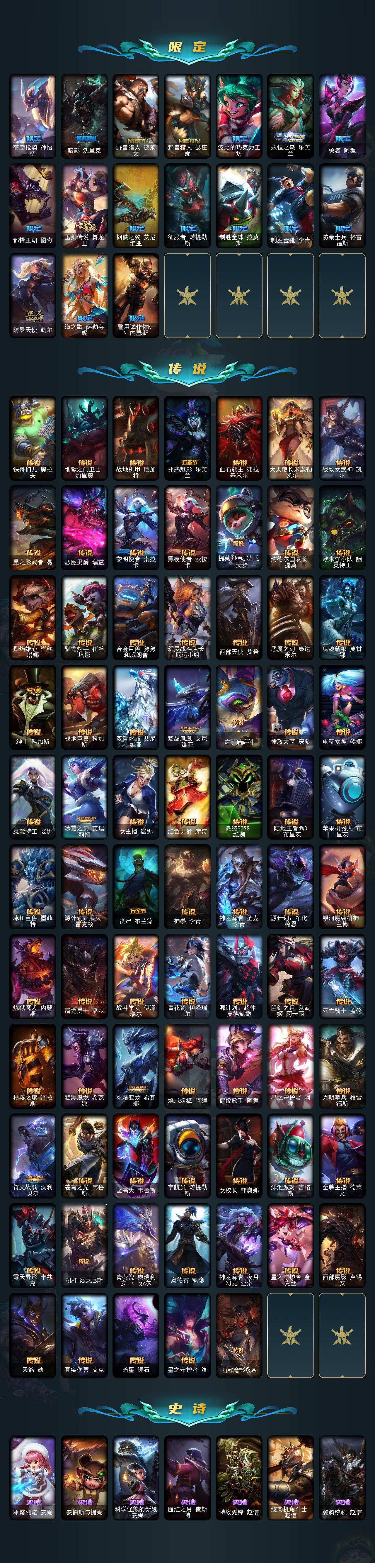 172英雄-767皮肤-172英雄/767皮肤/3终极/47神话/95限定/19臻彩/444炫彩/75传说/151史诗/未定级/十周年纪念 安妮/源代码 乐芙兰/神凰行者 瑞羽圣凰 艾尼维亚/殿堂传奇薇恩/水晶圣骑 塔莉垭/灰烬杀手 塞拉斯/灰烬骑士 派克/西部魔影 炽天使 永恩/海克斯科技 卡萨丁/海克斯科技 雷克顿/海克斯科技 瑟庄妮/海克斯科技 斯维因/零之呛骑 赫卡里姆/摄魂使者 薇恩/新创战纪 希维尔/至臻