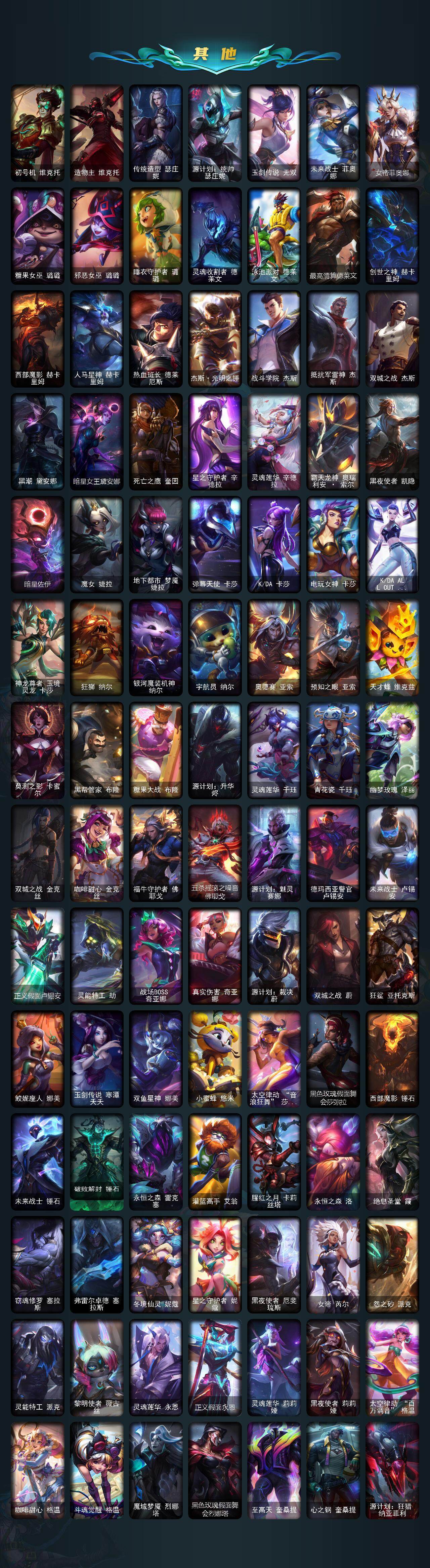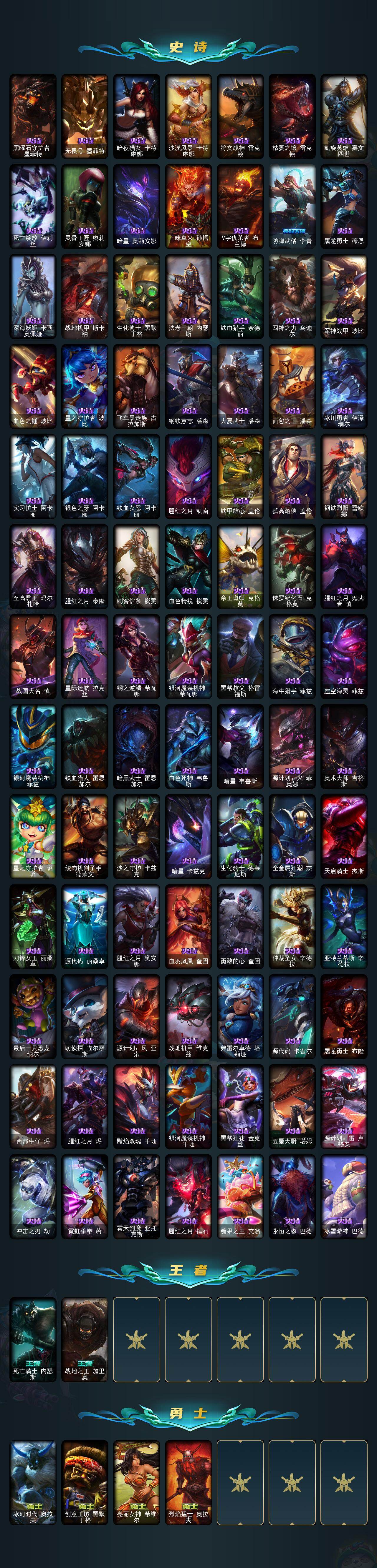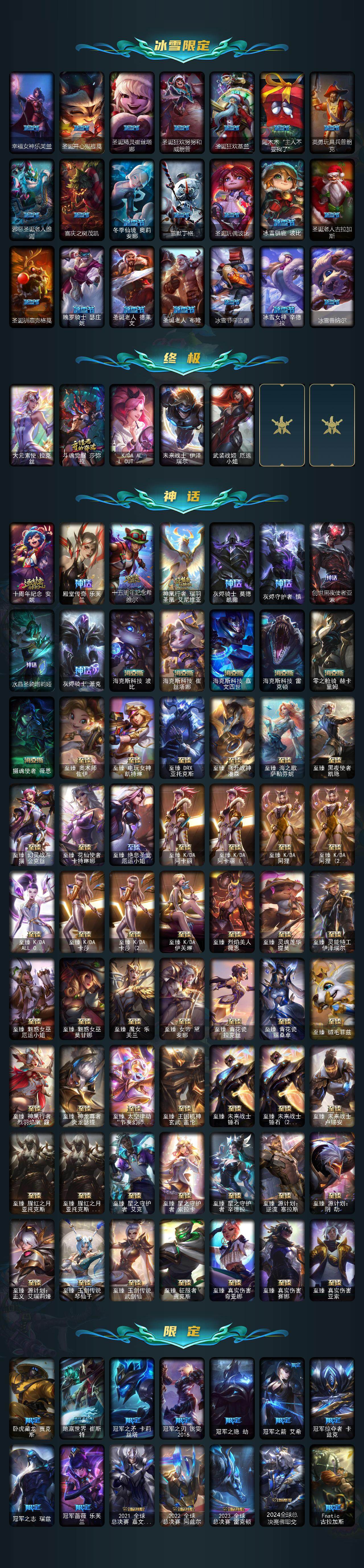 172英雄-736皮肤-172英雄/736皮肤/7终极/67神话/137限定/34臻彩/340炫彩/89传说/126史诗/白银/十周年纪念 安妮/殿堂传奇 乐芙兰/十五周年纪念 希维尔/神凰行者 瑞羽圣凰 艾尼维亚/灰烬骑士 莫德凯撒/灰烬守护者 慎/创世黑夜使者亚索/水晶圣骑 塔莉垭/灰烬骑士 派克/海克斯科技 波比/海克斯科技 崔丝塔娜/海克斯科技 嘉文四世/海克斯科技 雷克顿/零之呛骑 赫卡里姆/摄魂使者 薇恩
