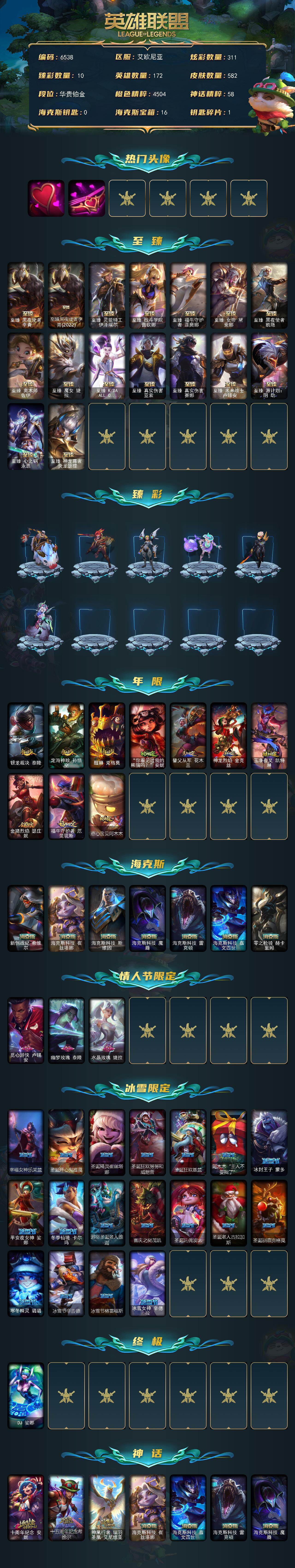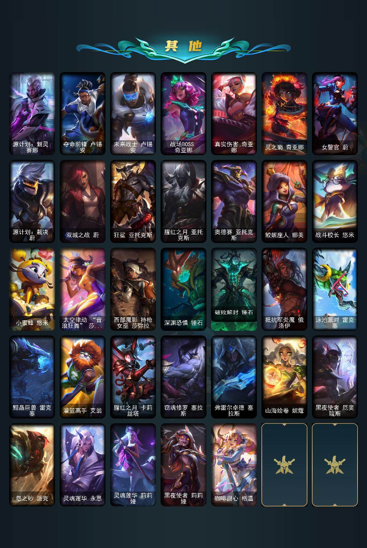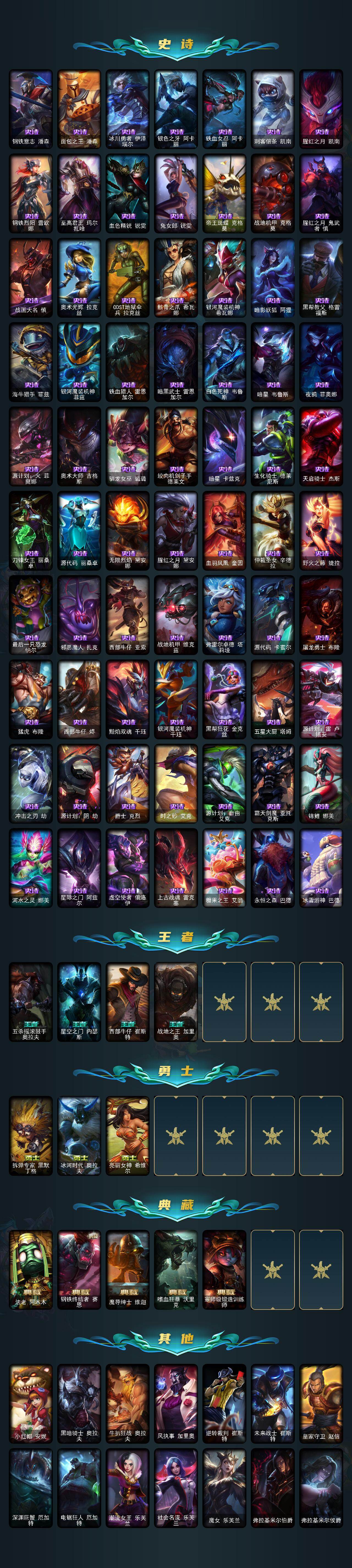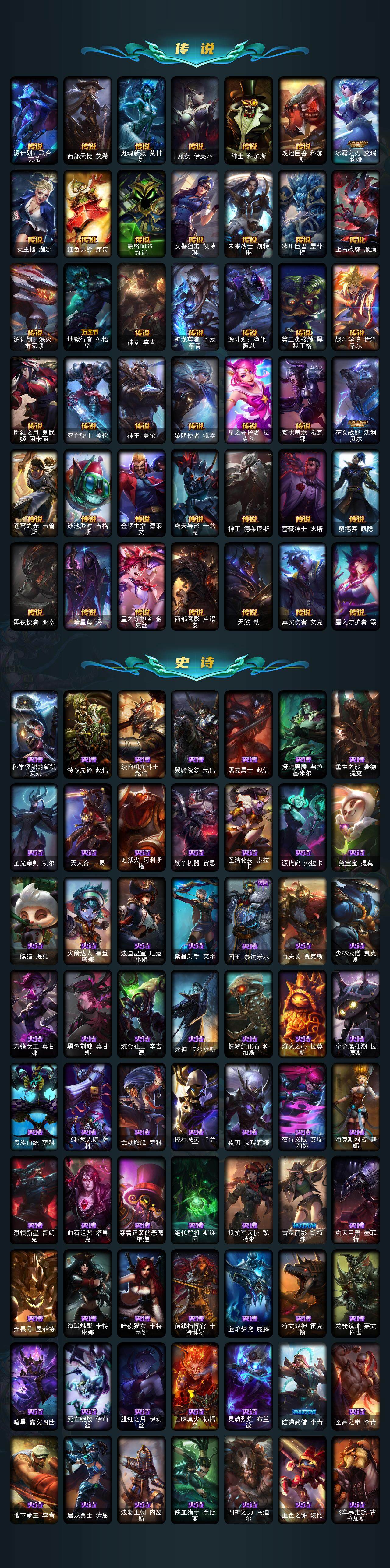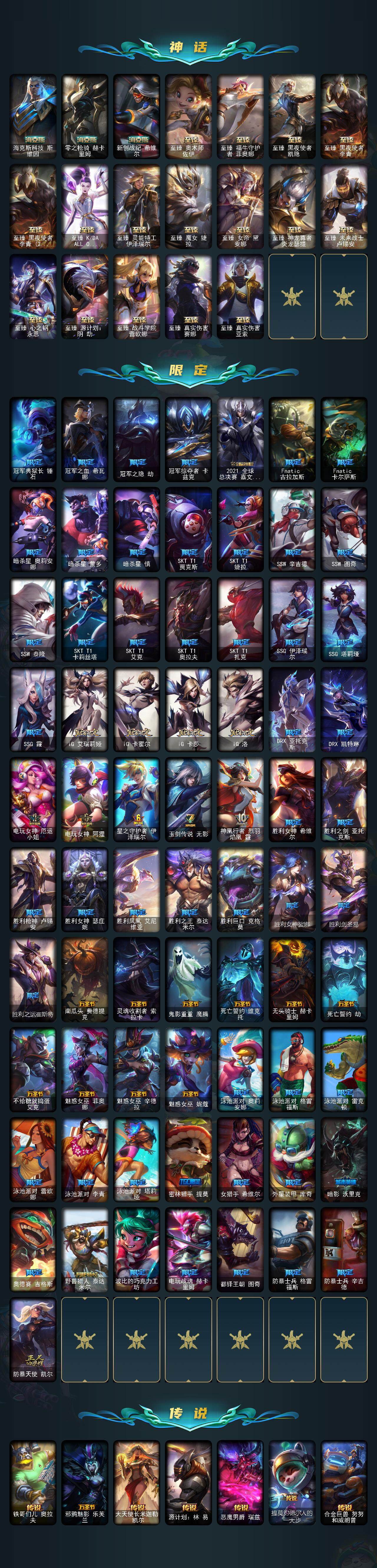 172英雄-582皮肤-172英雄/582皮肤/1终极/26神话/103限定/10臻彩/311炫彩/49传说/133史诗/铂金/十周年纪念 安妮/十五周年纪念 希维尔/神凰行者 瑞羽圣凰 艾尼维亚/海克斯科技 崔丝塔娜/海克斯科技 嘉文四世/海克斯科技 雷克顿/海克斯科技 魔腾/海克斯科技 斯维因/零之呛骑 赫卡里姆/新创战纪 希维尔/至臻 真实伤害 赛娜/至臻 真实伤害 亚索/至臻 奥术师 佐伊/至臻 福牛守护者