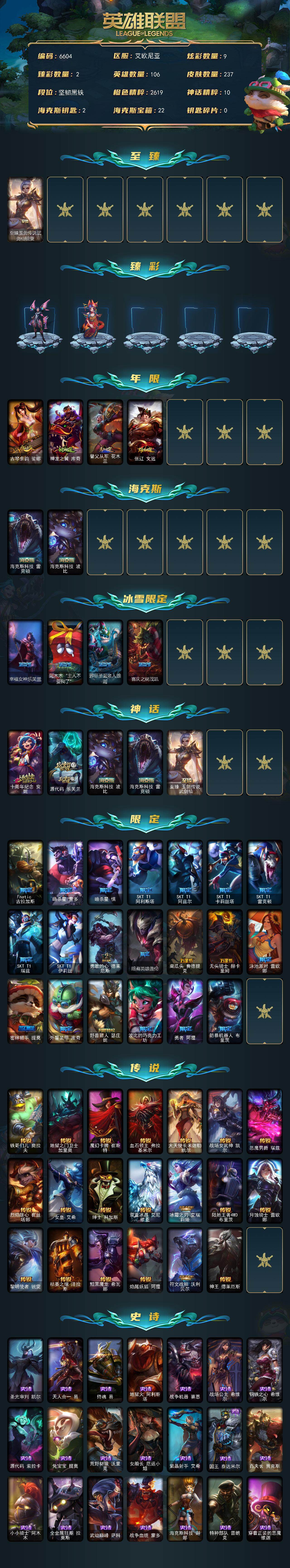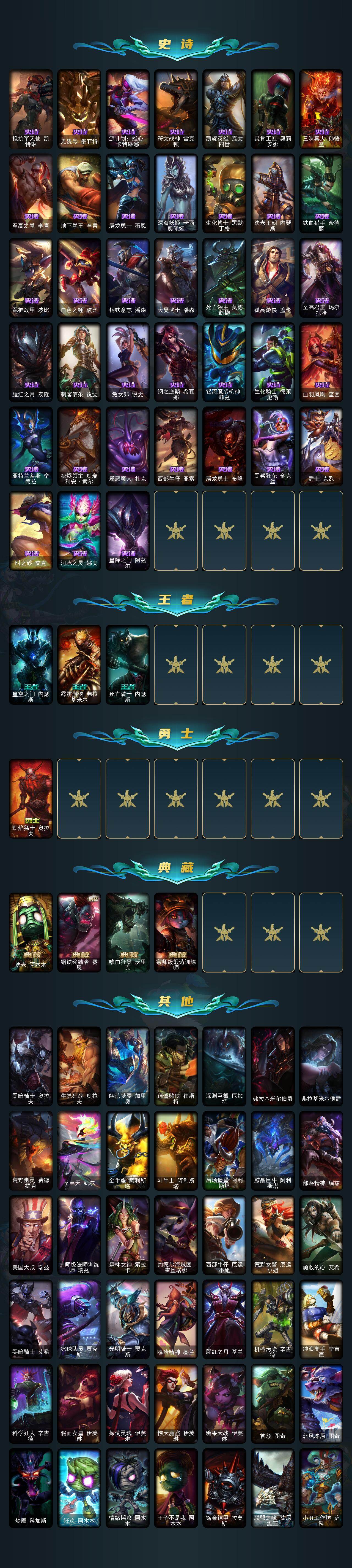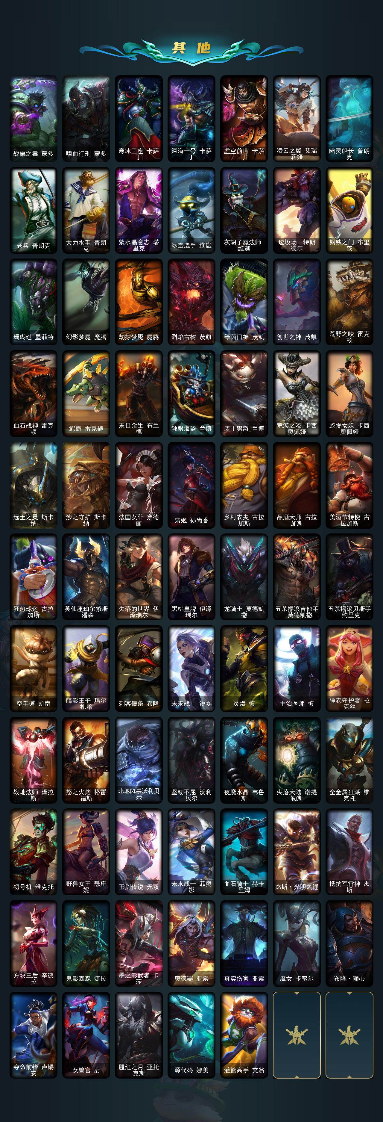 106英雄-237皮肤-106英雄/237皮肤/5神话/28限定/2臻彩/9炫彩/20传说/59史诗/未定级/十周年纪念 安妮/源代码 乐芙兰/海克斯科技 波比/海克斯科技 雷克顿/至臻 玉剑传说 武剑仙/至臻玉剑传说武剑仙锐雯/弹幕天使 卡莎 炽天使·勇敢/灵魂莲华 卡西奥佩娅 流火/古琴余韵 娑娜/神龙之翼 库奇/替父从军 花木兰/张辽 文远/幸福女神乐芙兰/阿木木“主人不要我了”/邪恶圣诞老人维迦/喜庆之树茂凯