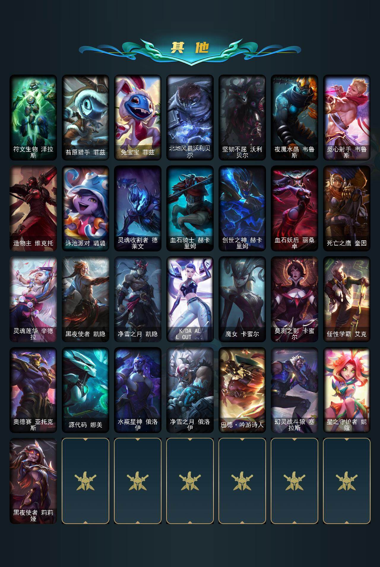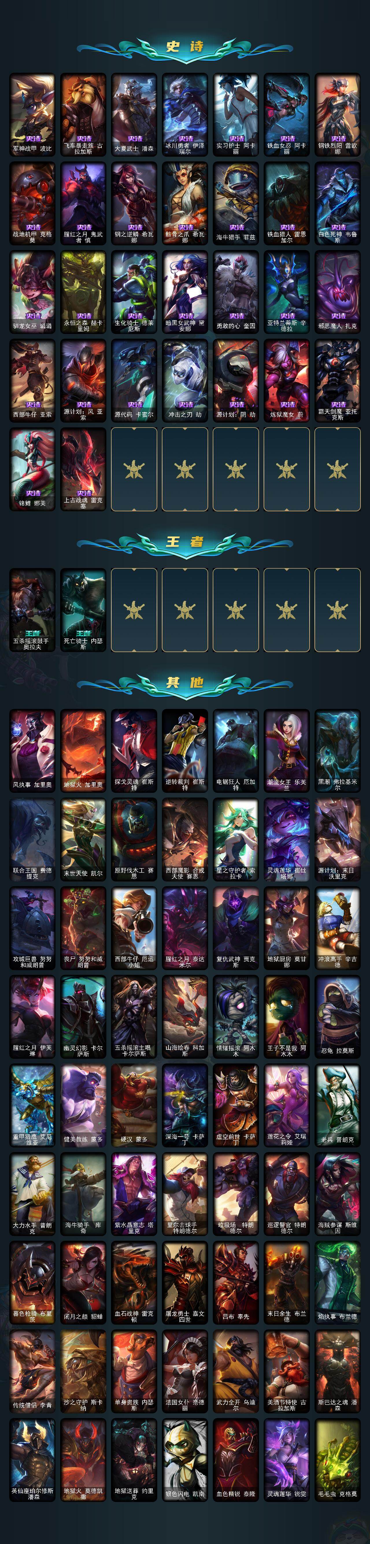 172英雄-197皮肤-172英雄/197皮肤/4神话/24限定/1臻彩/17炫彩/24传说/51史诗/未定级/十周年纪念 安妮/源代码 乐芙兰/神凰行者 瑞羽圣凰 艾尼维亚/海克斯科技 嘉文四世/无畏骑士 瑟庄妮 赤子初心/定海神珍 孙悟空/替父从军 花木兰/美猴王 孙悟空/天龙之子斯莫德/甜心宝贝 安妮/幸福女神乐芙兰/圣诞精灵崔丝塔娜/圣诞糖果棒 厄运小姐/邪恶圣诞老人维迦/魄罗骑士 瑟庄妮/诺斯费拉图 弗拉