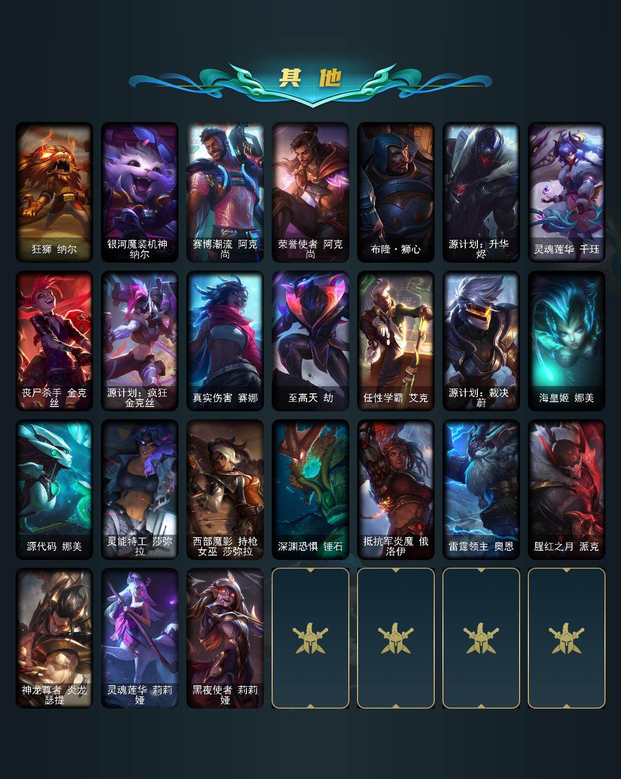 172英雄-374皮肤-172英雄/374皮肤/8神话/65限定/12臻彩/173炫彩/35传说/93史诗/未定级/十周年纪念 安妮/源代码 乐芙兰/十五周年纪念 希维尔/神凰行者 瑞羽圣凰 艾尼维亚/海克斯科技 嘉文四世/至臻 未来战士 卢锡安/至臻 战斗学院 拉克丝/至臻 战斗学院 拉克丝 2022/雪花头像/至臻战斗学院拉克丝2022/无畏骑士 瑟庄妮 赤子初心/冠军掠夺者 卡兹克 凯旋圣装/冠军之刃锐