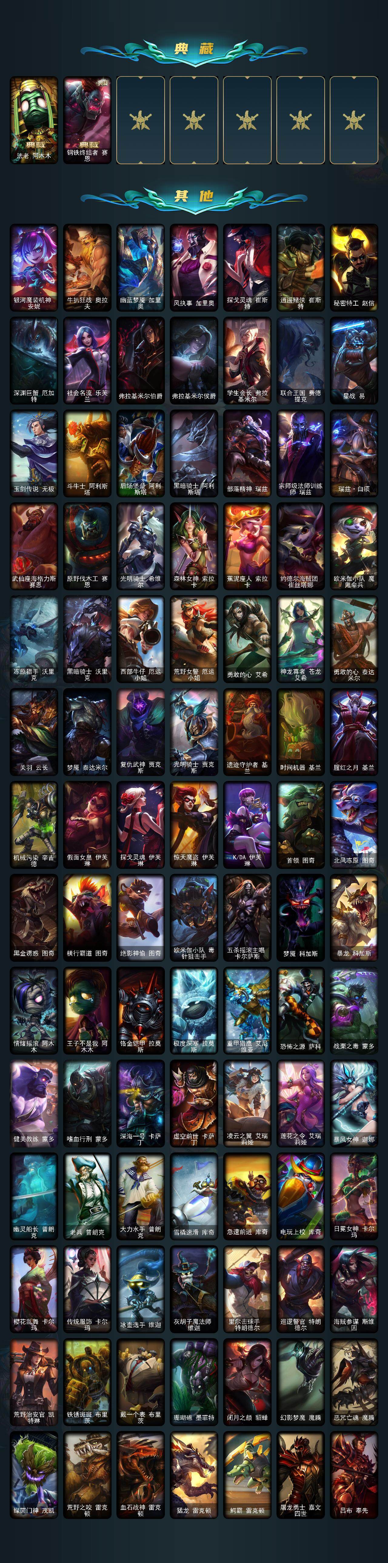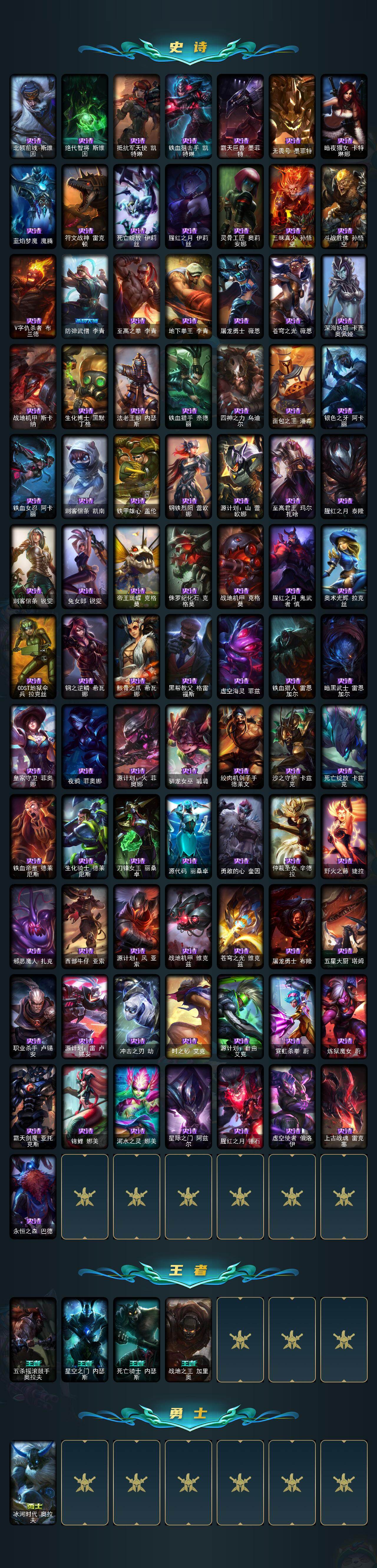 172英雄-451皮肤-172英雄/451皮肤/2终极/5神话/87限定/3臻彩/53炫彩/41传说/120史诗/未定级/十周年纪念 安妮/源代码 乐芙兰/殿堂传奇薇恩/恐惧新星 德莱厄斯/至臻 k/da all out 卡莎/冠军典狱长 锤石 凯旋圣装/霸天巨兽·雪崩 墨菲特/替父从军 花木兰/虎痴之拳 蔚/幸福女神乐芙兰/圣诞开心鬼提莫/圣诞精灵崔丝塔娜/圣诞狂欢努努和威朗普/圣诞糖果棒 厄运小姐/阿木木“主人不