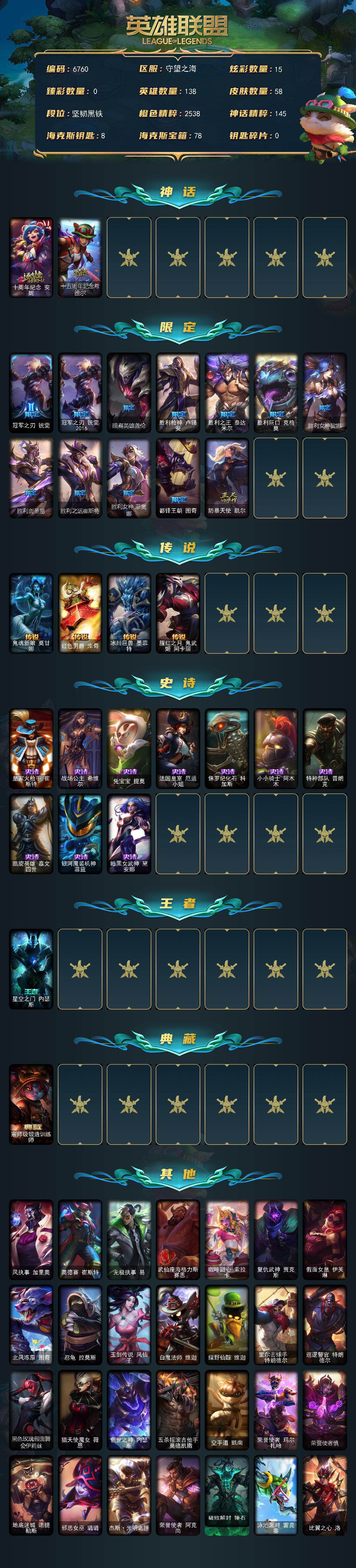 138英雄-58皮肤-138英雄/58皮肤/2神话/12限定/15炫彩/4传说/10史诗/未定级/十周年纪念 安妮/十五周年纪念 希维尔/冠军之刃 锐雯/冠军之刃 锐雯 2016/暗裔英雄盖伦/胜利呛神 卢锡安/胜利之王 泰达米尔/胜利巨口 克格莫/胜利女神娑娜/胜利剑圣易/胜利之运崔斯特/胜利女神菲奥娜/都铎王朝 图奇/防暴天使 凯尔/鬼魂新娘 莫甘娜/红色男爵 库奇/冰川巨兽 墨菲特/腥红之月 鬼武姬 阿卡丽/