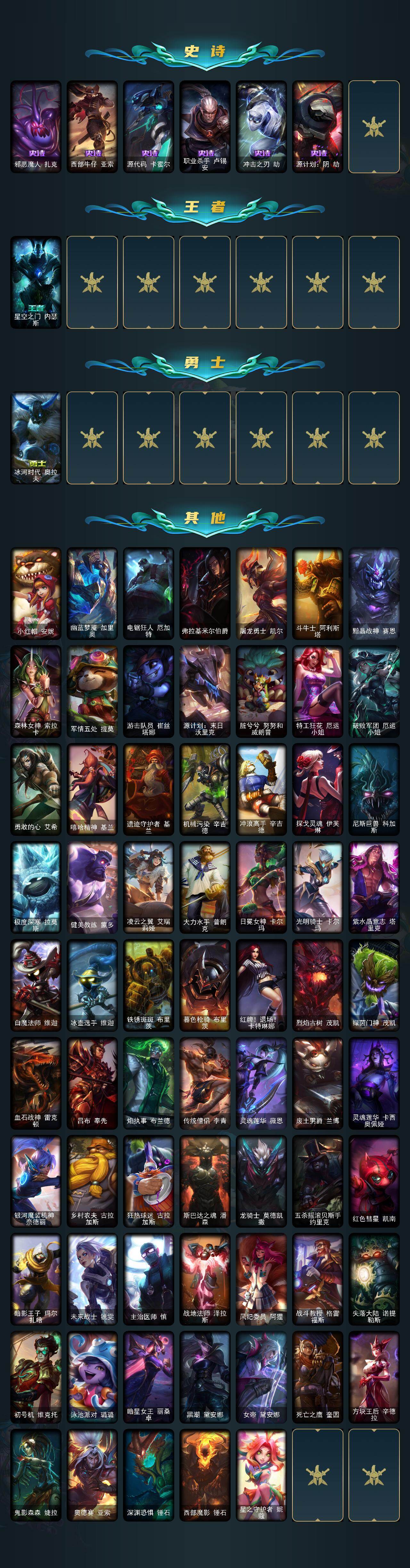 171英雄-141皮肤-171英雄/141皮肤/3神话/19限定/3臻彩/19炫彩/15传说/34史诗/白银/十周年纪念 安妮/源代码 乐芙兰/灰烬征服者 潘森/无畏骑士 瑟庄妮 赤子初心/征服者 阿利斯塔 炫金/可爱可爱粉红红 布里茨/天龙之子斯莫德/觅心猎手 薇恩/觅心猫猫 悠米/魄罗骑士 瑟庄妮/冠军之刃 锐雯/冠军之刃 锐雯 2016/fnatic 库奇/暗杀星 蒙多/skt t1 李青/ssw 图奇/f