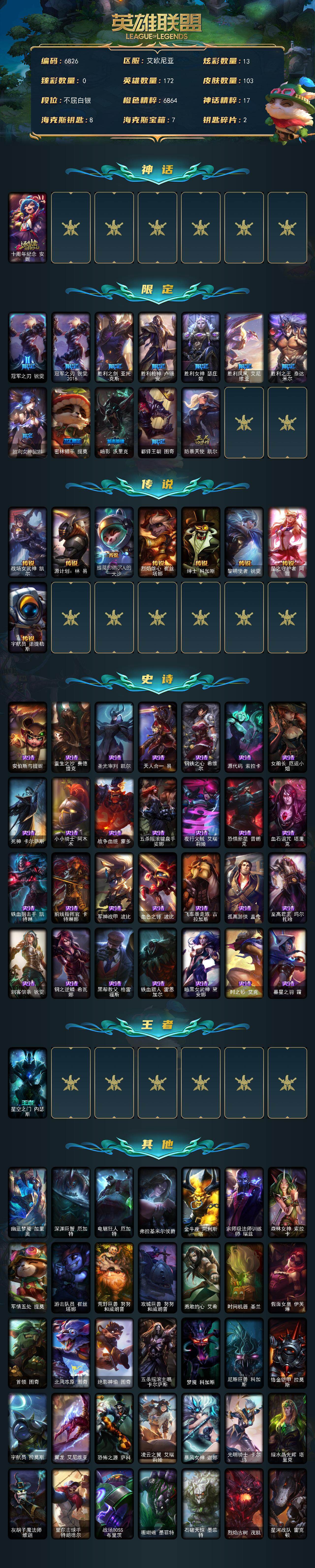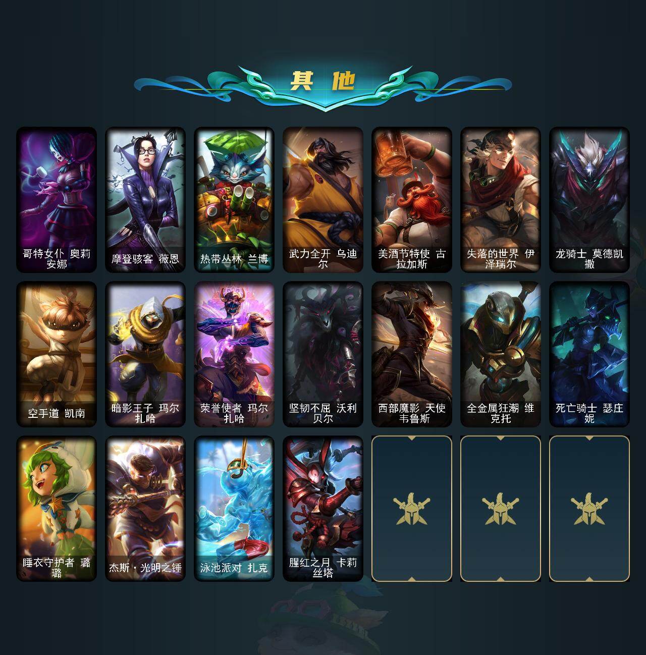 172英雄-103皮肤-172英雄/103皮肤/1神话/12限定/13炫彩/8传说/28史诗/白银/十周年纪念 安妮/冠军之刃 锐雯/冠军之刃 锐雯 2016/胜利之剑 亚托克斯/胜利呛神 卢锡安/胜利女神 瑟庄妮/胜利凤凰 艾尼维亚/胜利之王 泰达米尔/胜利女神娑娜/密林猎手 提莫/暗影 沃里克/都铎王朝 图奇/防暴天使 凯尔/战场女武神 凯尔/源计划:林 易/提莫:"约德尔人的一大步"/烈焰雄心 崔丝塔娜/绅士