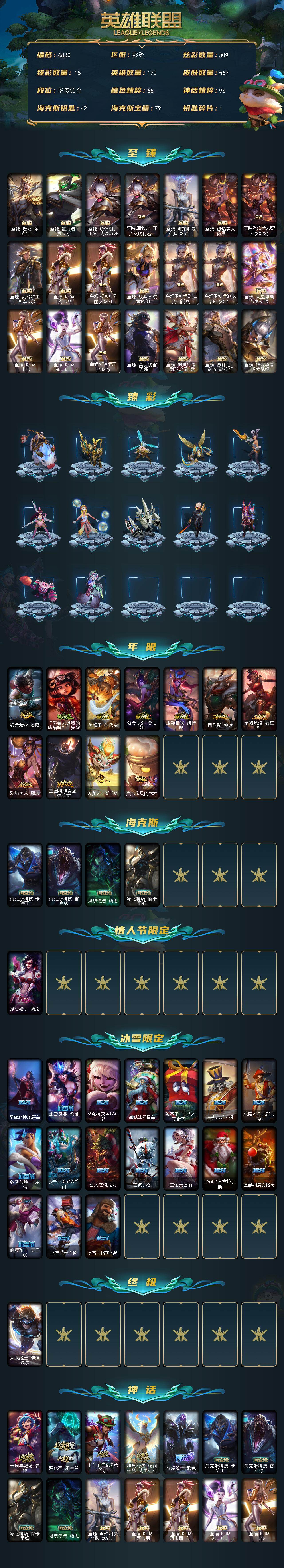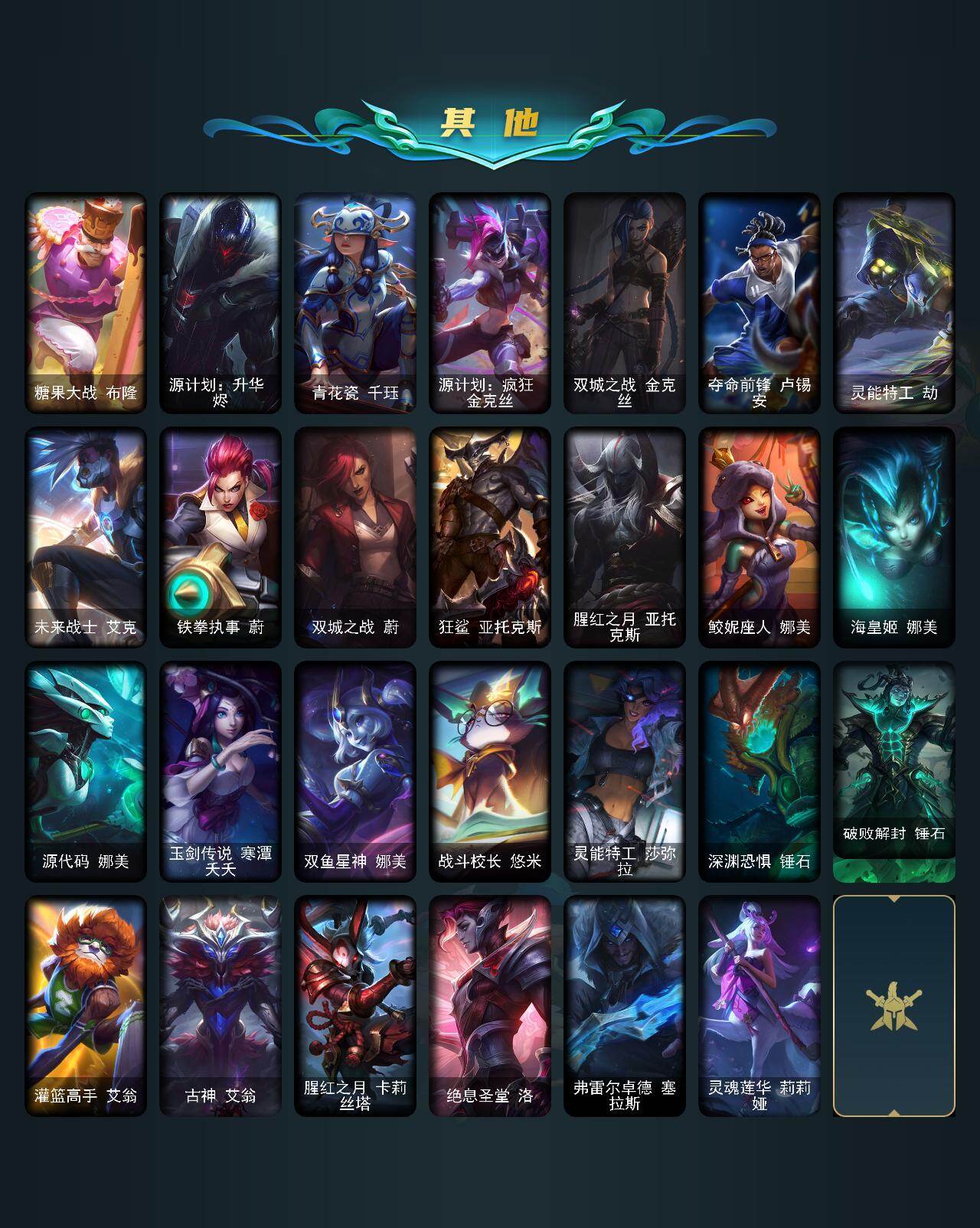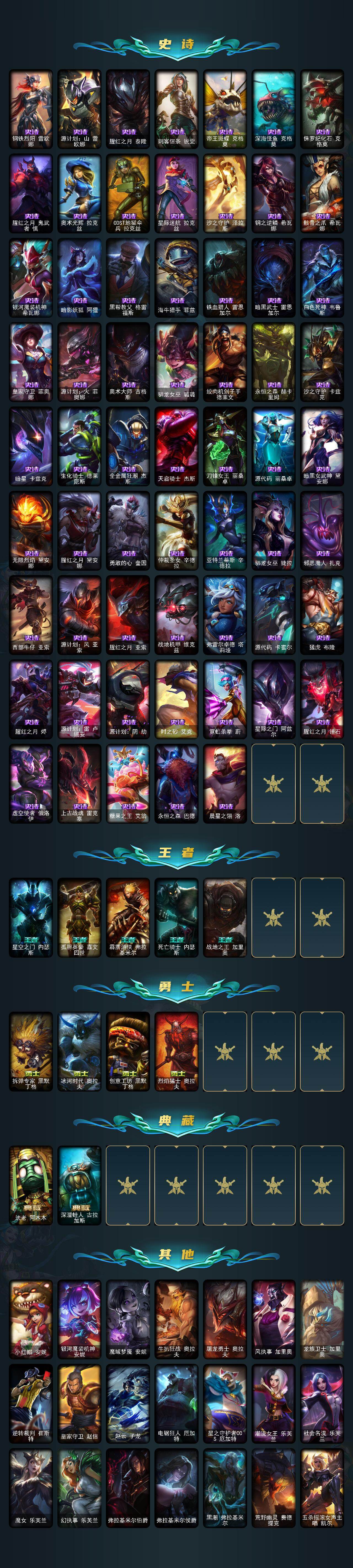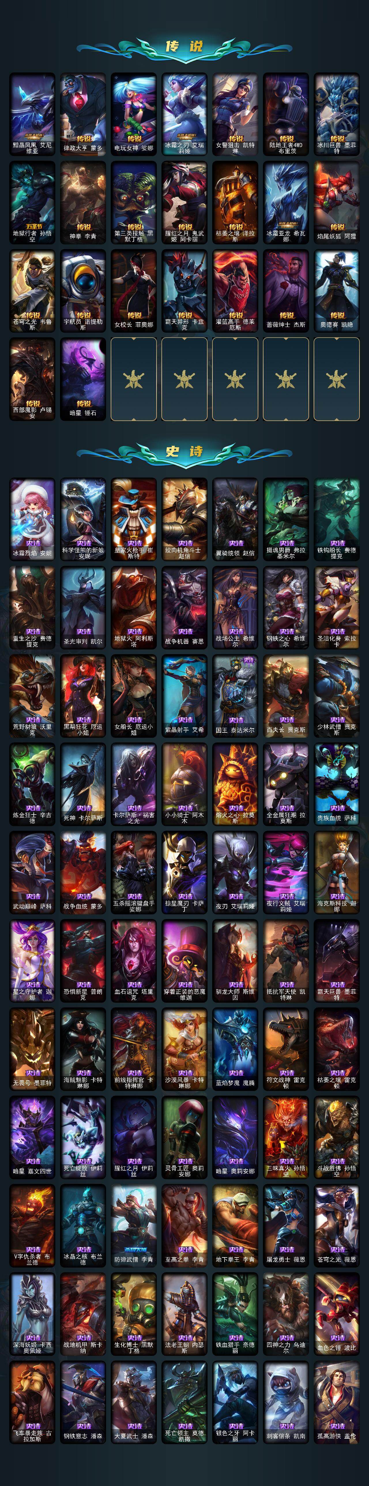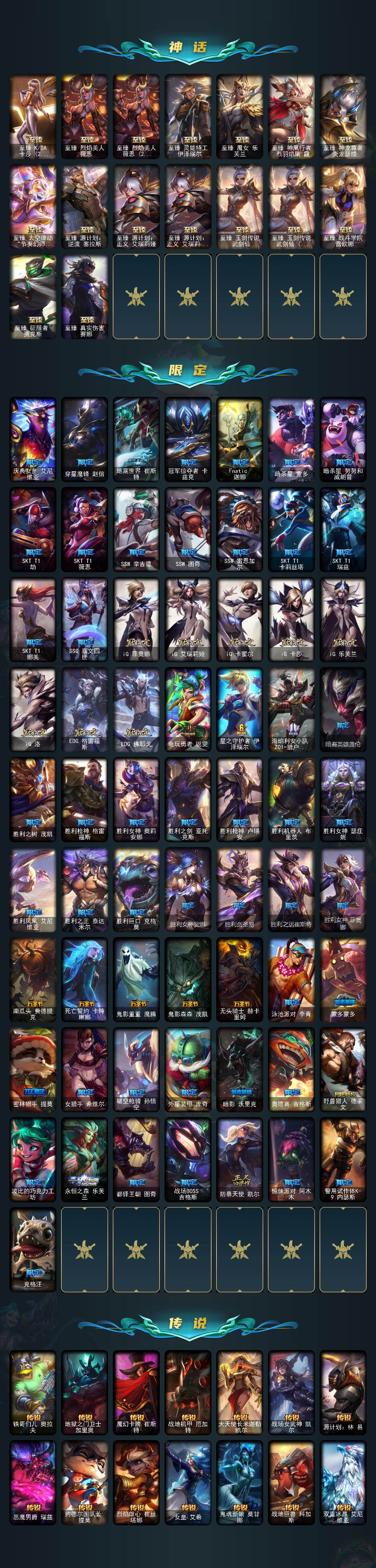 172英雄-569皮肤-172英雄/569皮肤/1终极/30神话/93限定/18臻彩/309炫彩/37传说/138史诗/铂金/十周年纪念 安妮/源代码 乐芙兰/十五周年纪念 希维尔/神凰行者 瑞羽圣凰 艾尼维亚/灰烬骑士 派克/海克斯科技 卡萨丁/海克斯科技 雷克顿/零之呛骑 赫卡里姆/摄魂使者 薇恩/至臻 征服者 贾克斯/至臻 真实伤害 赛娜/至臻 海珀利安小队 x09-星环灵风 迦娜/至臻 k/da 阿卡丽/至臻