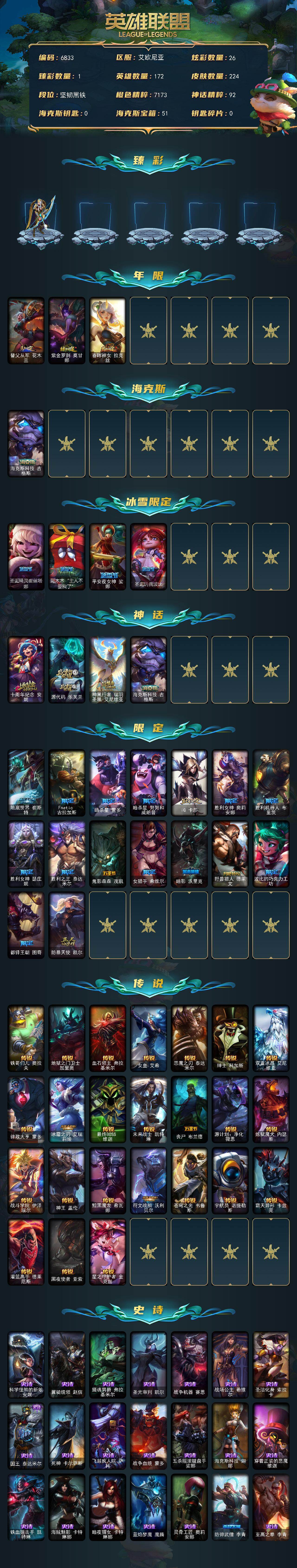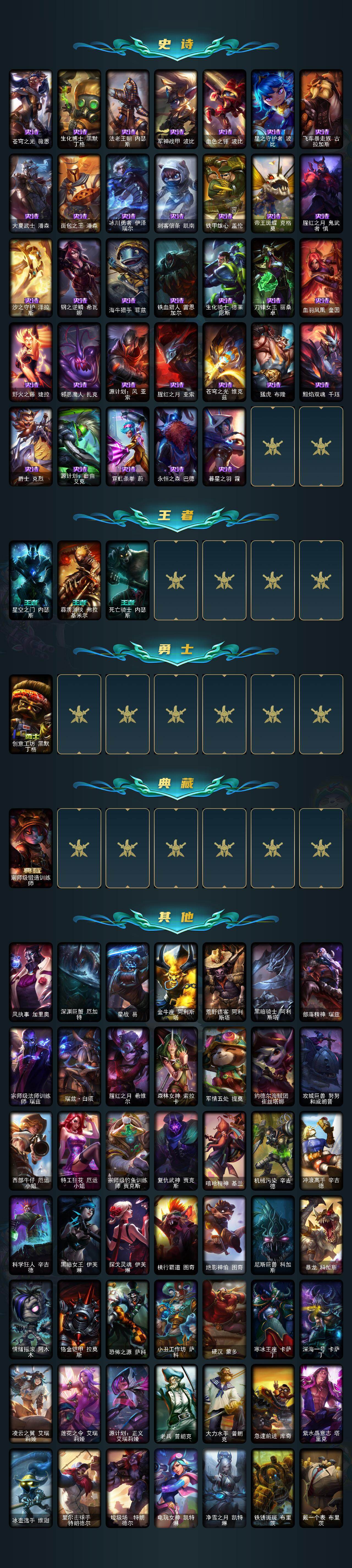 172英雄-224皮肤-172英雄/224皮肤/4神话/23限定/1臻彩/26炫彩/24传说/54史诗/未定级/十周年纪念 安妮/源代码 乐芙兰/神凰行者 瑞羽圣凰 艾尼维亚/海克斯科技 吉格斯/冠军之箭 艾希 凯旋圣装/替父从军 花木兰/紫金罗刹 莫甘娜/春晖神女 拉克丝/圣诞精灵崔丝塔娜/阿木木“主人不要我了”/平安夜女神 娑娜/圣诞玩偶波比/地底世界 崔斯特/fnatic 古拉加斯/暗杀星 蒙多/暗杀星 努努和