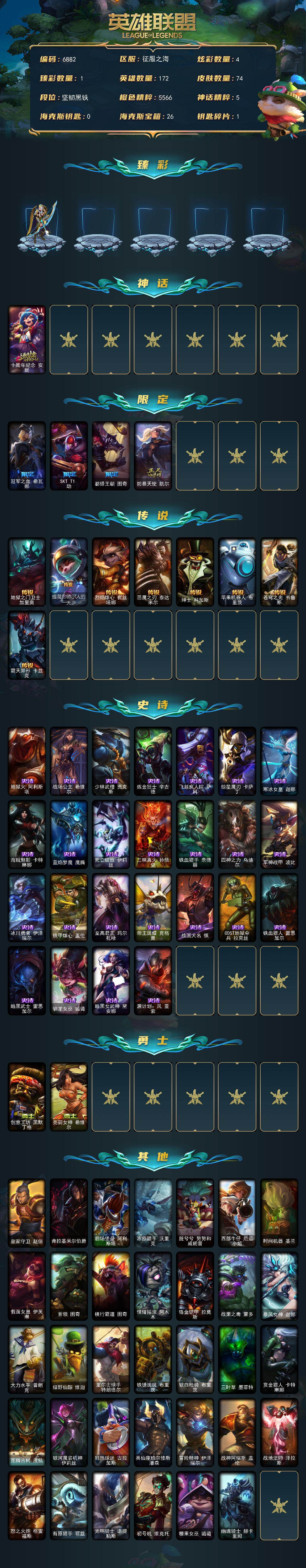 172英雄-74皮肤-172英雄/74皮肤/1神话/4限定/1臻彩/4炫彩/8传说/25史诗/未定级/十周年纪念 安妮/冠军之箭 艾希 凯旋圣装/冠军之血 希瓦娜/skt t1 劫/都铎王朝 图奇/防暴天使 凯尔/地狱之门卫士 加里奥/提莫:"约德尔人的一大步"/烈焰雄心 崔丝塔娜/恶魔之刃 泰达米尔/绅士 科加斯/苹果机器人 布里茨/苍穹之光 韦鲁斯/霸天异形 卡兹克/地狱火 阿利斯塔/战场公主 希维尔/少林武僧