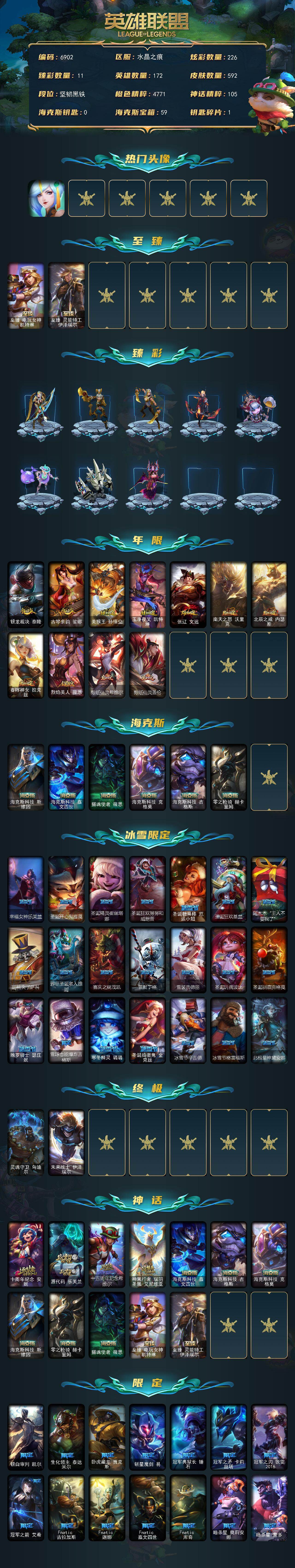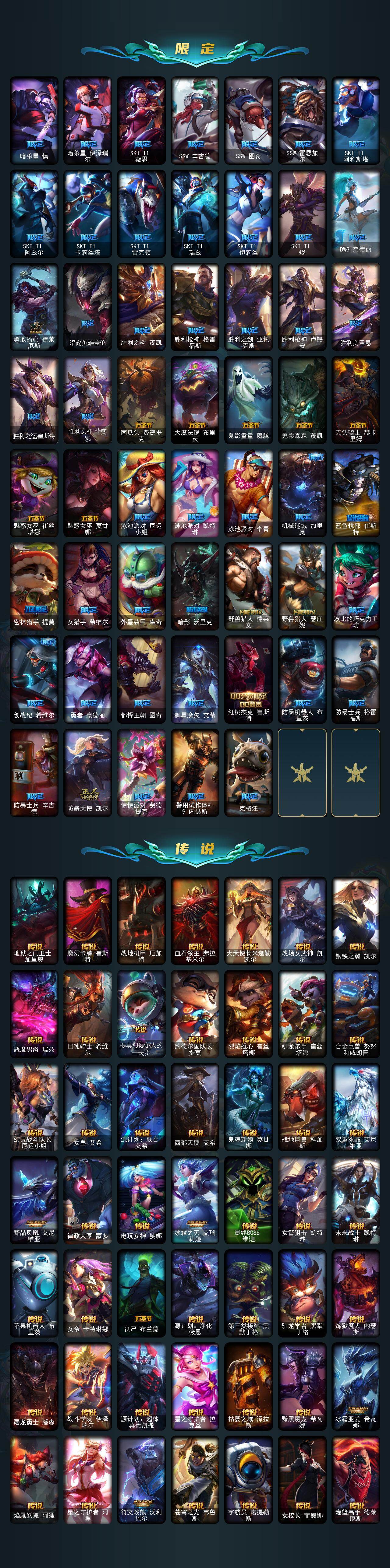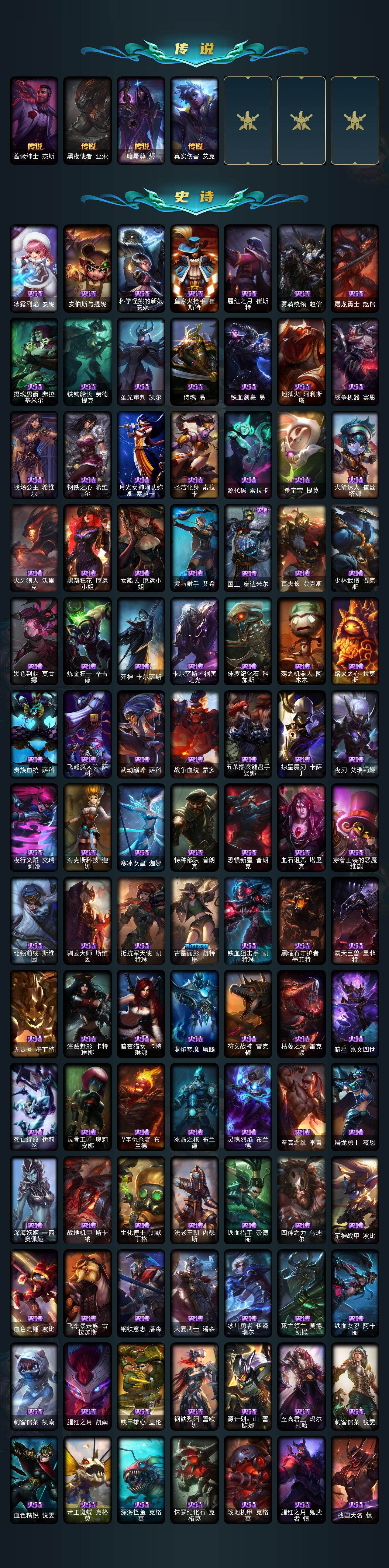172英雄-592皮肤-172英雄/592皮肤/2终极/12神话/101限定/11臻彩/226炫彩/53传说/150史诗/未定级/十周年纪念 安妮/源代码 乐芙兰/十五周年纪念 希维尔/神凰行者 瑞羽圣凰 艾尼维亚/海克斯科技 嘉文四世/海克斯科技 吉格斯/海克斯科技 克格莫/海克斯科技 斯维因/零之呛骑 赫卡里姆/摄魂使者 薇恩/至臻 电玩女神 凯特琳/至臻 灵能特工 伊泽瑞尔/春晖神女头像/春晖神女 拉克丝 流风