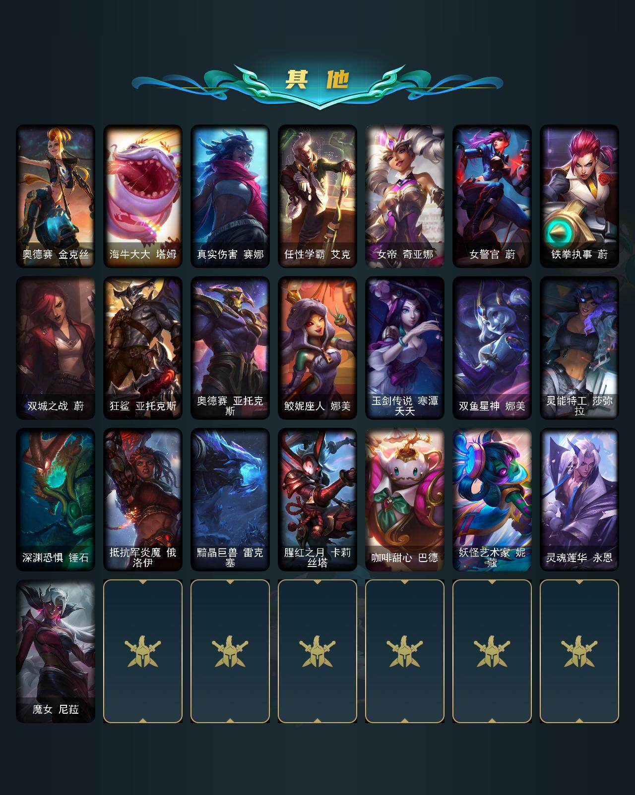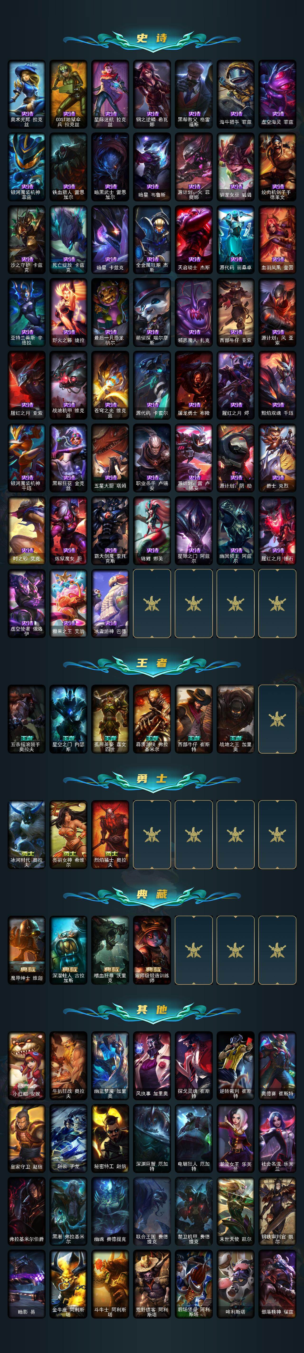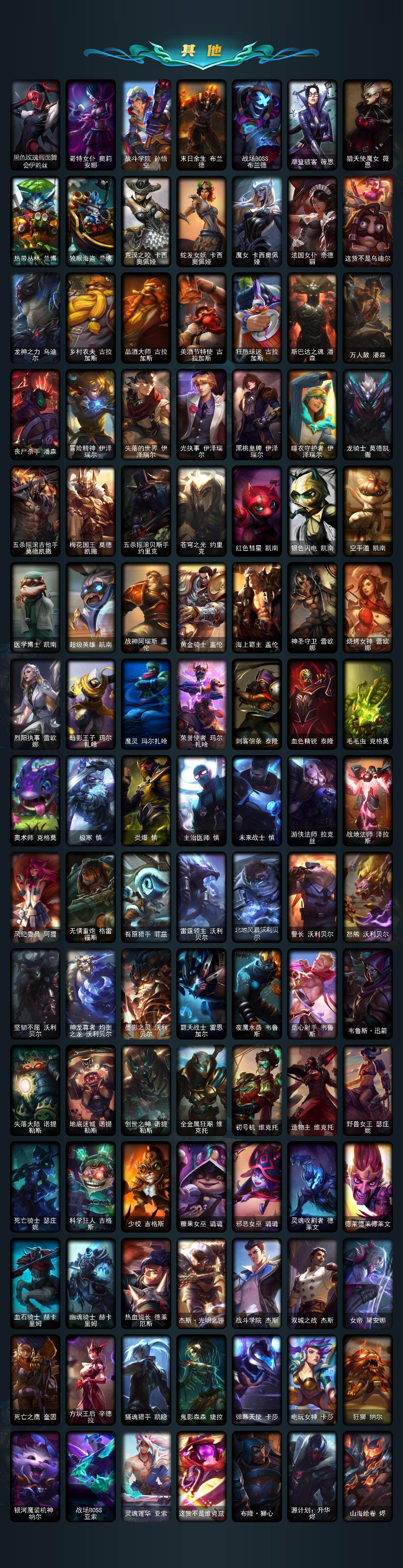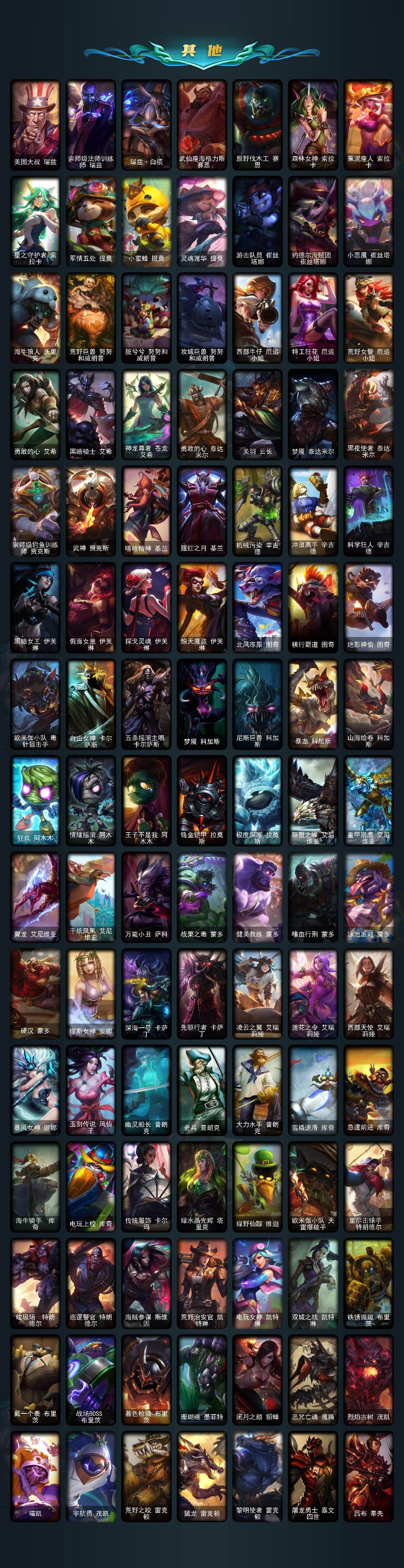 172英雄-592皮肤-172英雄/592皮肤/2终极/12神话/101限定/11臻彩/226炫彩/53传说/150史诗/未定级/十周年纪念 安妮/源代码 乐芙兰/十五周年纪念 希维尔/神凰行者 瑞羽圣凰 艾尼维亚/海克斯科技 嘉文四世/海克斯科技 吉格斯/海克斯科技 克格莫/海克斯科技 斯维因/零之呛骑 赫卡里姆/摄魂使者 薇恩/至臻 电玩女神 凯特琳/至臻 灵能特工 伊泽瑞尔/春晖神女头像/春晖神女 拉克丝 流风