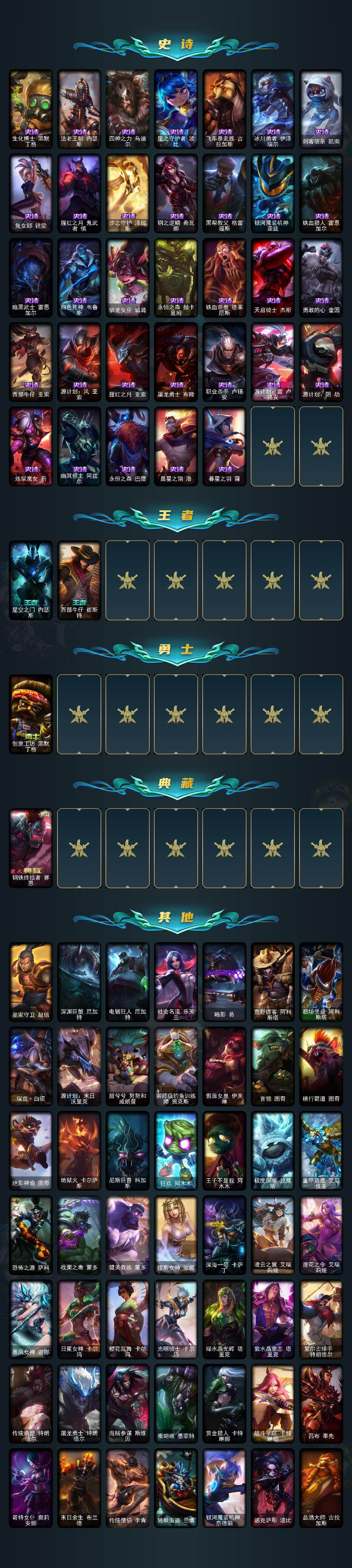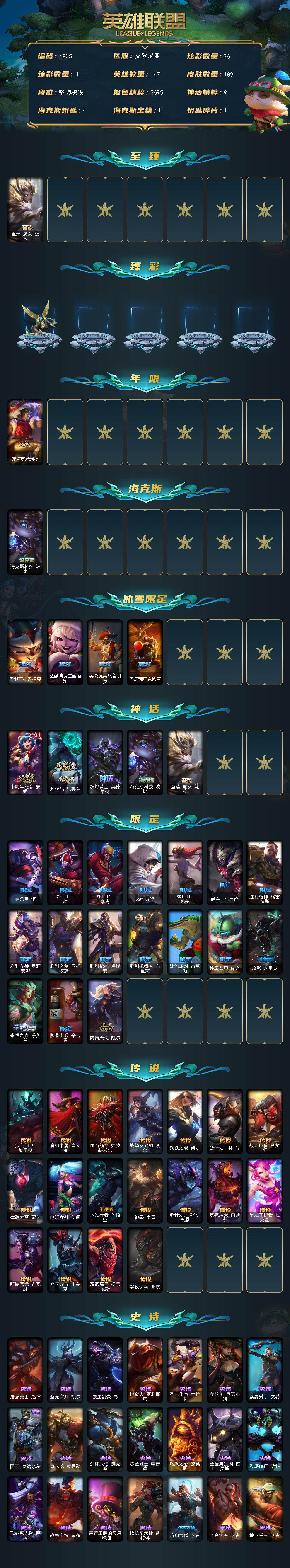 147英雄-189皮肤-147英雄/189皮肤/5神话/22限定/1臻彩/26炫彩/18传说/54史诗/未定级/十周年纪念 安妮/源代码 乐芙兰/灰烬骑士 莫德凯撒/海克斯科技 波比/至臻 魔女 婕拉/冠军掠夺者 卡兹克 凯旋圣装/龙腾虎跃瑟提/圣诞开心鬼提莫/圣诞精灵崔丝塔娜/英勇玩具兵普朗克/圣诞驯鹿克格莫/暗杀星 慎/skt t1 劫/skt t1 李青/ssw 泰隆/skt t1 娜美/暗裔英雄盖伦/胜利呛神