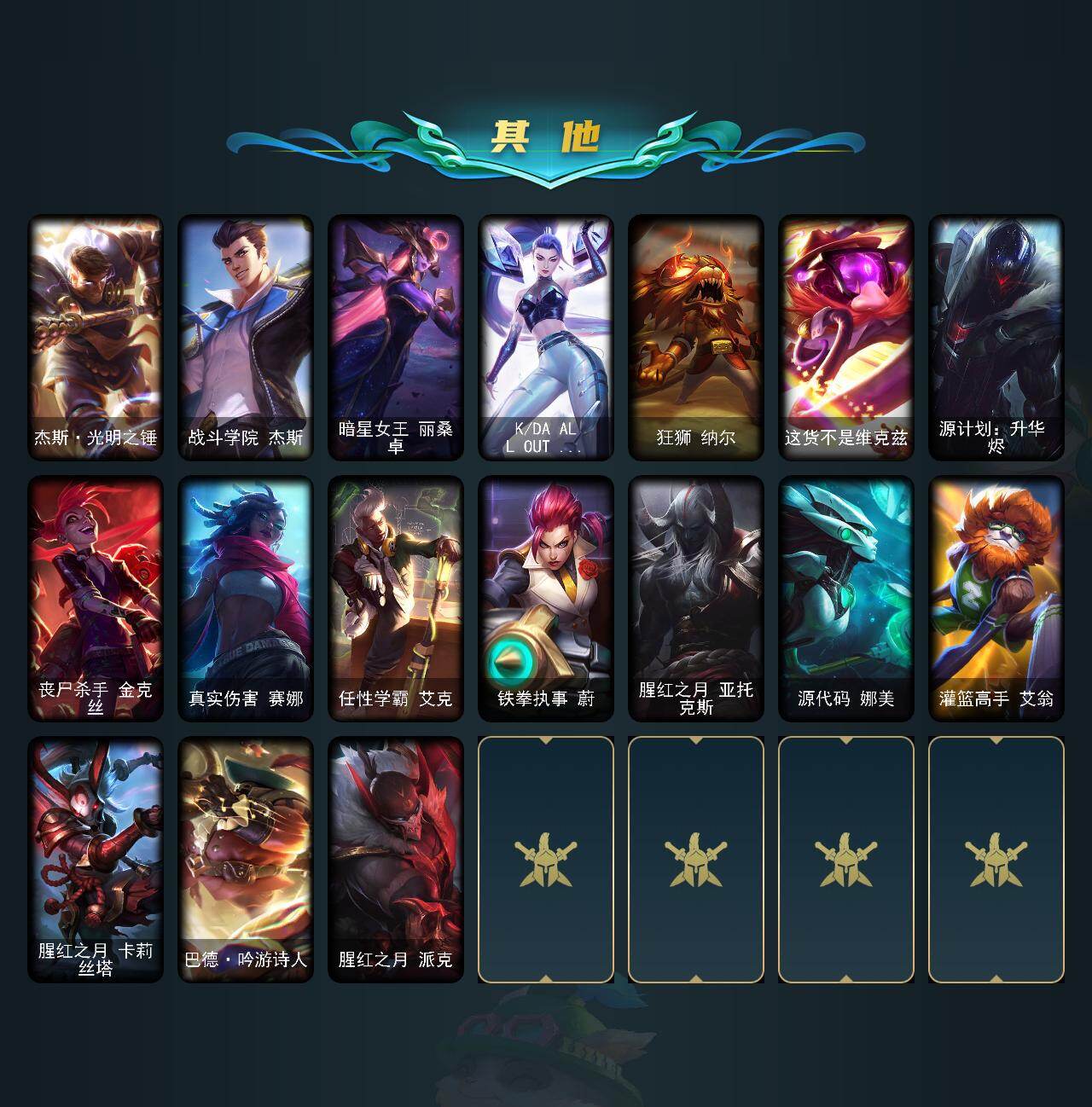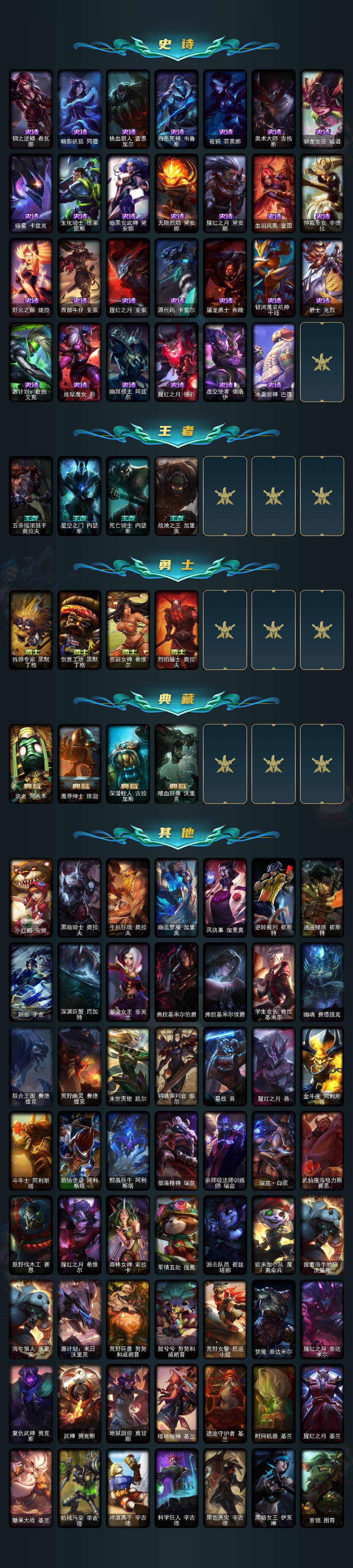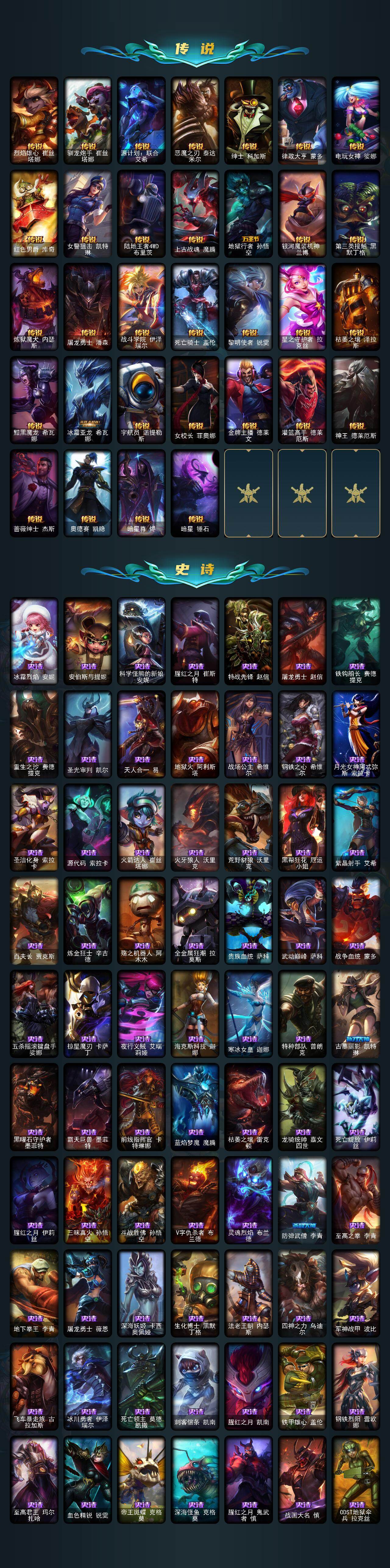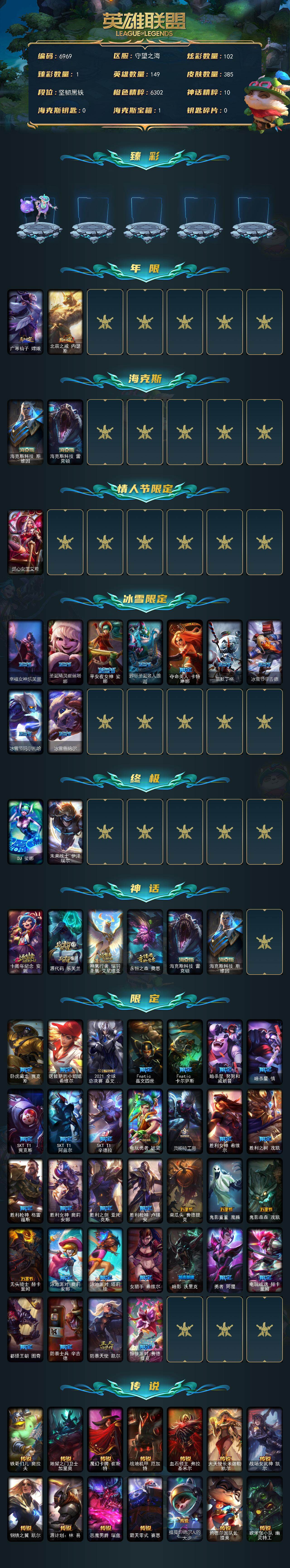 149英雄-385皮肤-149英雄/385皮肤/2终极/6神话/44限定/1臻彩/102炫彩/46传说/97史诗/未定级/十周年纪念 安妮/源代码 乐芙兰/神凰行者 瑞羽圣凰 艾尼维亚/永恒之森 奥恩/海克斯科技 雷克顿/海克斯科技 斯维因/泳池派对 奥莉安娜 优雅珠光鲸/广寒仙子 嫦娥/北辰之威 内瑟斯/觅心女王 艾希/幸福女神乐芙兰/圣诞精灵崔丝塔娜/平安夜女神 娑娜/邪恶圣诞老人维迦/夺命美人 卡特琳娜/雪默丁