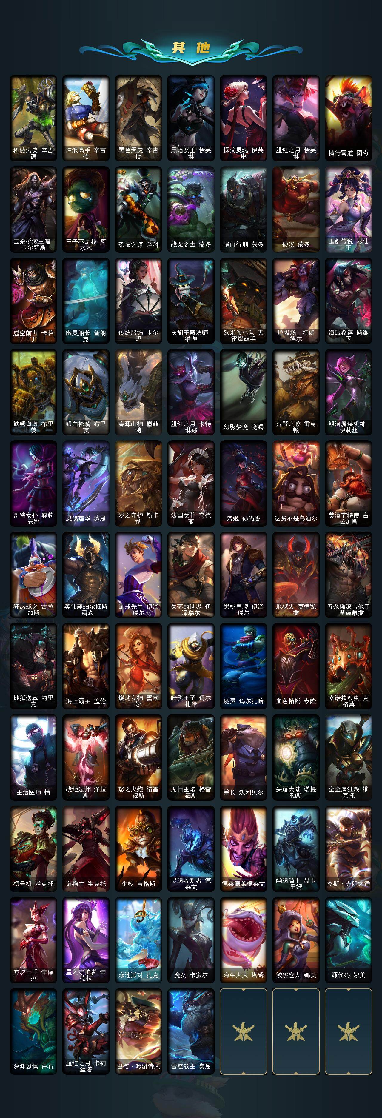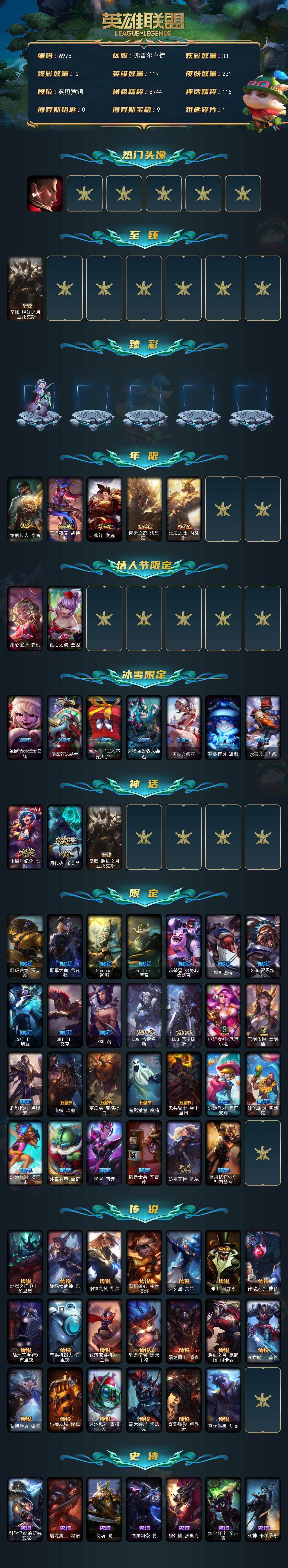 119英雄-231皮肤-119英雄/231皮肤/3神话/41限定/2臻彩/33炫彩/20传说/59史诗/青铜/十周年纪念 安妮/源代码 乐芙兰/至臻 腥红之月 亚托克斯/觅心游侠卢锡安头像/魔女 阿卡丽 虚荣/净雪之月 莫甘娜 冬虹/龙的传人 李青/玉净夜叉 凯特琳/张辽 文远/南天之怒 沃里克 /北辰之威 内瑟斯/甜心宝贝 安妮/觅心之翼 奎因/圣诞精灵崔丝塔娜/圣诞狂欢基兰/阿木木“主人不要我了”/邪恶圣诞老人维
