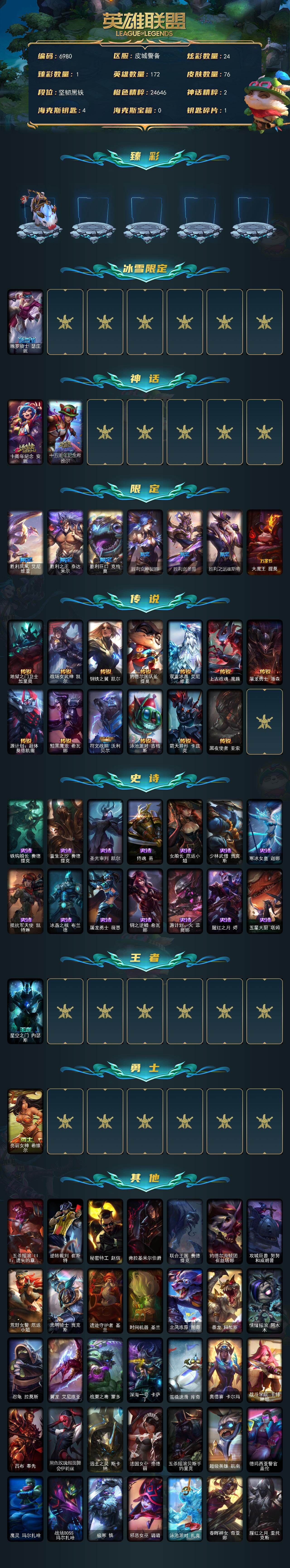 172英雄-76皮肤-172英雄/76皮肤/2神话/9限定/1臻彩/24炫彩/13传说/14史诗/未定级/十周年纪念 安妮/十五周年纪念 希维尔/无畏骑士 瑟庄妮 赤子初心/魄罗骑士 瑟庄妮/胜利凤凰 艾尼维亚/胜利之王 泰达米尔/胜利巨口 克格莫/胜利女神娑娜/胜利剑圣易/胜利之运崔斯特/大魔王 提莫/地狱之门卫士 加里奥/战场女武神 凯尔/钢铁之翼 凯尔/约德尔国队长 提莫/双重冰晶 艾尼维亚/上古战魂 魔腾/