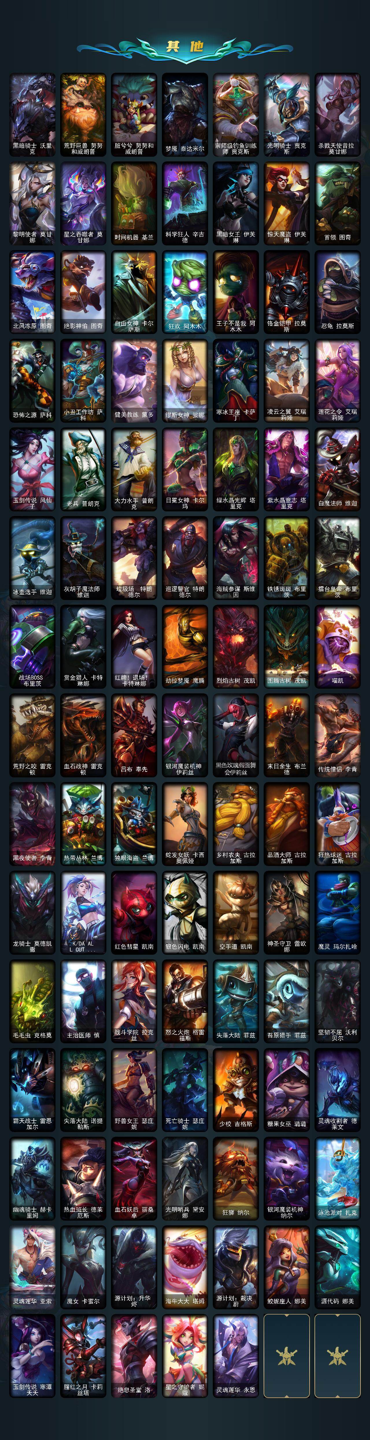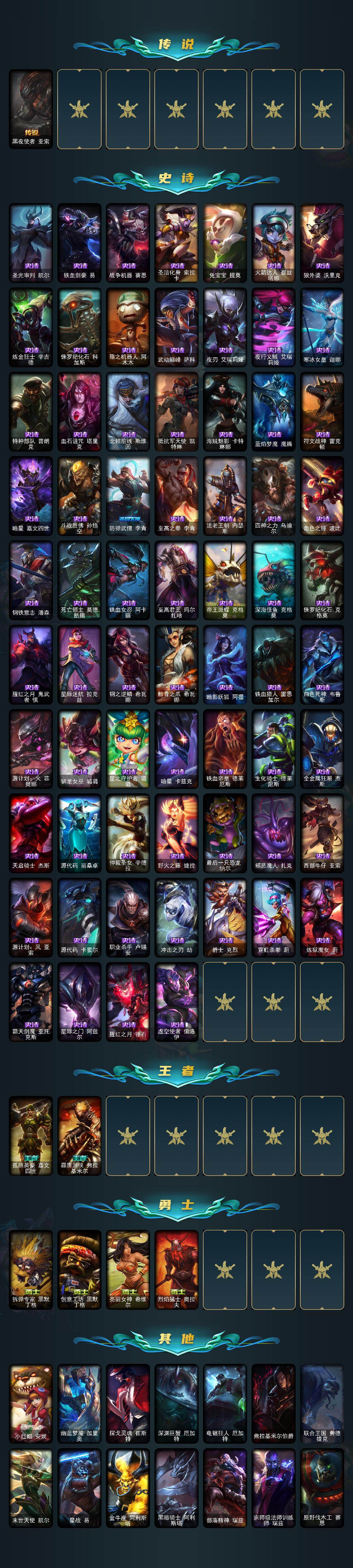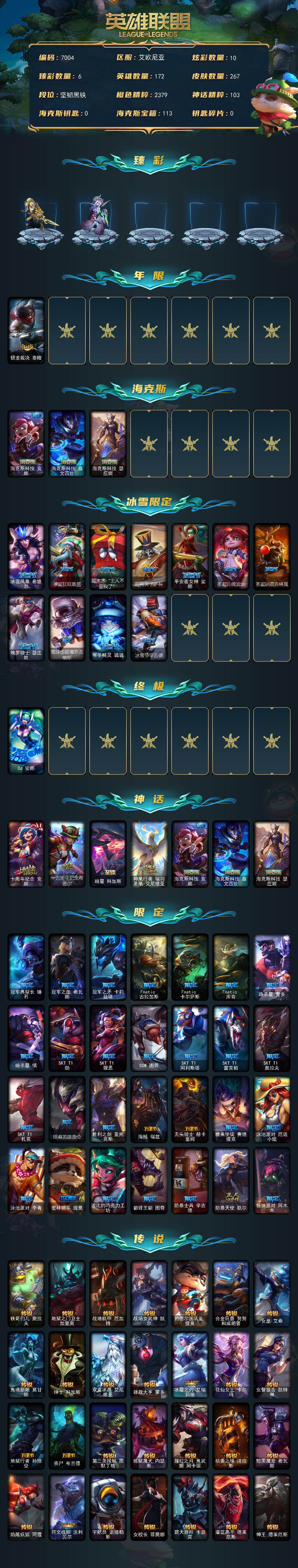 172英雄-267皮肤-172英雄/267皮肤/1终极/7神话/40限定/6臻彩/10炫彩/29传说/67史诗/未定级/十周年纪念 安妮/十五周年纪念 希维尔/暗星 科加斯/神凰行者 瑞羽圣凰 艾尼维亚/海克斯科技 安妮/海克斯科技 嘉文四世/海克斯科技 瑟庄妮/赵云 子龙 炫金将军/灵魂莲华亚索霜见之时/星之守护者阿卡丽热情之光/魔女 阿卡丽 虚荣/净雪之月 莫甘娜 冬虹/红莲之刃锐雯/银龙裁决 泰隆/冰雪风暴 希