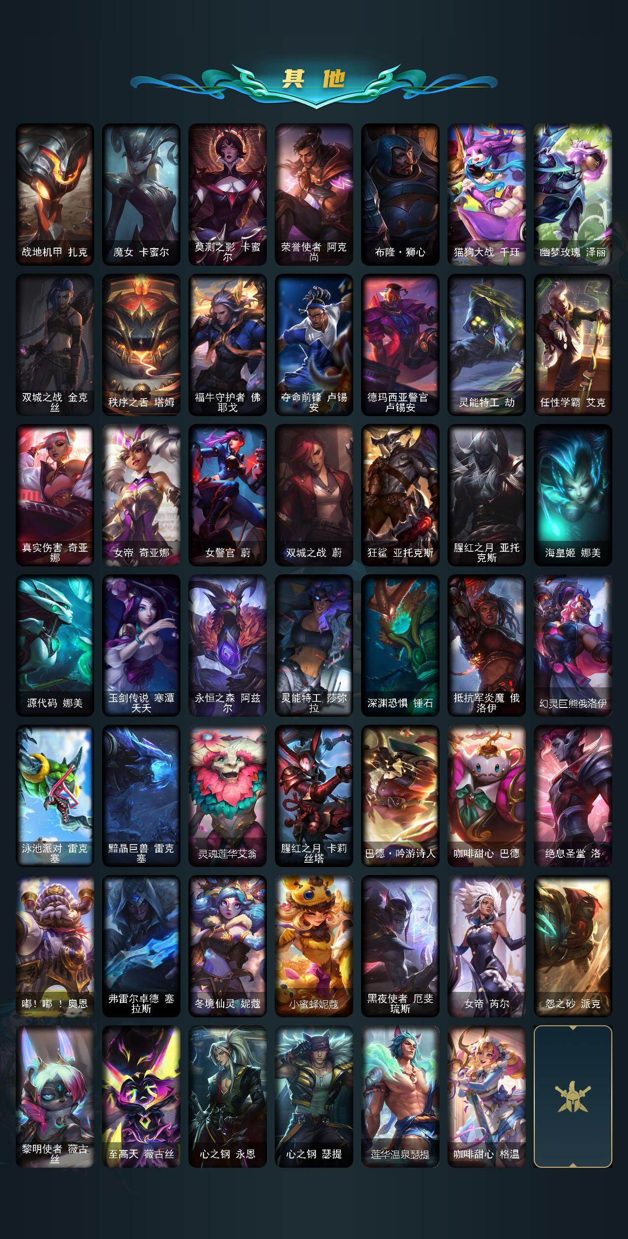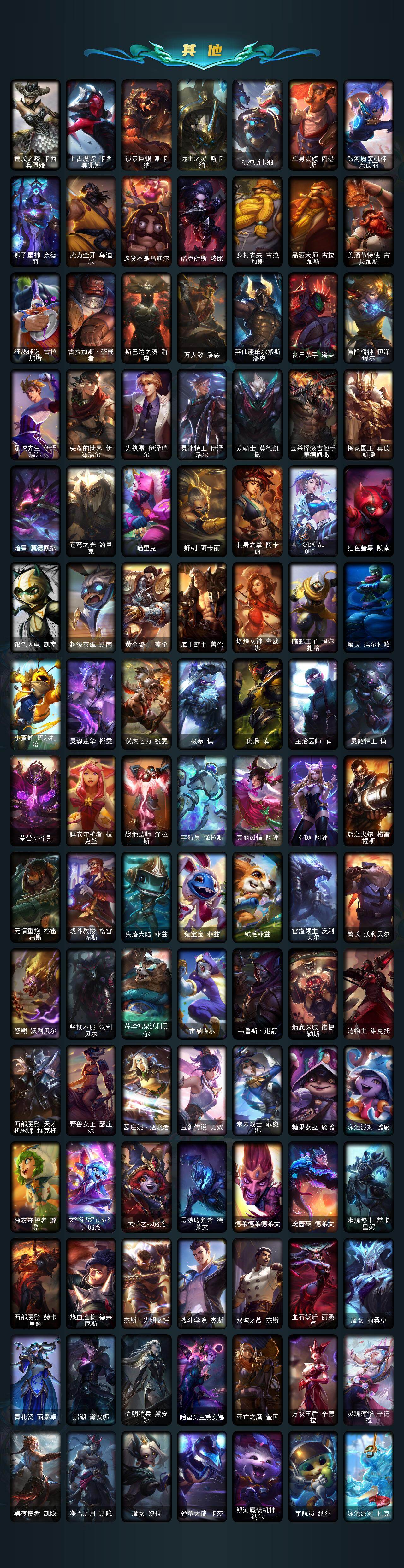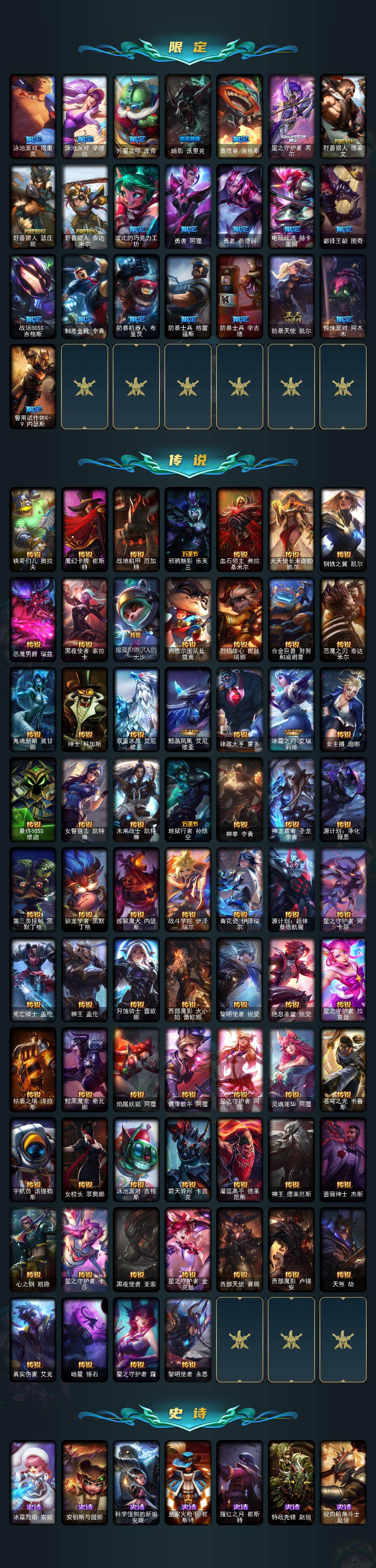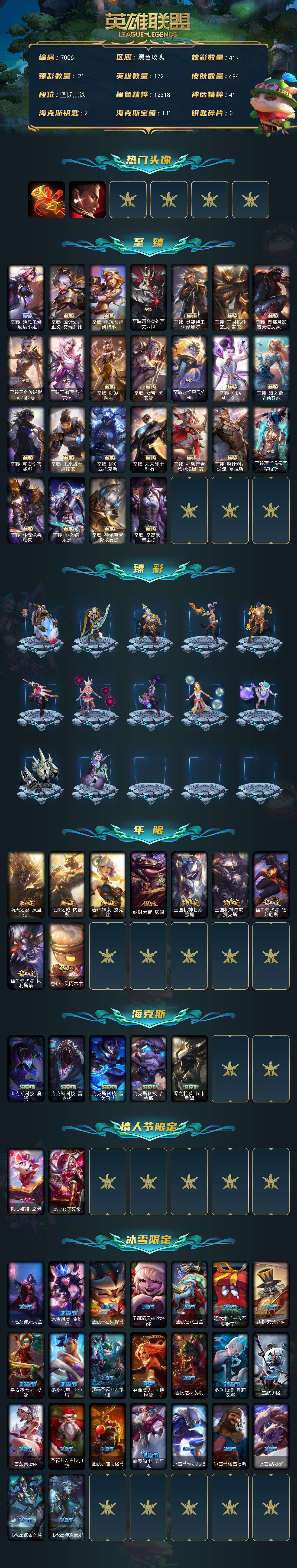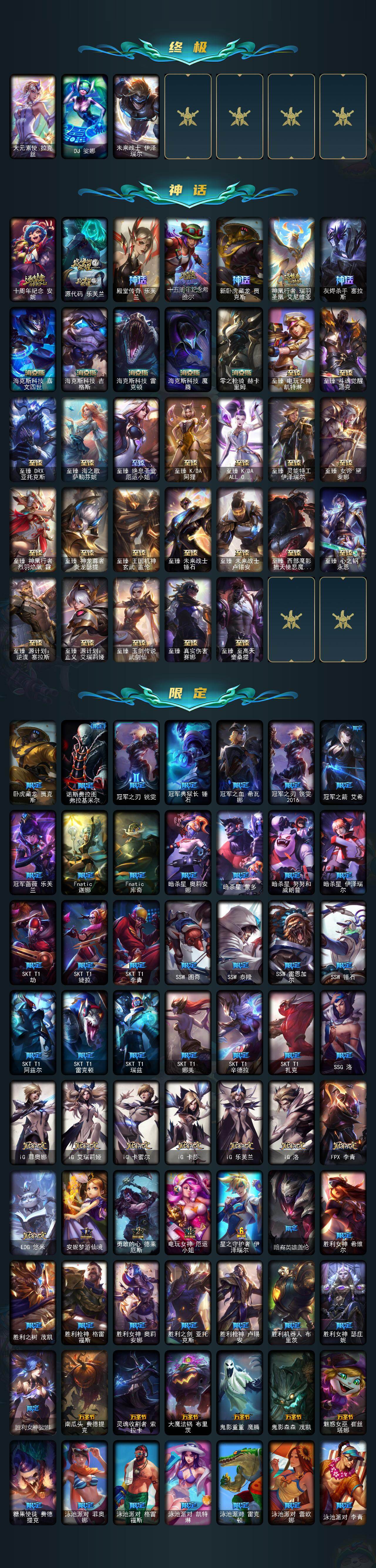172英雄-694皮肤-172英雄/694皮肤/3终极/37神话/119限定/21臻彩/419炫彩/67传说/140史诗/未定级/十周年纪念 安妮/源代码 乐芙兰/殿堂传奇 乐芙兰/十五周年纪念 希维尔/新卧虎藏龙 贾克斯/神凰行者 瑞羽圣凰 艾尼维亚/灰烬杀手 塞拉斯/海克斯科技 嘉文四世/海克斯科技 吉格斯/海克斯科技 雷克顿/海克斯科技 魔腾/零之呛骑 赫卡里姆/至臻 真实伤害 赛娜/至臻 至高天 奎桑提/至臻