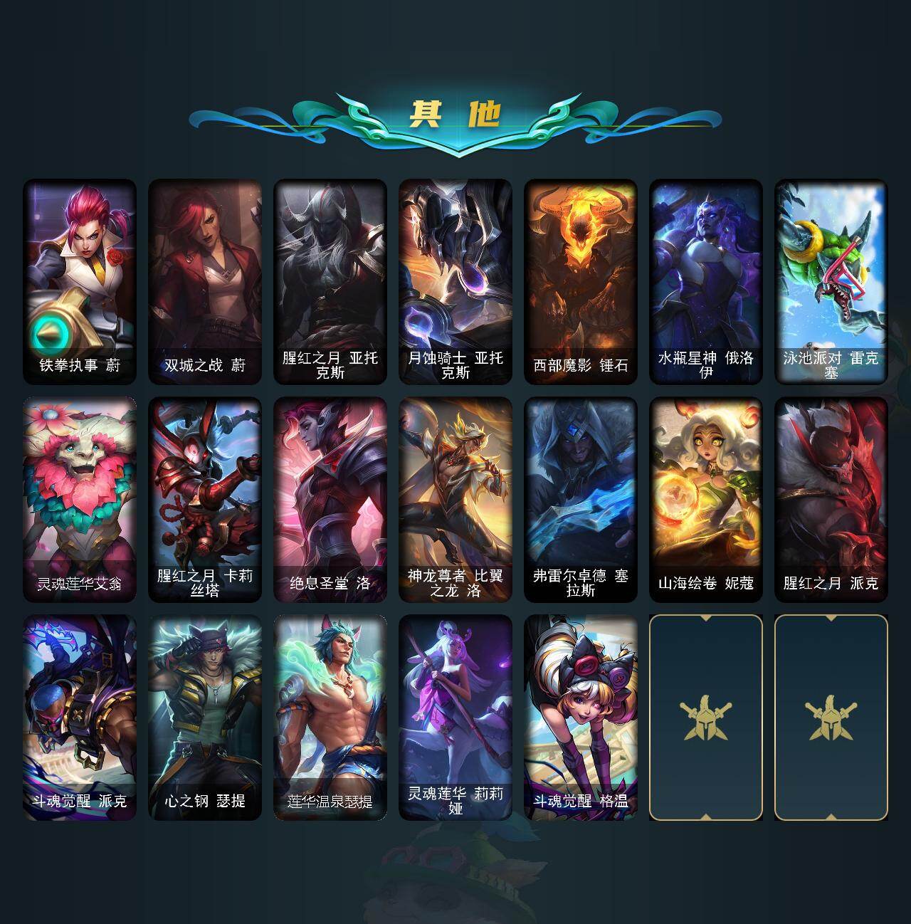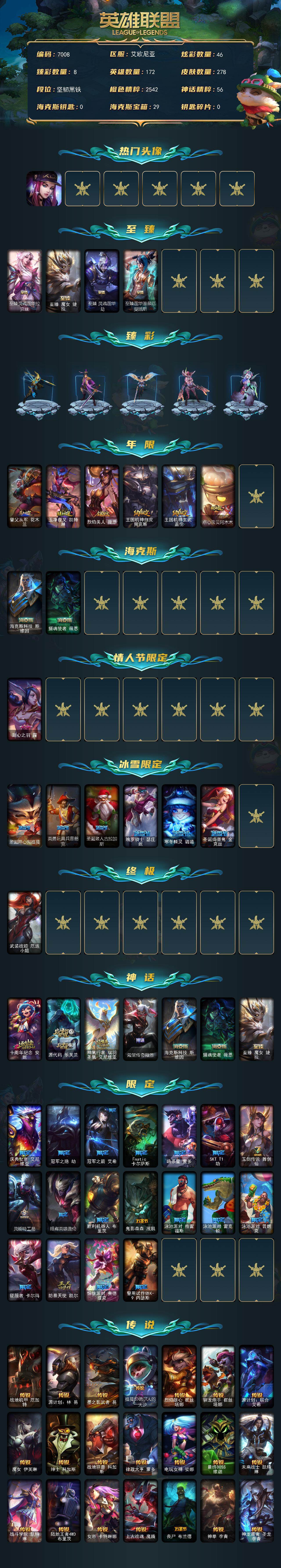 172英雄-278皮肤-172英雄/278皮肤/1终极/10神话/31限定/8臻彩/46炫彩/41传说/46史诗/未定级/十周年纪念 安妮/源代码 乐芙兰/神凰行者 瑞羽圣凰 艾尼维亚/殿堂传奇薇恩/海克斯科技 斯维因/摄魂使者 薇恩/至臻 魔女 婕拉/kda阿卡丽头像/至臻灵魂莲华拉克丝/至臻灵魂莲华劫/至臻莲华温泉厄斐琉斯/冠军之矛 卡莉丝塔 凯旋圣装/玉剑传说 无极 麒麟/玉剑传说 翼剑仙 珠光/幻灵战斗蝠薇恩