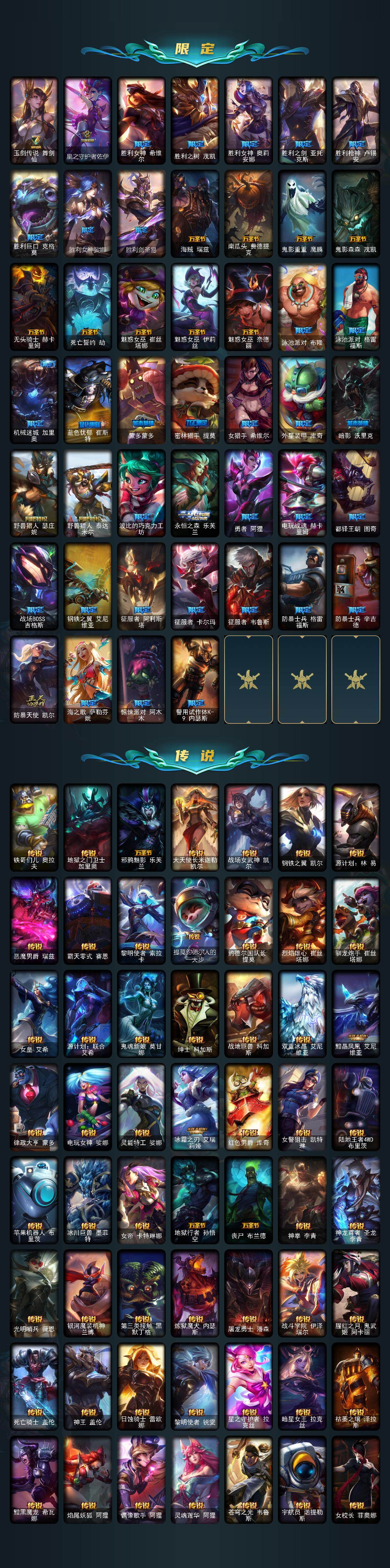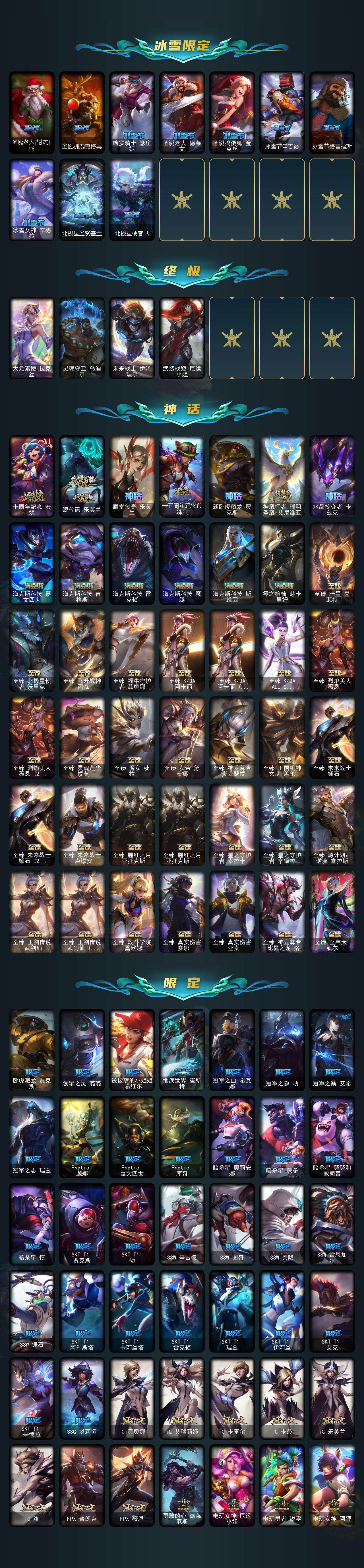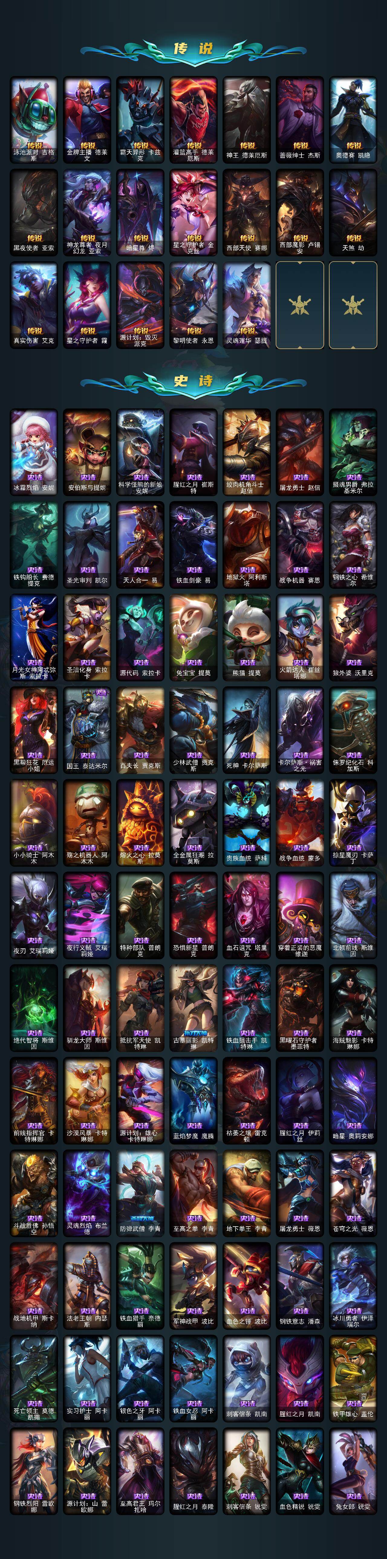 172英雄-697皮肤-172英雄/697皮肤/4终极/42神话/134限定/19臻彩/253炫彩/75传说/147史诗/未定级/十周年纪念 安妮/源代码 乐芙兰/殿堂传奇 乐芙兰/十五周年纪念 希维尔/新卧虎藏龙 贾克斯/神凰行者 瑞羽圣凰 艾尼维亚/水晶掠夺者 卡兹克/海克斯科技 嘉文四世/海克斯科技 吉格斯/海克斯科技 雷克顿/海克斯科技 魔腾/海克斯科技 斯维因/零之呛骑 赫卡里姆/至臻 真实伤害 赛娜/至臻