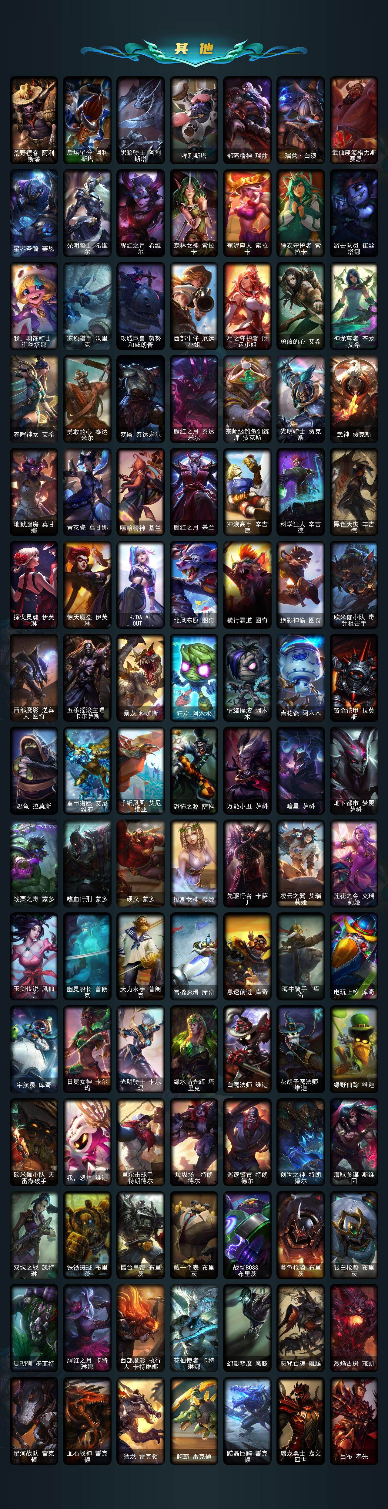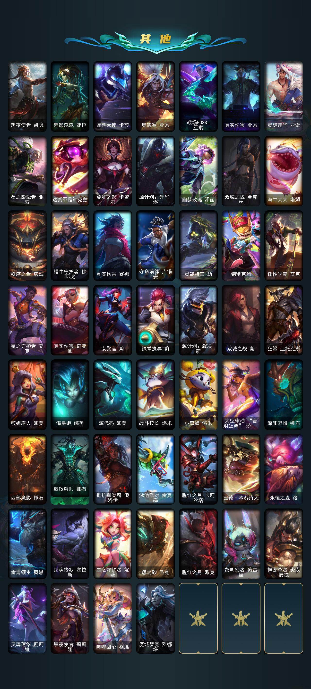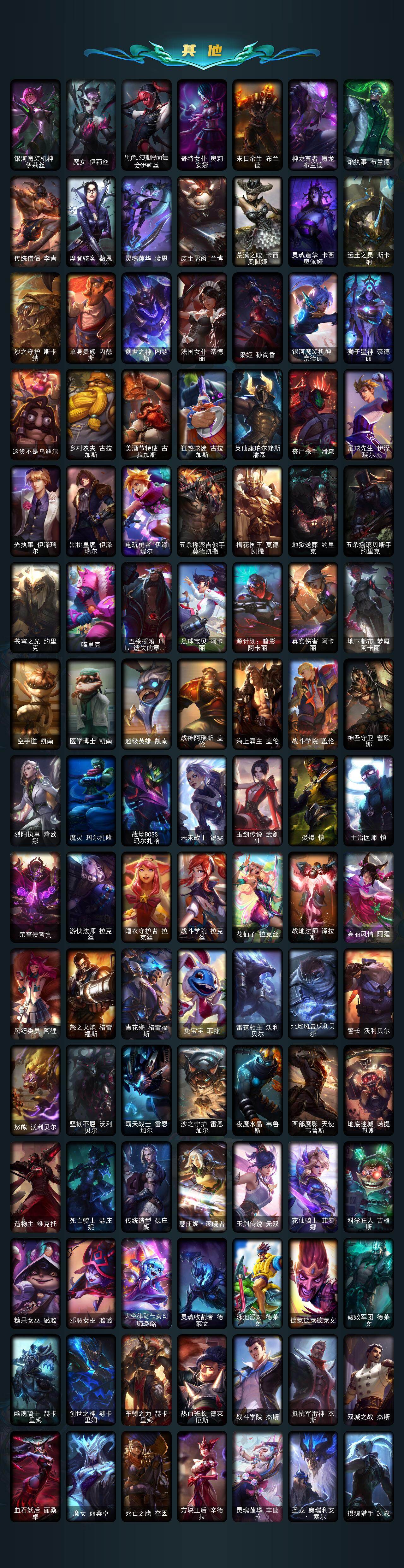 172英雄-697皮肤-172英雄/697皮肤/4终极/42神话/134限定/19臻彩/253炫彩/75传说/147史诗/未定级/十周年纪念 安妮/源代码 乐芙兰/殿堂传奇 乐芙兰/十五周年纪念 希维尔/新卧虎藏龙 贾克斯/神凰行者 瑞羽圣凰 艾尼维亚/水晶掠夺者 卡兹克/海克斯科技 嘉文四世/海克斯科技 吉格斯/海克斯科技 雷克顿/海克斯科技 魔腾/海克斯科技 斯维因/零之呛骑 赫卡里姆/至臻 真实伤害 赛娜/至臻