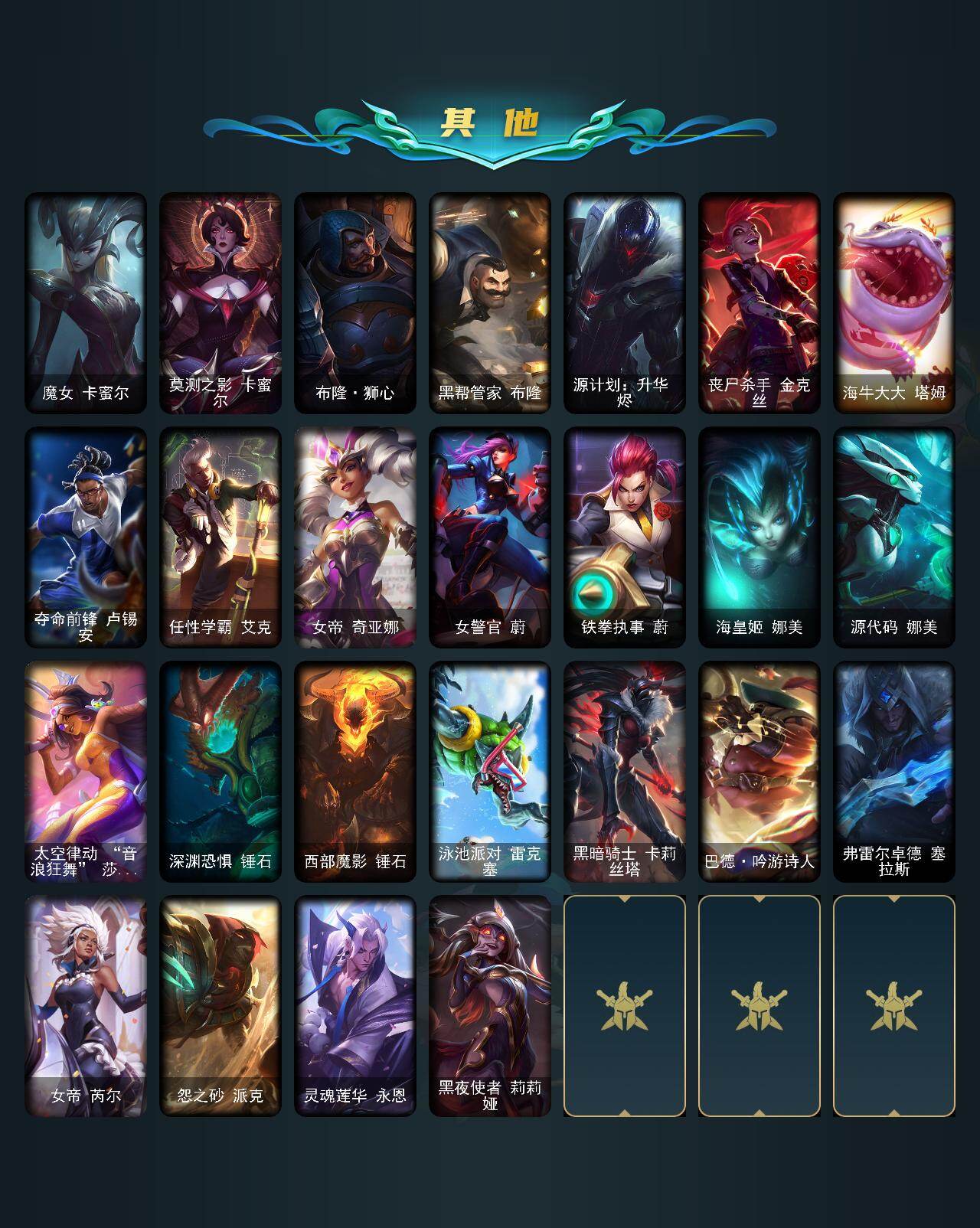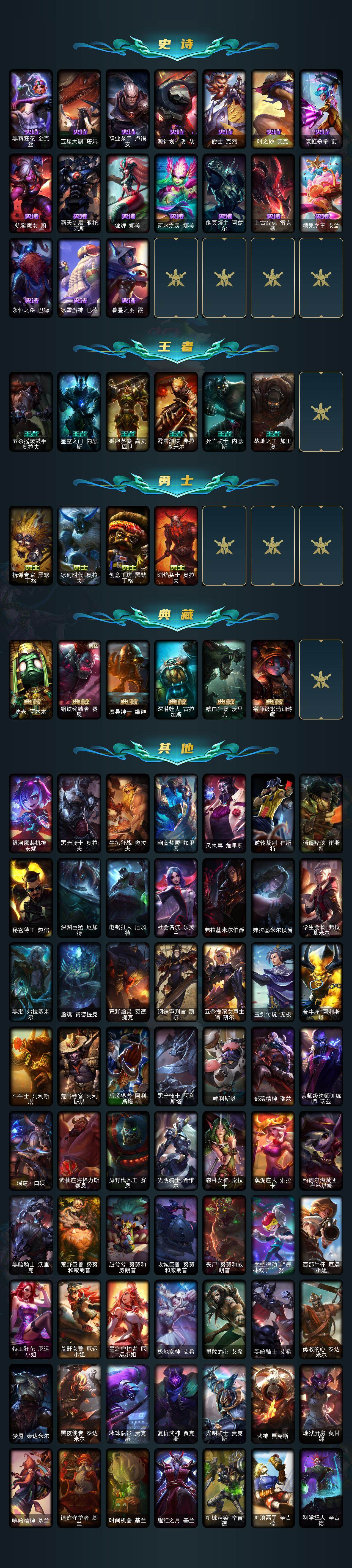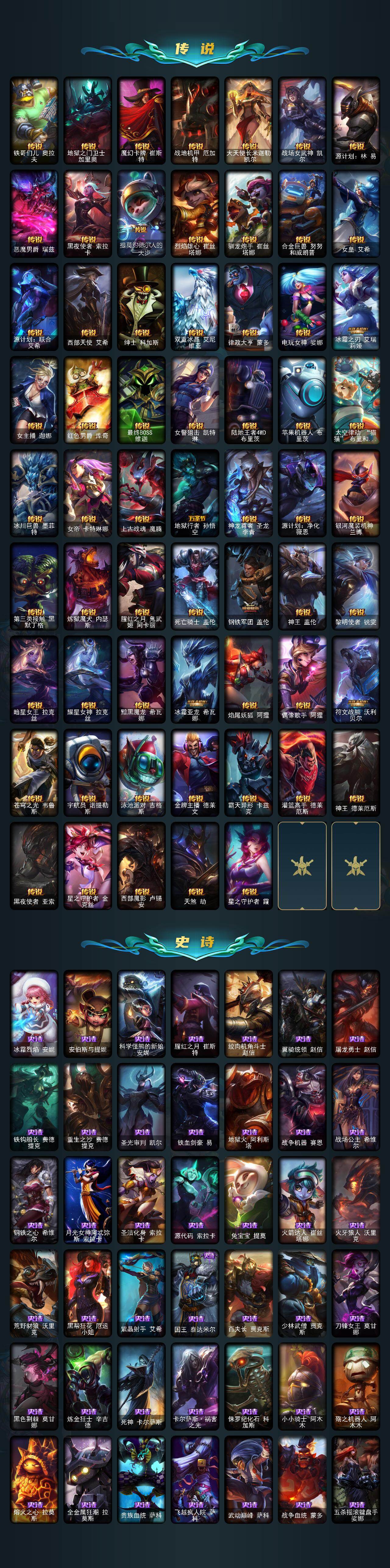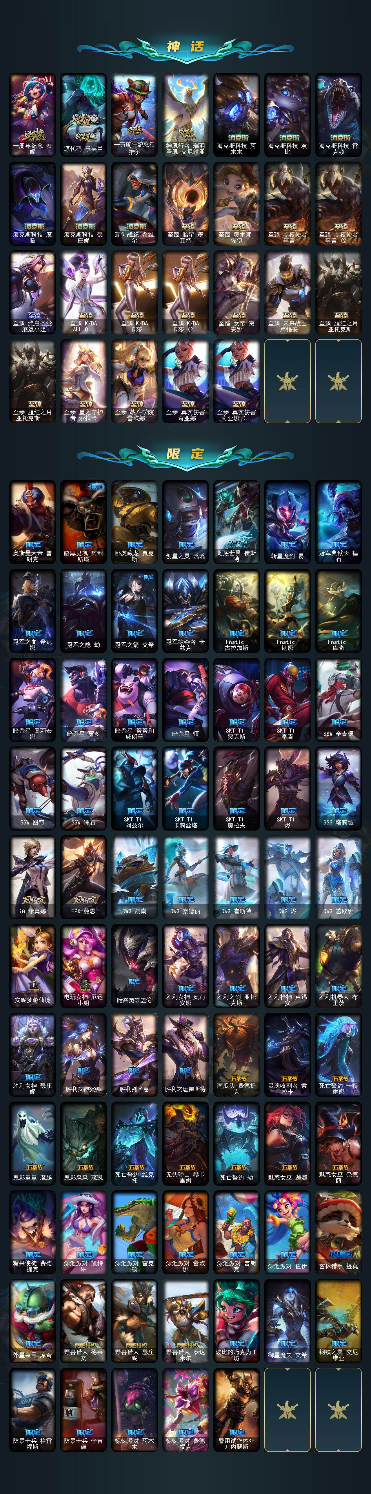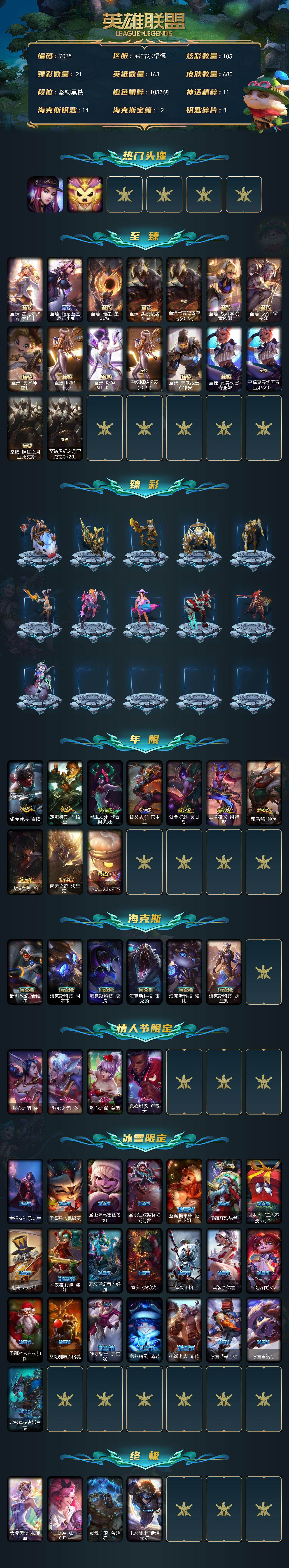 163英雄-680皮肤-163英雄/680皮肤/6终极/26神话/111限定/21臻彩/105炫彩/61传说/164史诗/未定级/十周年纪念 安妮/源代码 乐芙兰/十五周年纪念 希维尔/神凰行者 瑞羽圣凰 艾尼维亚/海克斯科技 阿木木/海克斯科技 波比/海克斯科技 雷克顿/海克斯科技 魔腾/海克斯科技 瑟庄妮/新创战纪 希维尔/至臻 真实伤害 奇亚娜/至臻 真实伤害 奇亚娜 2022/至臻 暗星 墨菲特/至臻 奥