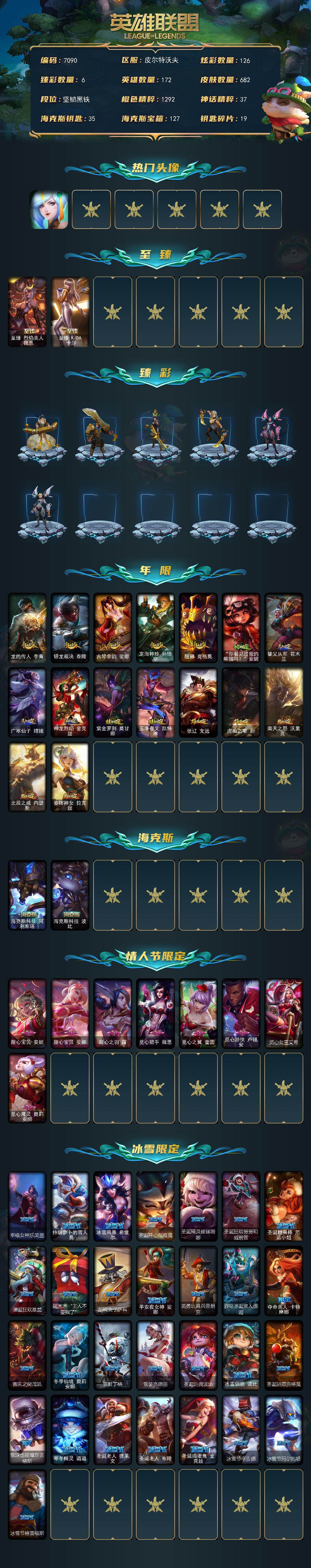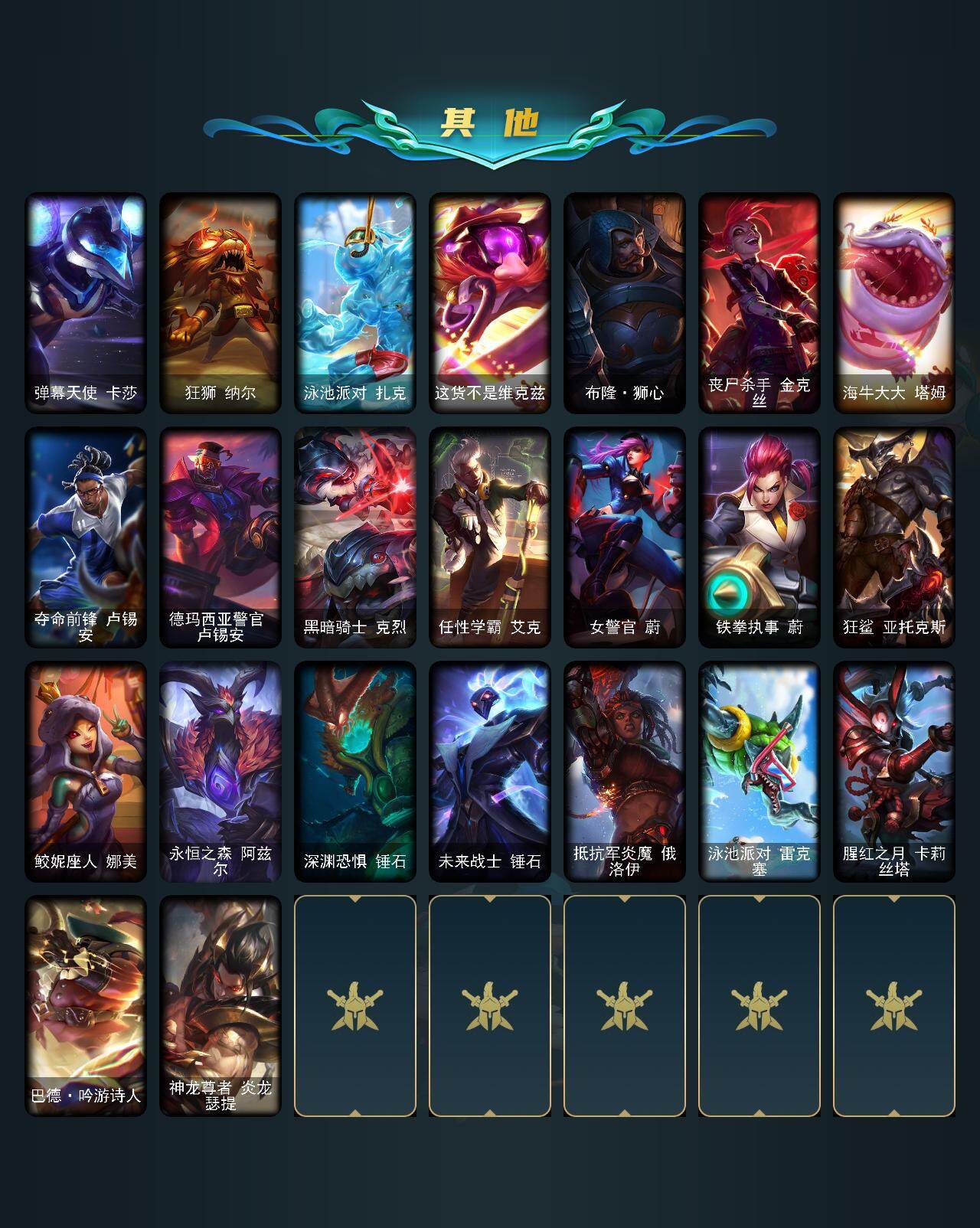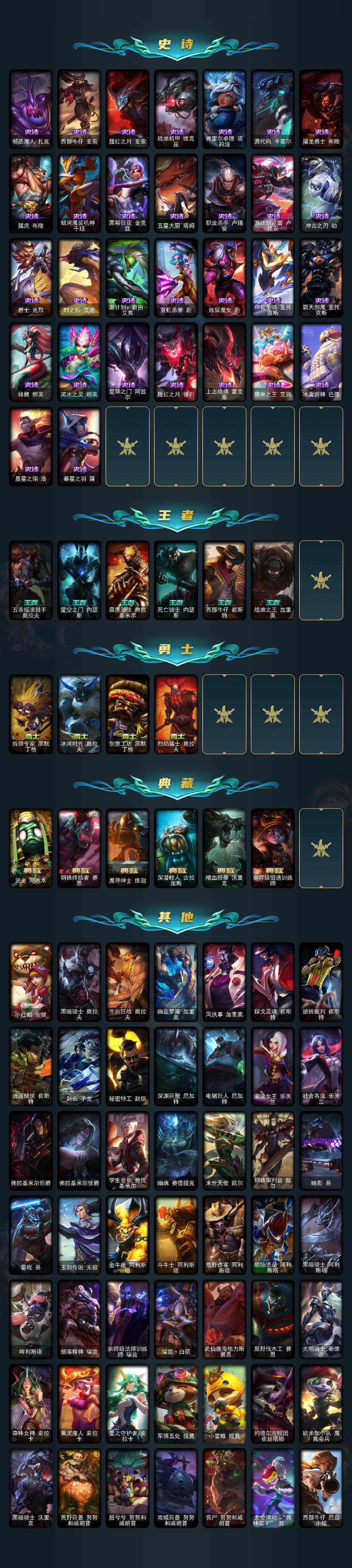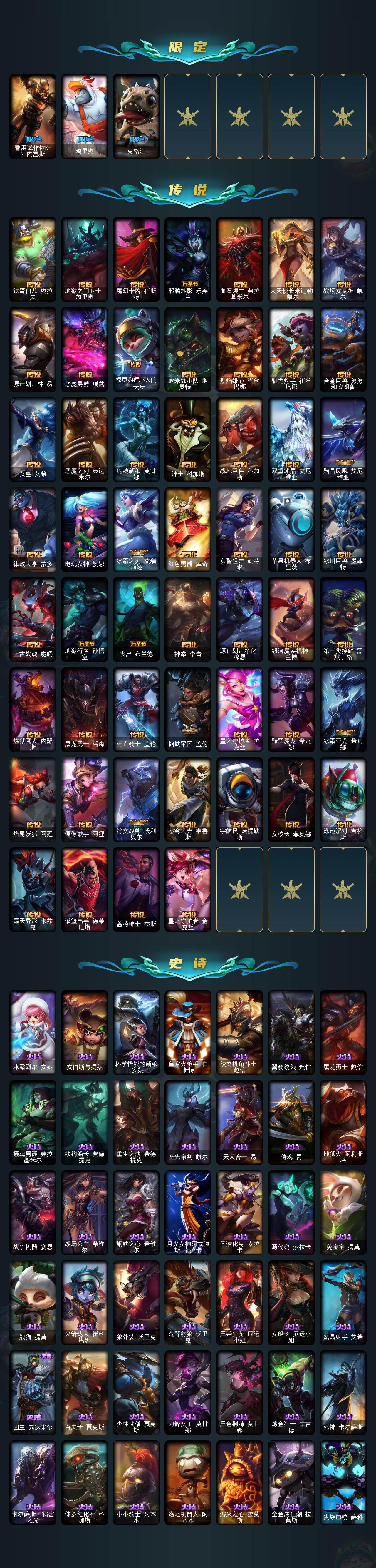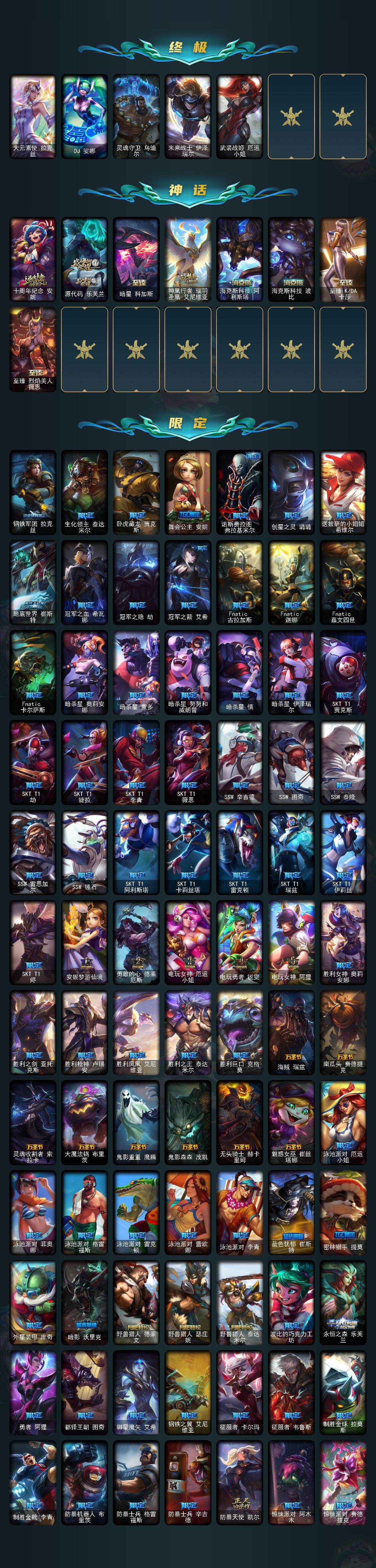 172英雄-682皮肤-172英雄/682皮肤/5终极/8神话/140限定/6臻彩/126炫彩/53传说/177史诗/未定级/十周年纪念 安妮/源代码 乐芙兰/暗星 科加斯/神凰行者 瑞羽圣凰 艾尼维亚/海克斯科技 阿利斯塔/海克斯科技 波比/至臻 k/da 卡莎/至臻 烈焰美人 薇恩/春晖神女头像/古琴余韵 娑娜 炫金天籁/张辽 文远 炫金将军/玉净夜叉 凯特琳 炫金神机/闭月之颜 貂蝉 炫金莲华/弹幕天使 卡莎