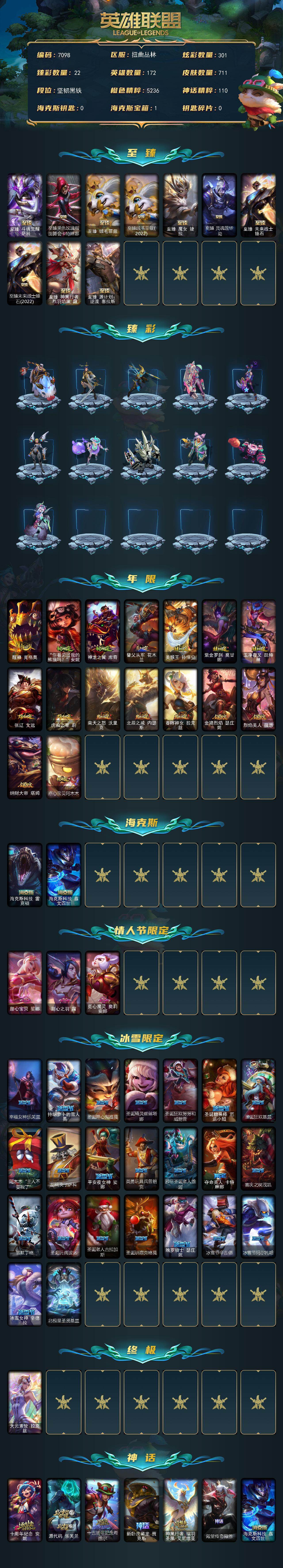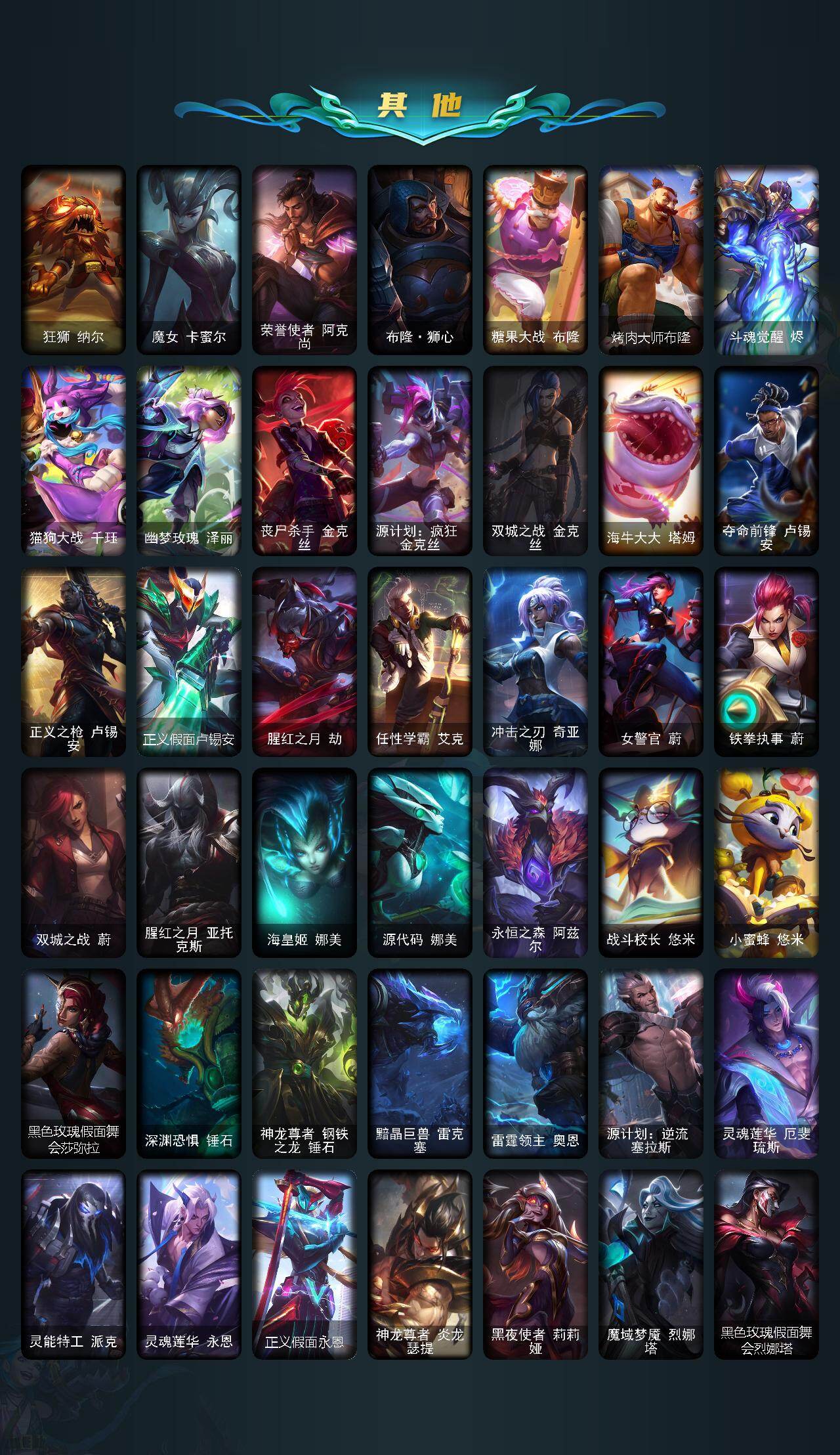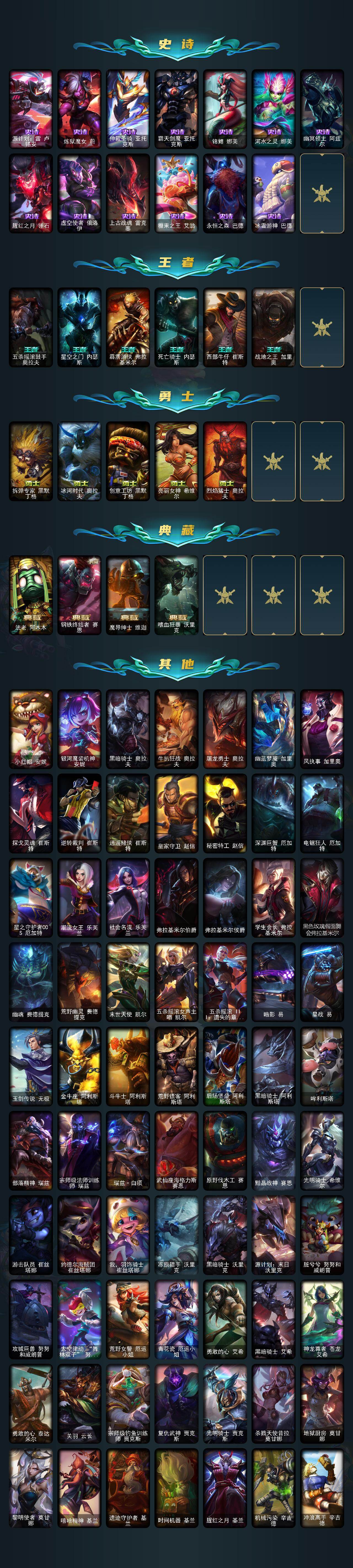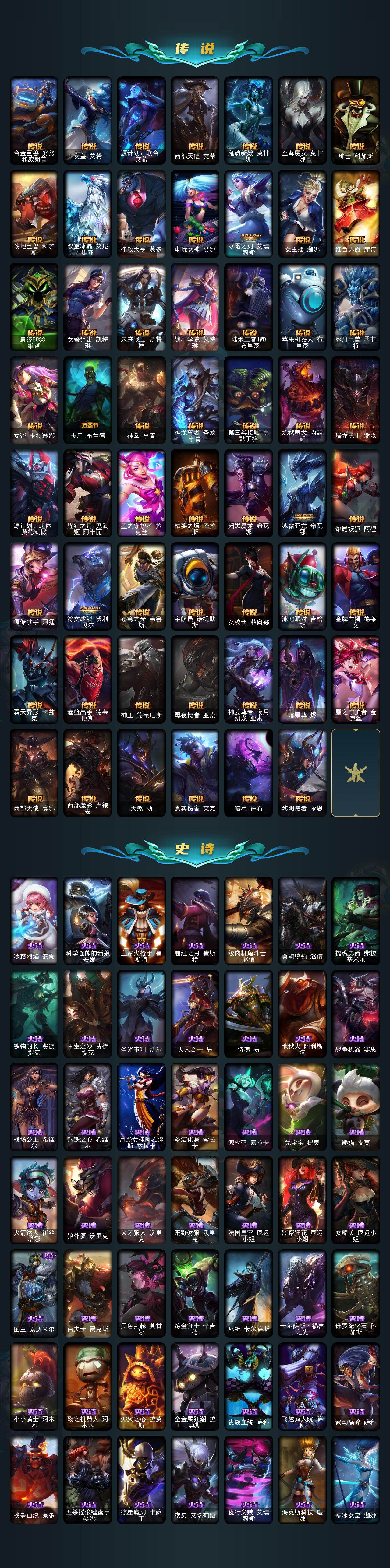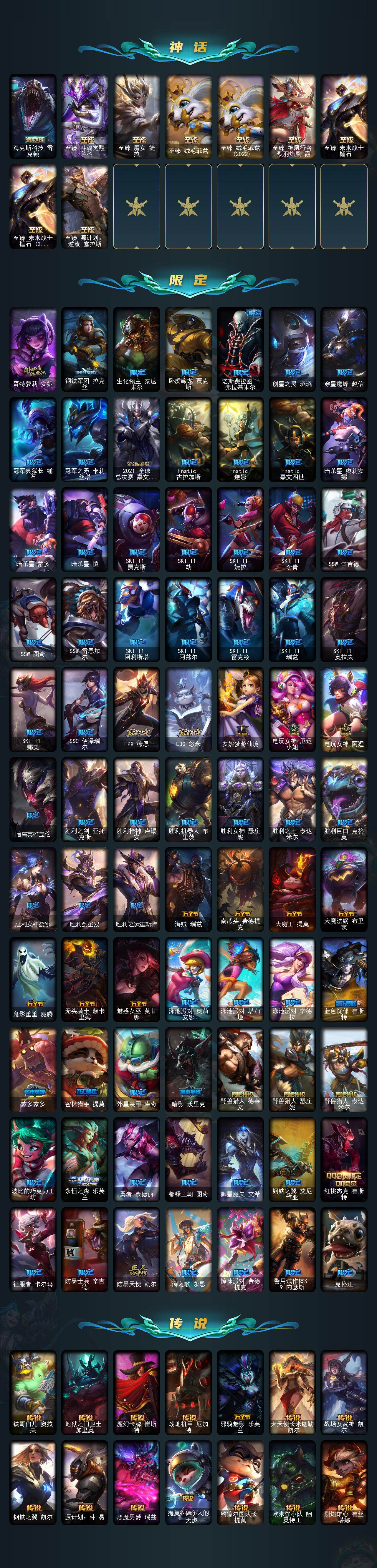 172英雄-711皮肤-172英雄/711皮肤/1终极/18神话/119限定/22臻彩/301炫彩/69传说/167史诗/未定级/十周年纪念 安妮/源代码 乐芙兰/十五周年纪念 希维尔/新卧虎藏龙 贾克斯/神凰行者 瑞羽圣凰 艾尼维亚/殿堂传奇薇恩/海克斯科技 嘉文四世/海克斯科技 雷克顿/至臻 斗魂觉醒 萨科/至臻 魔女 婕拉/至臻 绒毛菲兹/至臻 绒毛菲兹 2022/至臻 神凰行者 烈羽焰凰 霞/至臻 未来战