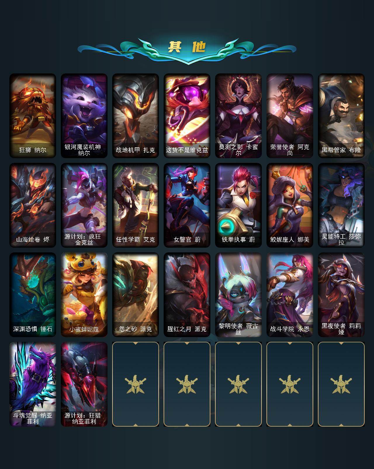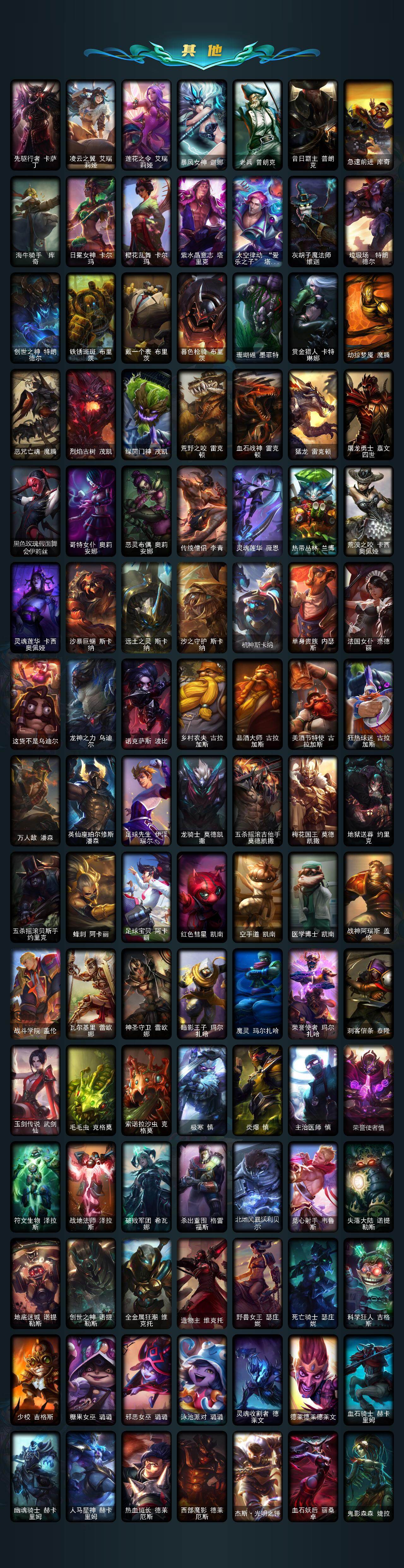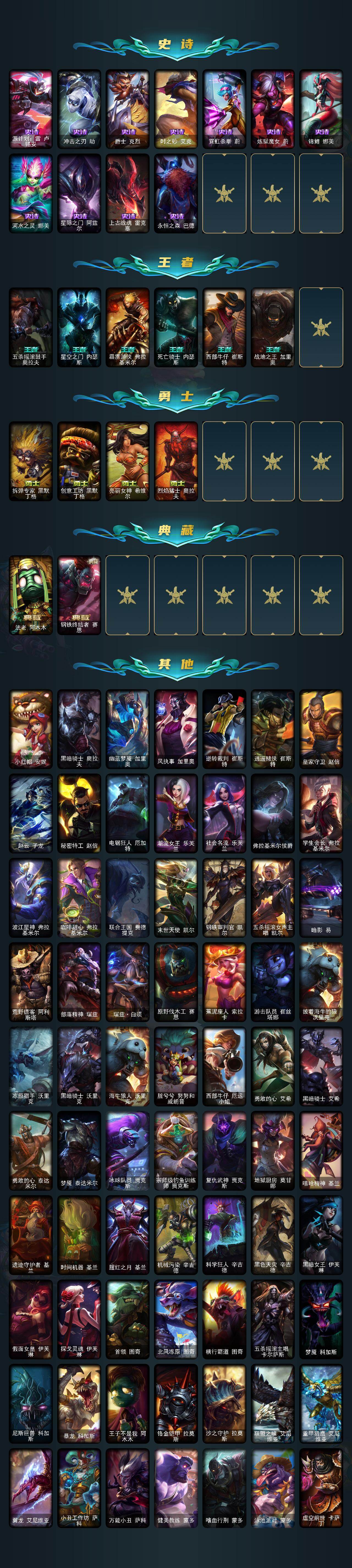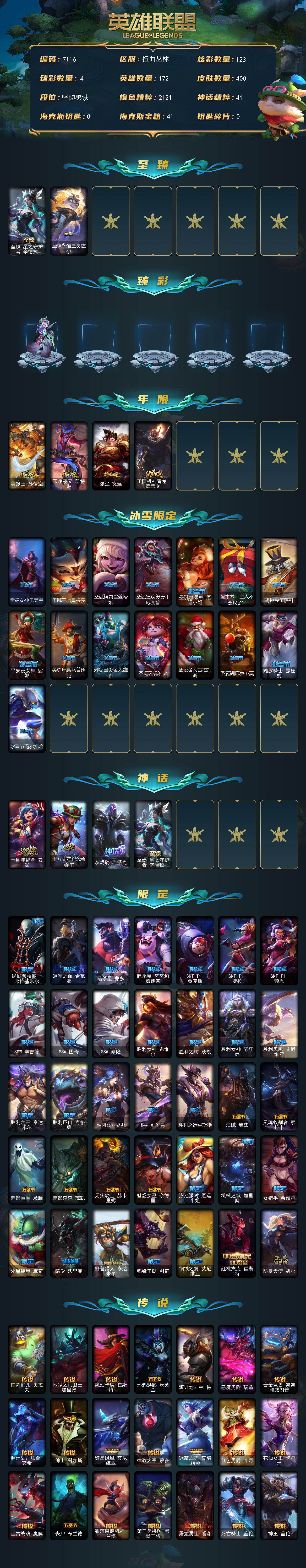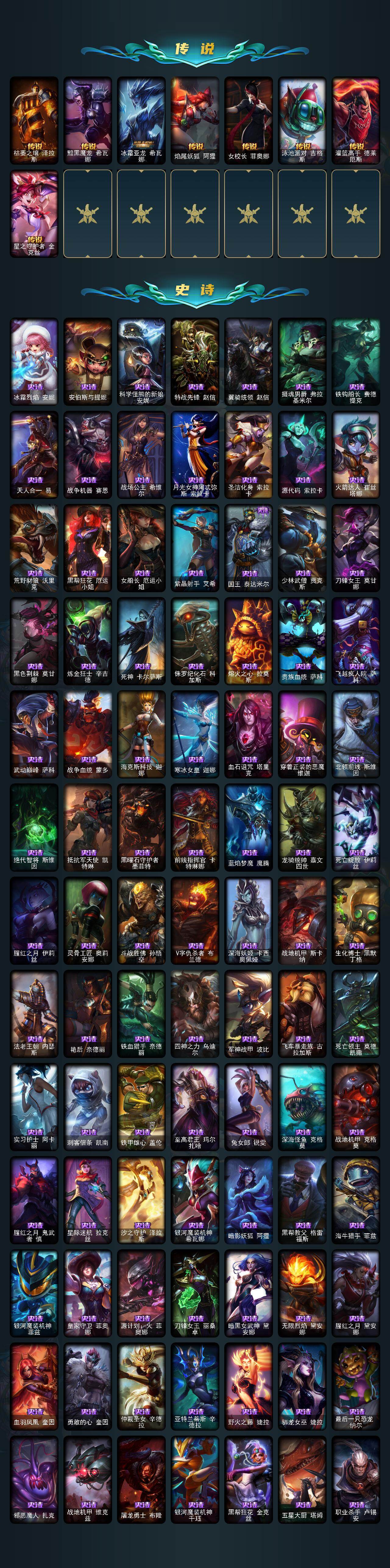 172英雄-400皮肤-172英雄/400皮肤/5神话/54限定/4臻彩/123炫彩/29传说/102史诗/未定级/十周年纪念 安妮/十五周年纪念 希维尔/灰烬骑士 派克/至臻 星之守护者 辛德拉/至臻永恒星灵佐伊/天龙之子卡莎飞龙乘云/魔女 阿卡丽 虚荣/净雪之月 莫甘娜 冬虹/墨之影武者永恩灵墨刻影/美猴王 孙悟空/玉净夜叉 凯特琳/张辽 文远/王国机神青龙 德莱文/幸福女神乐芙兰/圣诞开心鬼提莫/圣诞精灵崔丝塔