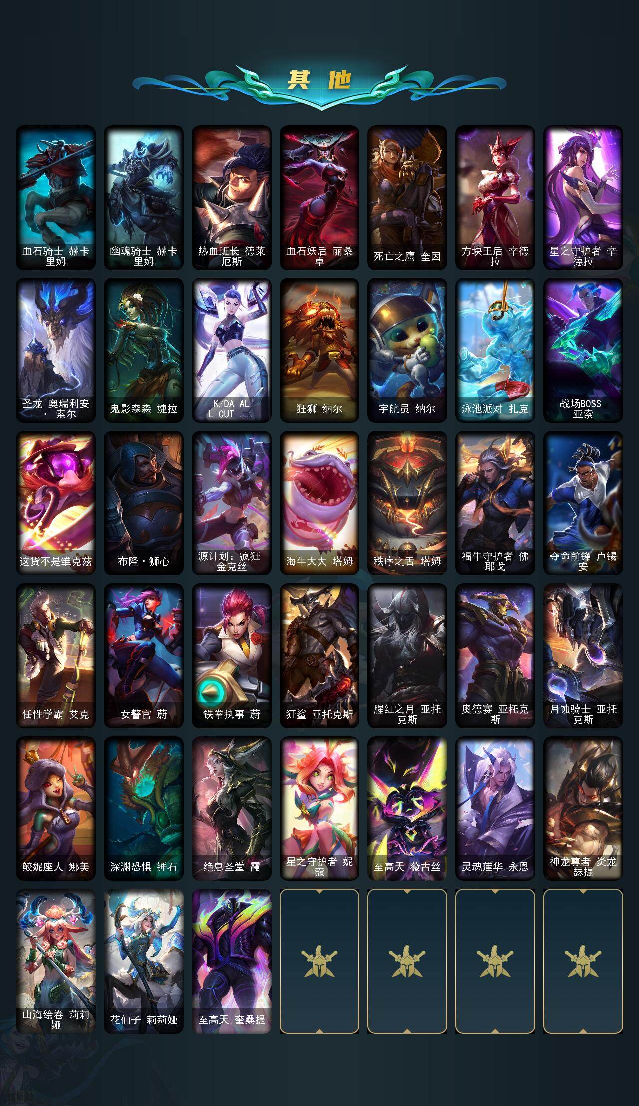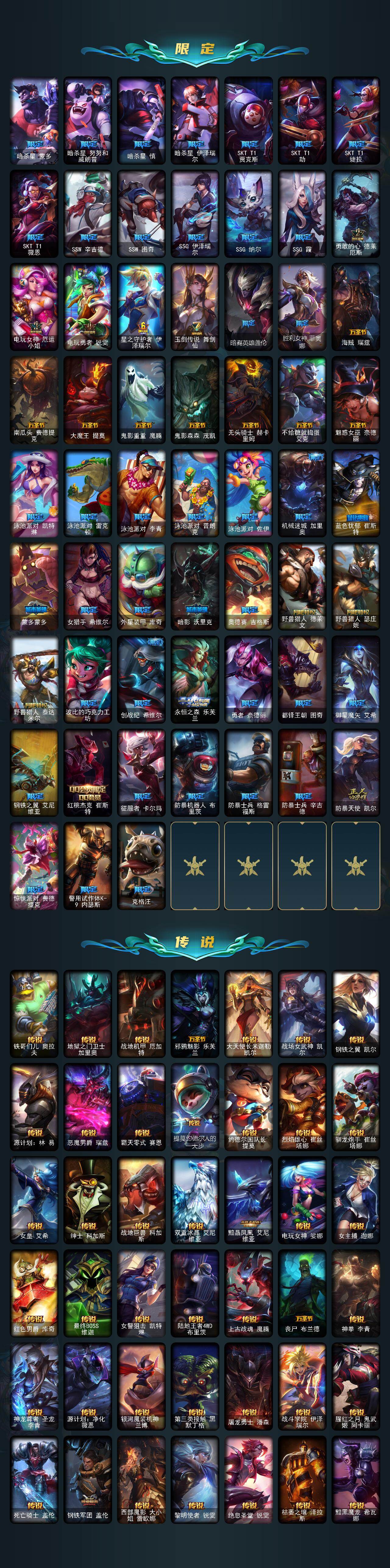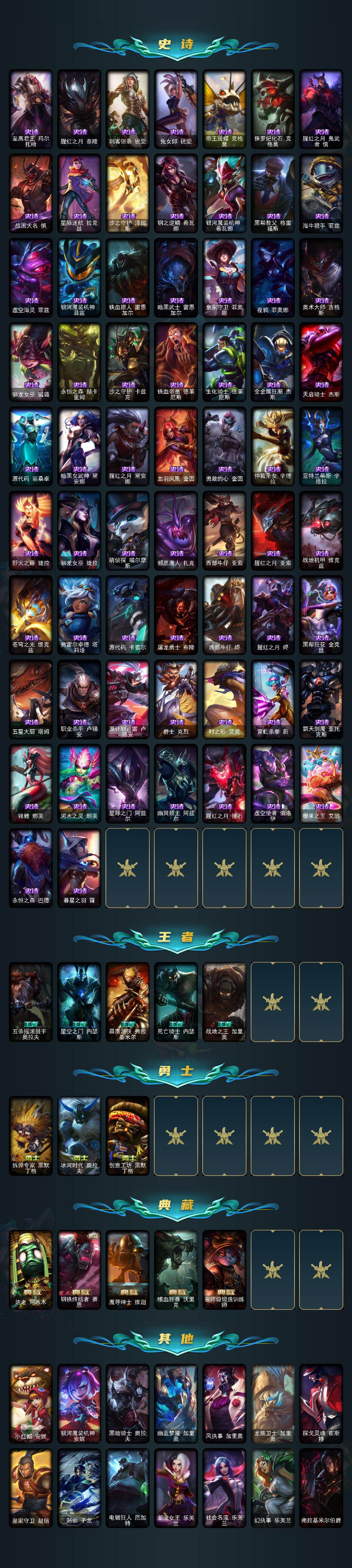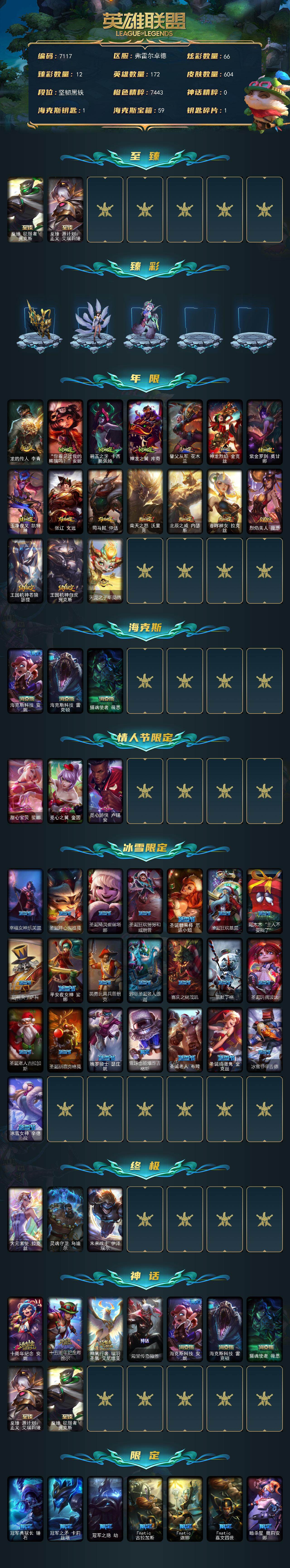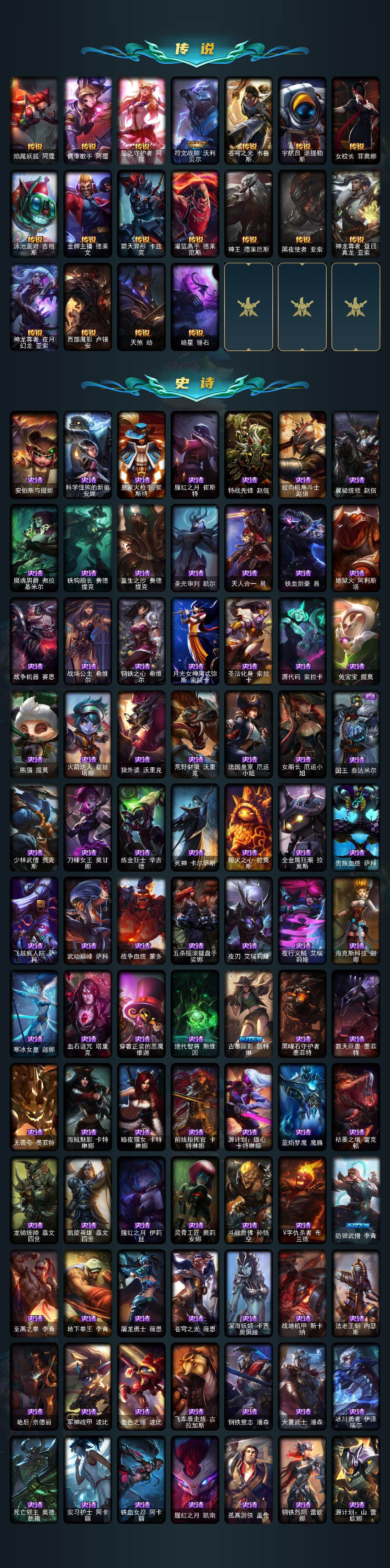 172英雄-604皮肤-172英雄/604皮肤/3终极/9神话/108限定/12臻彩/66炫彩/60传说/149史诗/未定级/十周年纪念 安妮/十五周年纪念 希维尔/神凰行者 瑞羽圣凰 艾尼维亚/殿堂传奇薇恩/海克斯科技 安妮/海克斯科技 雷克顿/摄魂使者 薇恩/至臻 征服者 贾克斯/至臻 源计划:正义 艾瑞莉娅/天龙之子卡莎飞龙乘云/吕布 奉先 炫金战神/墨之影武者亚索金墨耀影/冠军之刃锐雯2016凯旋圣装/偶像歌