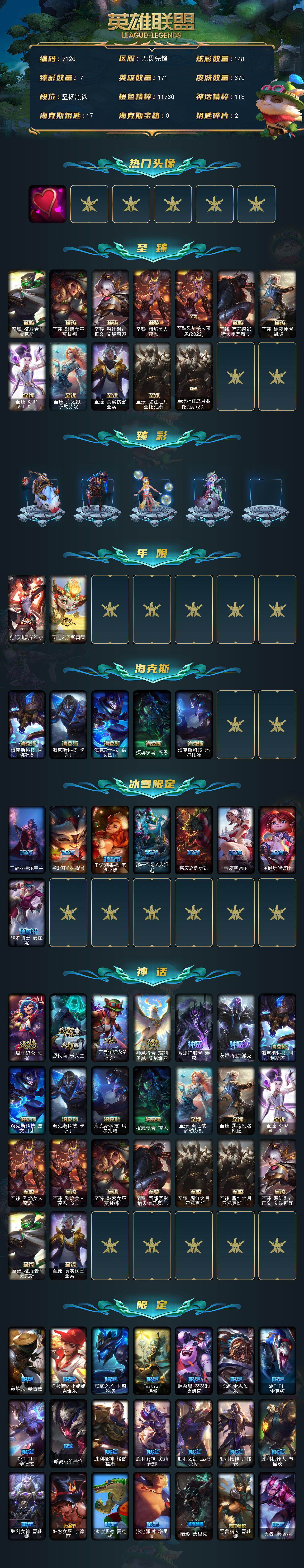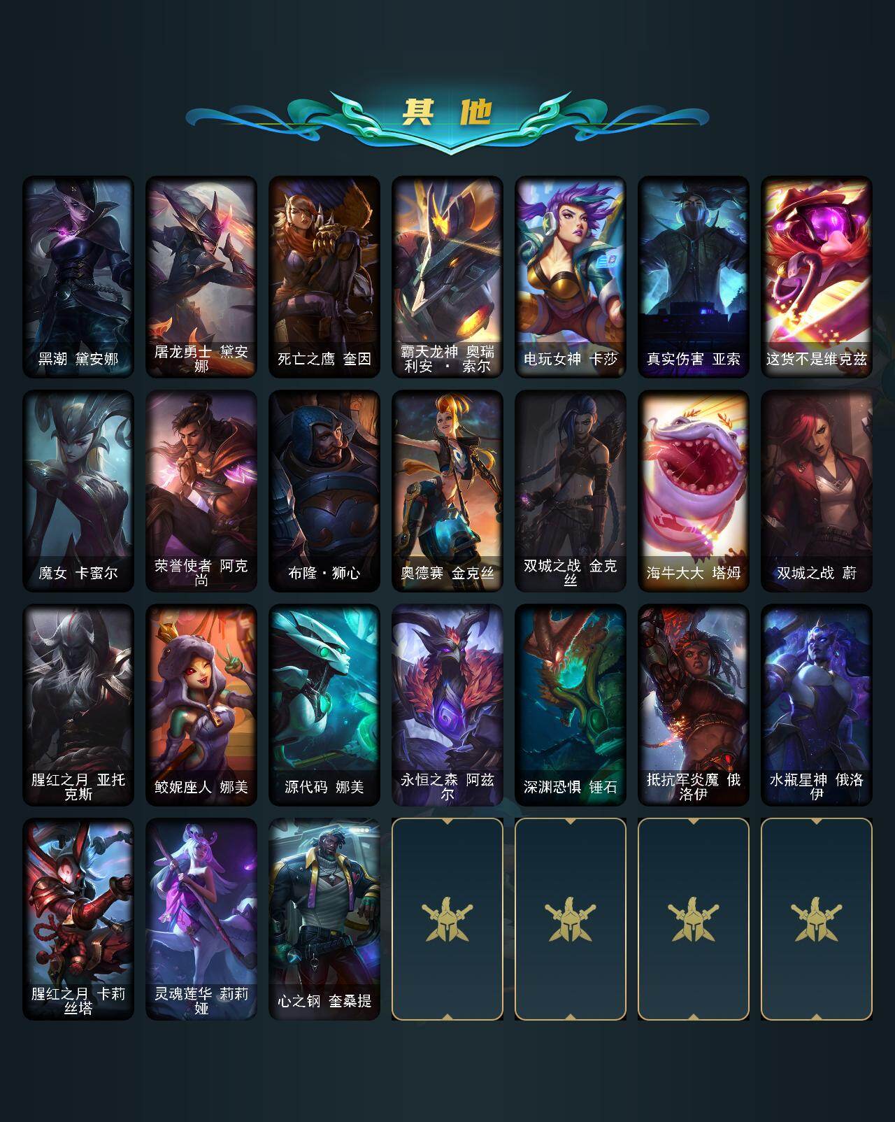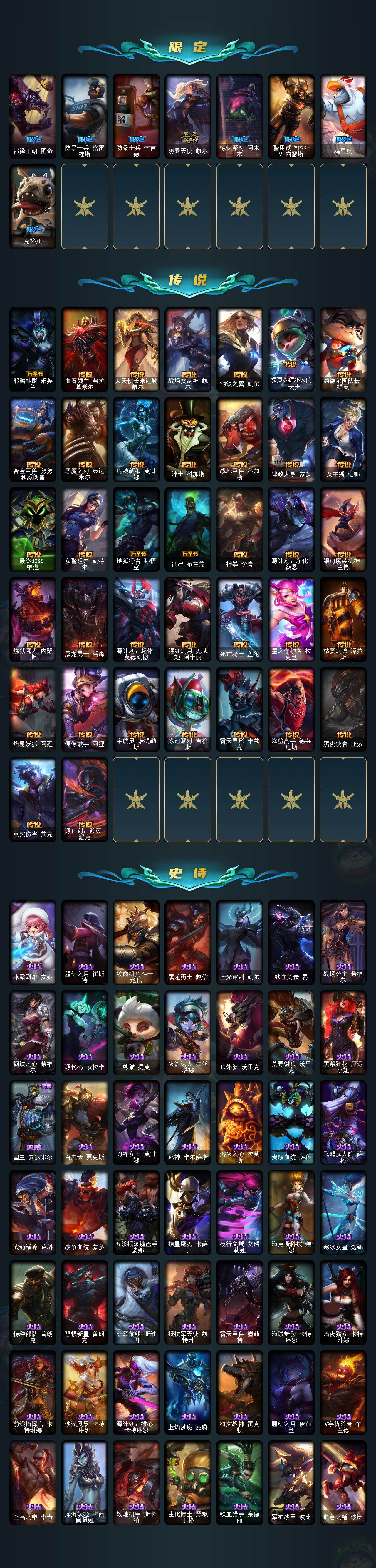 171英雄-370皮肤-171英雄/370皮肤/23神话/39限定/7臻彩/148炫彩/37传说/82史诗/未定级/十周年纪念 安妮/源代码 乐芙兰/十五周年纪念 希维尔/神凰行者 瑞羽圣凰 艾尼维亚/灰烬征服者 潘森/灰烬骑士 派克/海克斯科技 阿利斯塔/海克斯科技 嘉文四世/海克斯科技 卡萨丁/海克斯科技 玛尔扎哈/摄魂使者 薇恩/至臻 征服者 贾克斯/至臻 真实伤害 亚索/至臻 海之歌 萨勒芬妮/至臻 黑夜使者