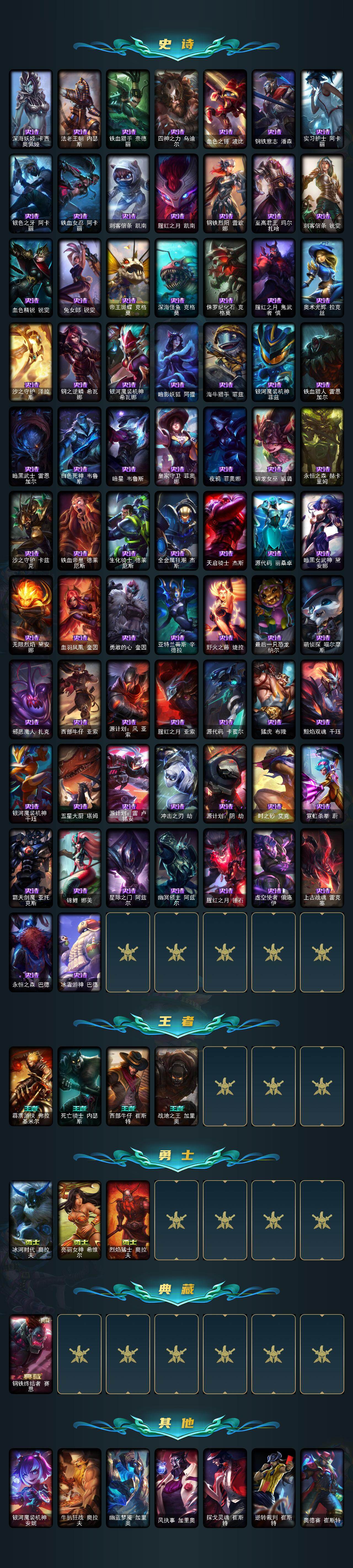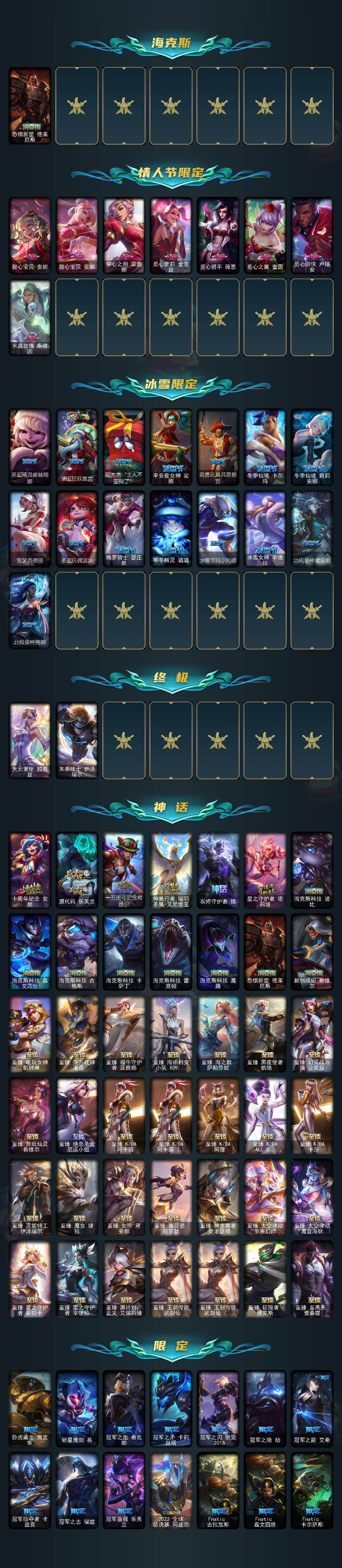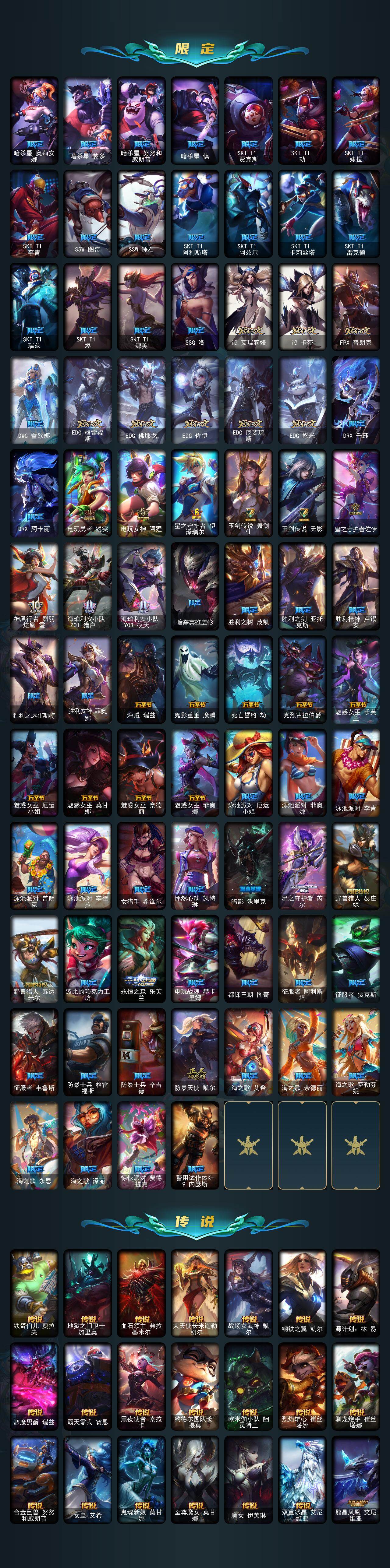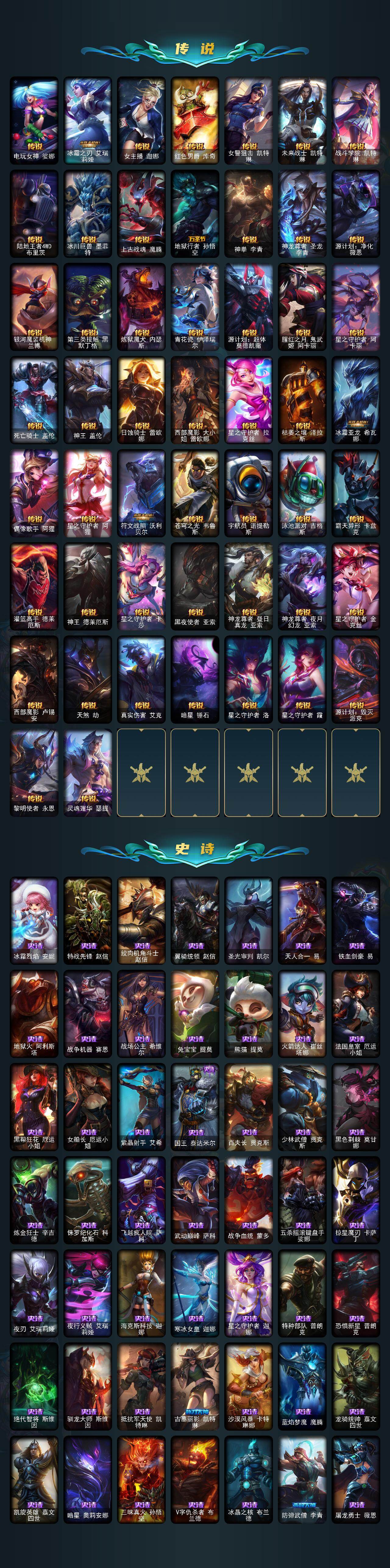 172英雄-694皮肤-172英雄/694皮肤/2终极/43神话/159限定/25臻彩/184炫彩/72传说/121史诗/青铜/十周年纪念 安妮/源代码 乐芙兰/十五周年纪念 希维尔/神凰行者 瑞羽圣凰 艾尼维亚/灰烬守护者 慎/星之守护者 塔莉垭/海克斯科技 波比/海克斯科技 嘉文四世/海克斯科技 吉格斯/海克斯科技 卡萨丁/海克斯科技 雷克顿/海克斯科技 魔腾/恐惧新星 德莱厄斯/新创战纪 希维尔/至臻 征服者