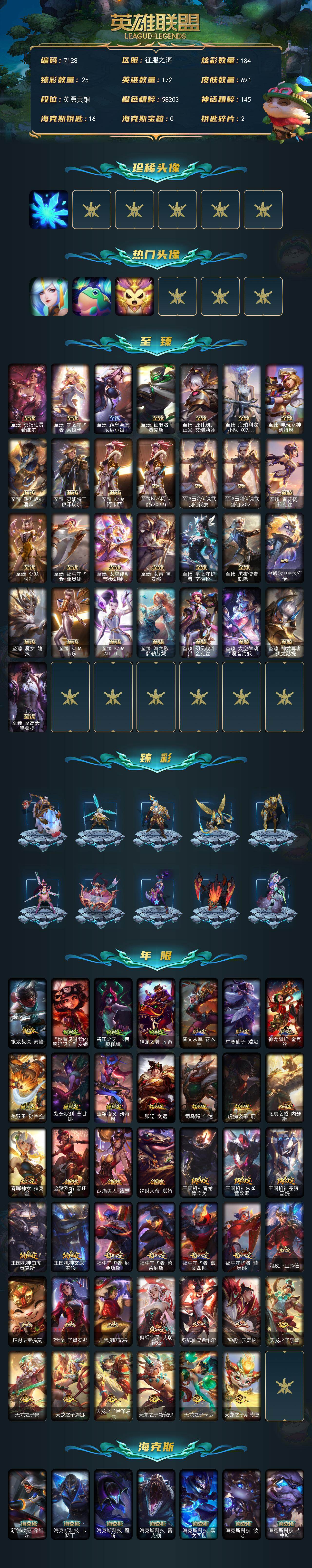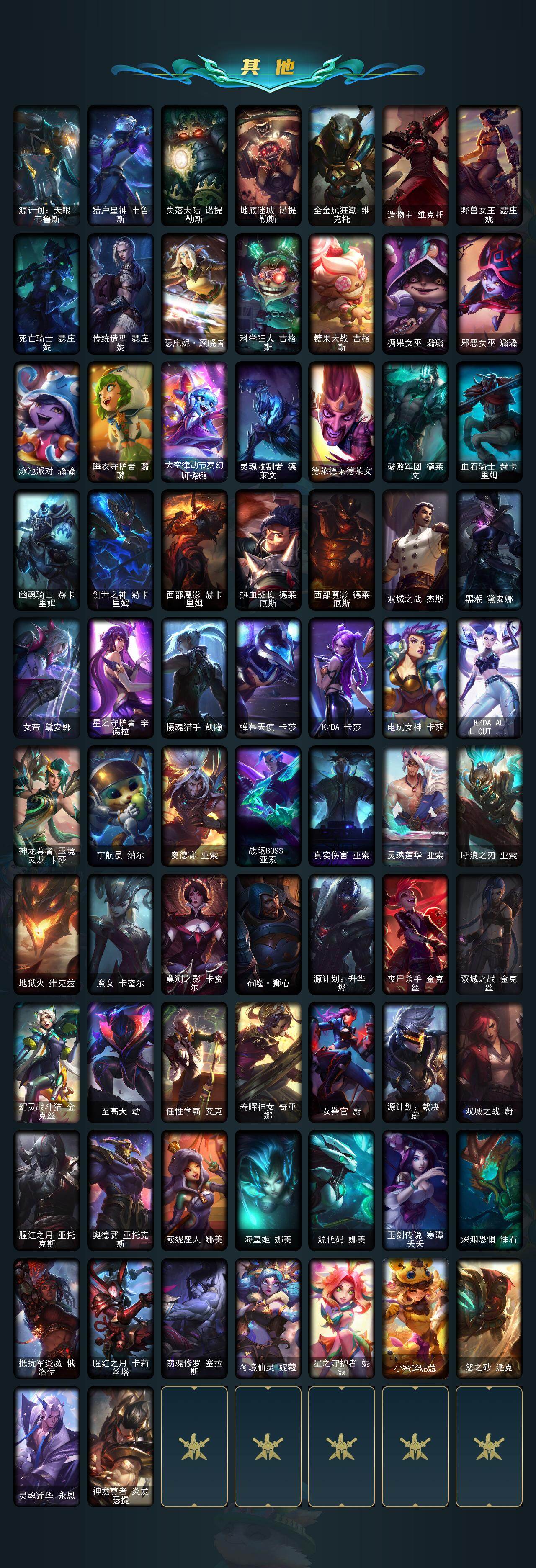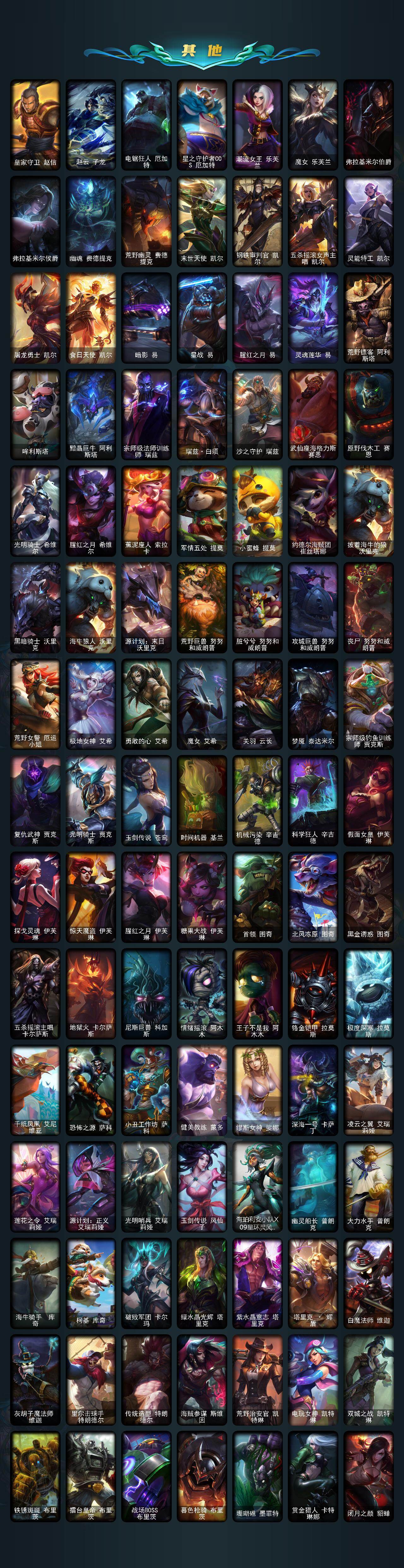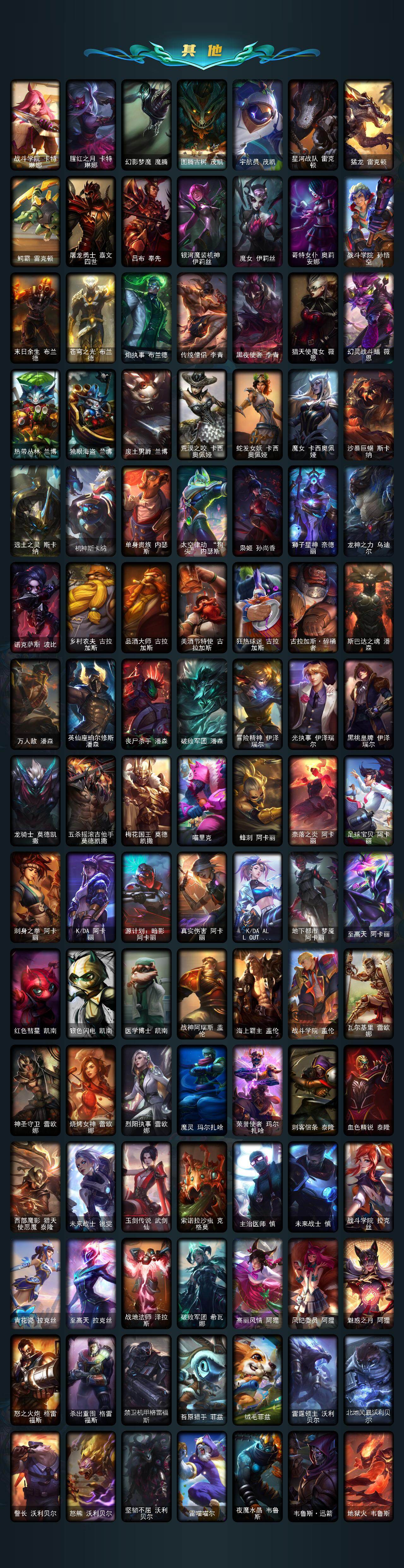 172英雄-694皮肤-172英雄/694皮肤/2终极/43神话/159限定/25臻彩/184炫彩/72传说/121史诗/青铜/十周年纪念 安妮/源代码 乐芙兰/十五周年纪念 希维尔/神凰行者 瑞羽圣凰 艾尼维亚/灰烬守护者 慎/星之守护者 塔莉垭/海克斯科技 波比/海克斯科技 嘉文四世/海克斯科技 吉格斯/海克斯科技 卡萨丁/海克斯科技 雷克顿/海克斯科技 魔腾/恐惧新星 德莱厄斯/新创战纪 希维尔/至臻 征服者