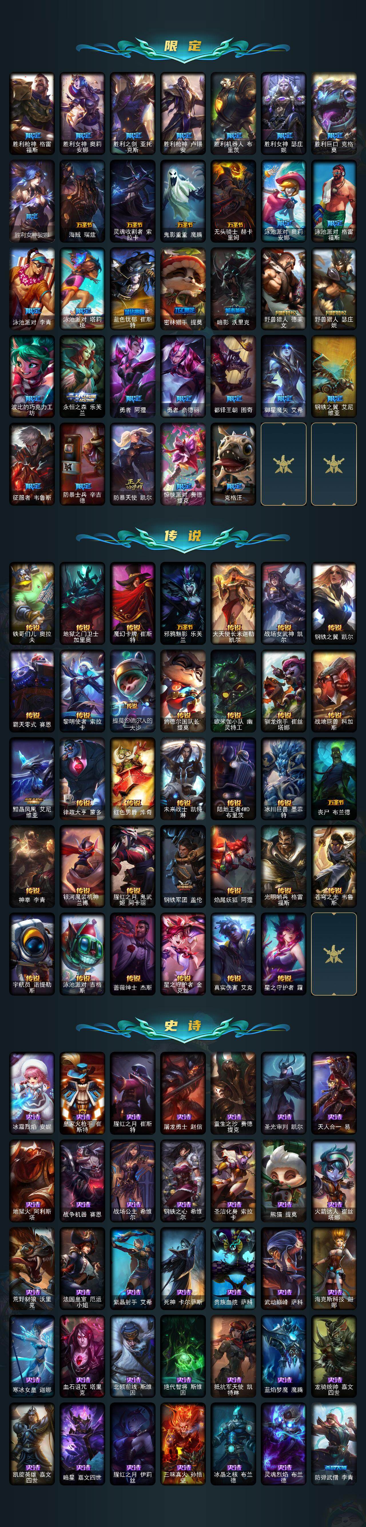 167英雄-352皮肤-167英雄/352皮肤/1终极/16神话/69限定/3臻彩/80炫彩/34传说/89史诗/未定级/十周年纪念 安妮/源代码 乐芙兰/十五周年纪念 希维尔/神凰行者 瑞羽圣凰 艾尼维亚/海克斯科技 嘉文四世/零之呛骑 赫卡里姆/摄魂使者 薇恩/新创战纪 希维尔/至臻 奥术师 佐伊/至臻 k/da all out 卡莎/至臻 灵能特工 伊泽瑞尔/至臻 女帝 黛安娜/至臻 神龙尊者 炎龙瑟提/至臻