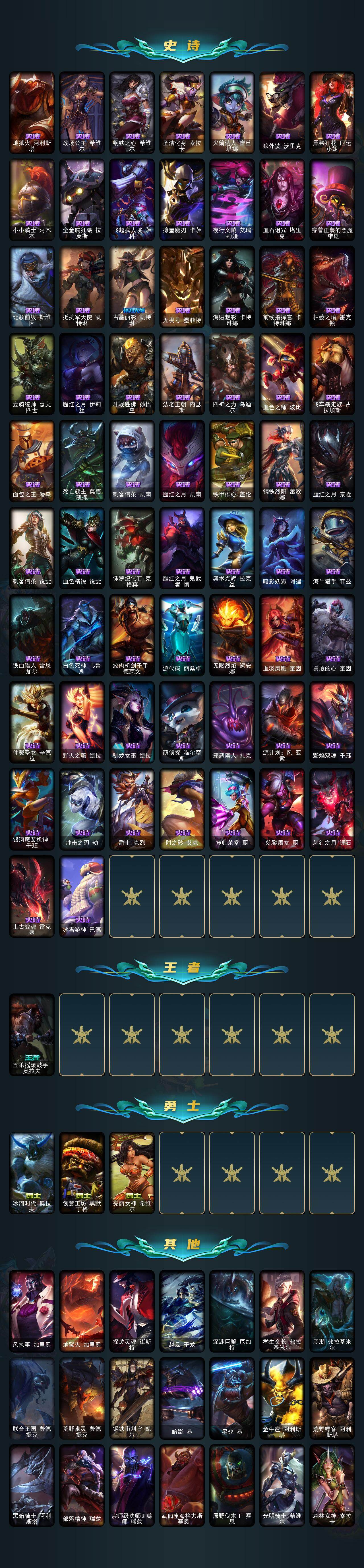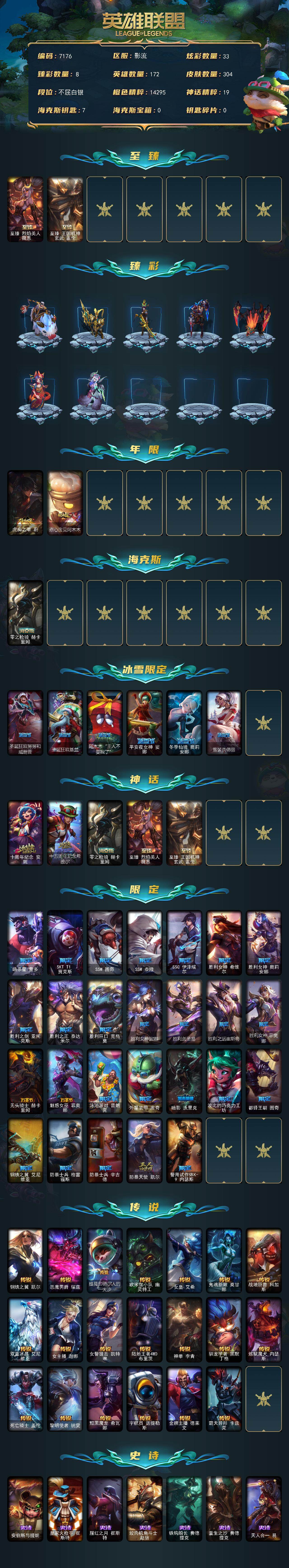 172英雄-304皮肤-172英雄/304皮肤/5神话/34限定/8臻彩/33炫彩/20传说/72史诗/白银/十周年纪念 安妮/十五周年纪念 希维尔/零之呛骑 赫卡里姆/至臻 烈焰美人 薇恩/至臻 王国机神玄武 盖伦/无畏骑士 瑟庄妮 赤子初心/吕布 奉先 炫金战神/玉净夜叉 凯特琳 炫金神机/玉剑传说 无劫 胭脂/山海绘卷 科加斯 朱红/灵魂莲华 卡西奥佩娅 流火/魔女 阿卡丽 虚荣/净雪之月 莫甘娜 冬虹/虎痴之