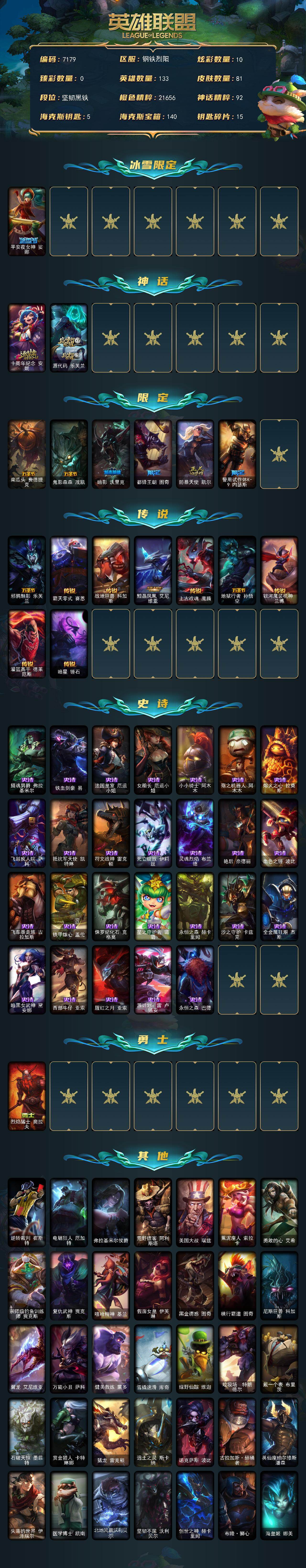 133英雄-81皮肤-133英雄/81皮肤/2神话/7限定/10炫彩/9传说/26史诗/未定级/十周年纪念 安妮/源代码 乐芙兰/平安夜女神 娑娜/南瓜头 费德提克/鬼影森森 茂凯/暗影 沃里克/都铎王朝 图奇/防暴天使 凯尔/警用试作体k-9 内瑟斯/邪鸦魅影 乐芙兰/霸天零式 赛恩/战地巨兽 科加斯/黯晶凤凰 艾尼维亚/上古战魂 魔腾/地狱行者 孙悟空/银河魔装机神 兰博/灌篮高手 德莱厄斯/暗星 锤石/摄魂男