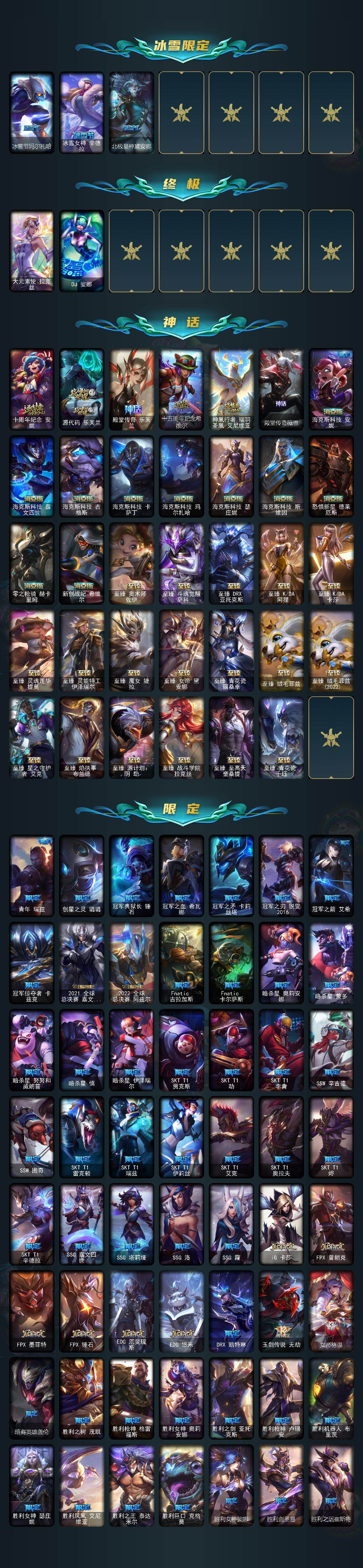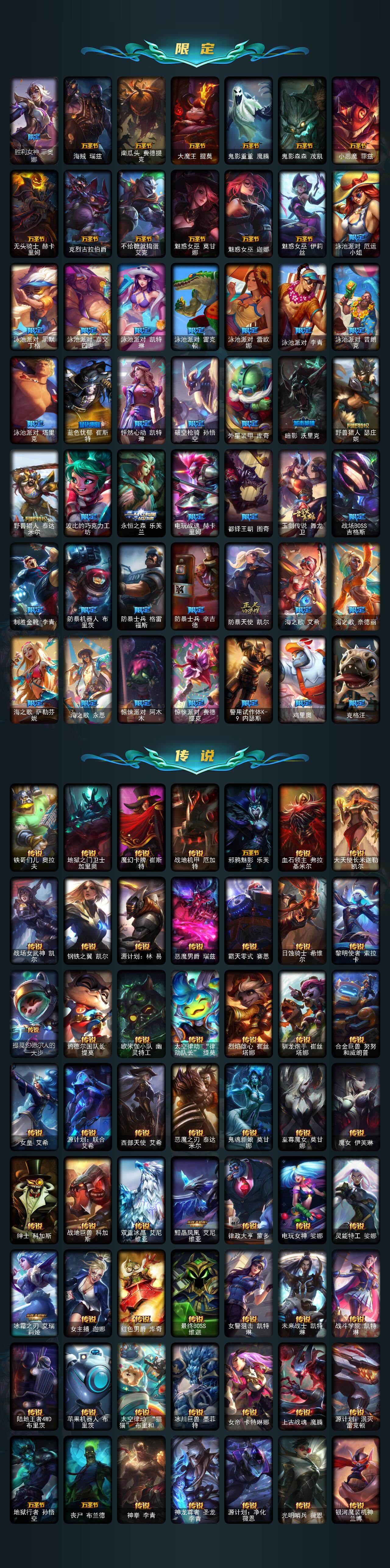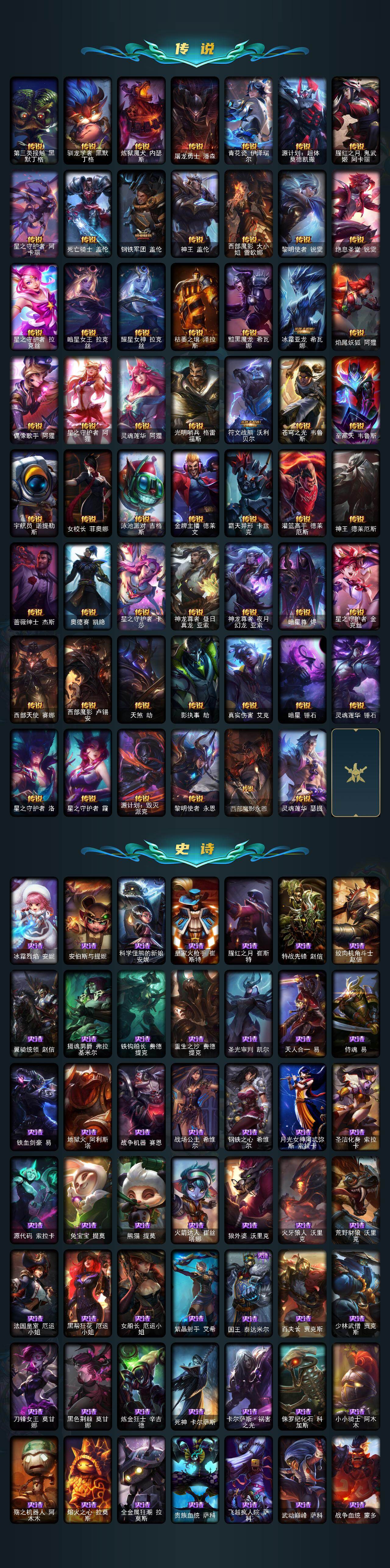 172英雄-1180皮肤-172英雄/1180皮肤/2终极/40神话/145限定/29臻彩/781炫彩/111传说/210史诗/铂金/十周年纪念 安妮/源代码 乐芙兰/殿堂传奇 乐芙兰/十五周年纪念 希维尔/神凰行者 瑞羽圣凰 艾尼维亚/殿堂传奇薇恩/海克斯科技 安妮/海克斯科技 嘉文四世/海克斯科技 吉格斯/海克斯科技 卡萨丁/海克斯科技 玛尔扎哈/海克斯科技 瑟庄妮/海克斯科技 斯维因/恐惧新星 德莱厄斯/零之呛骑