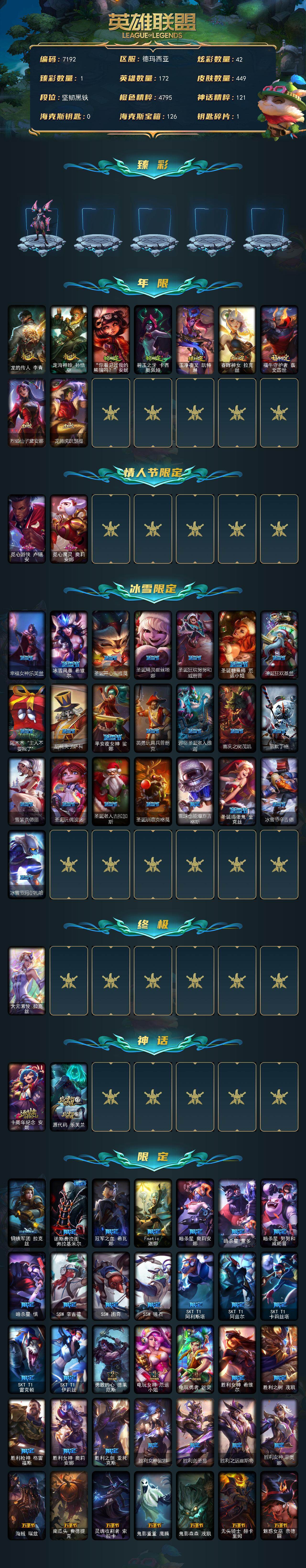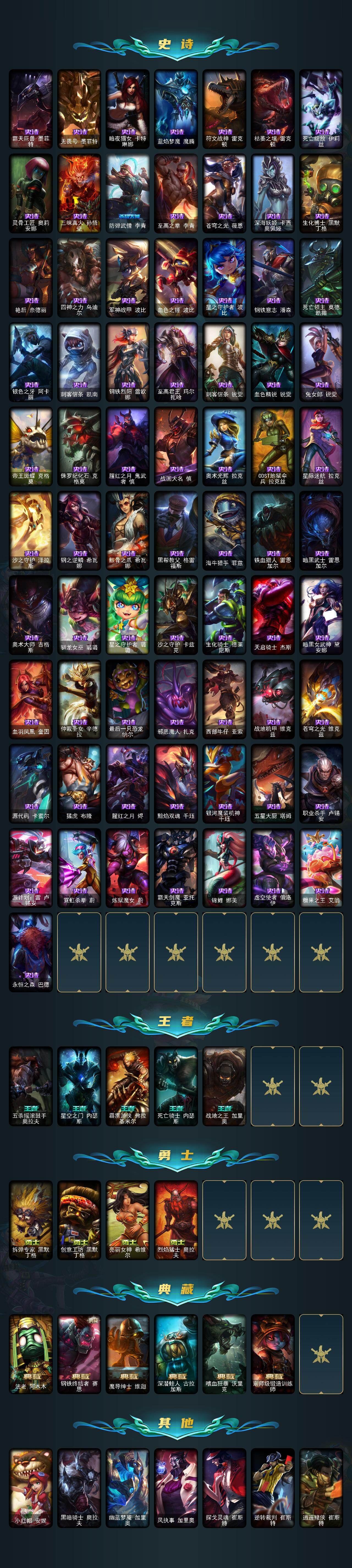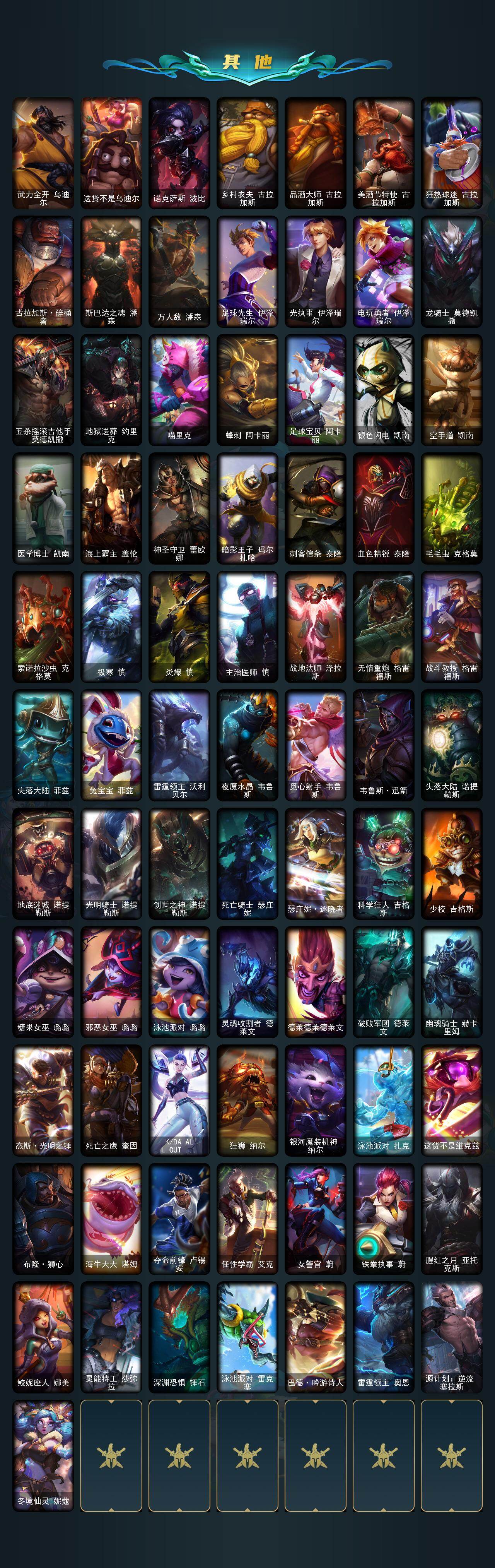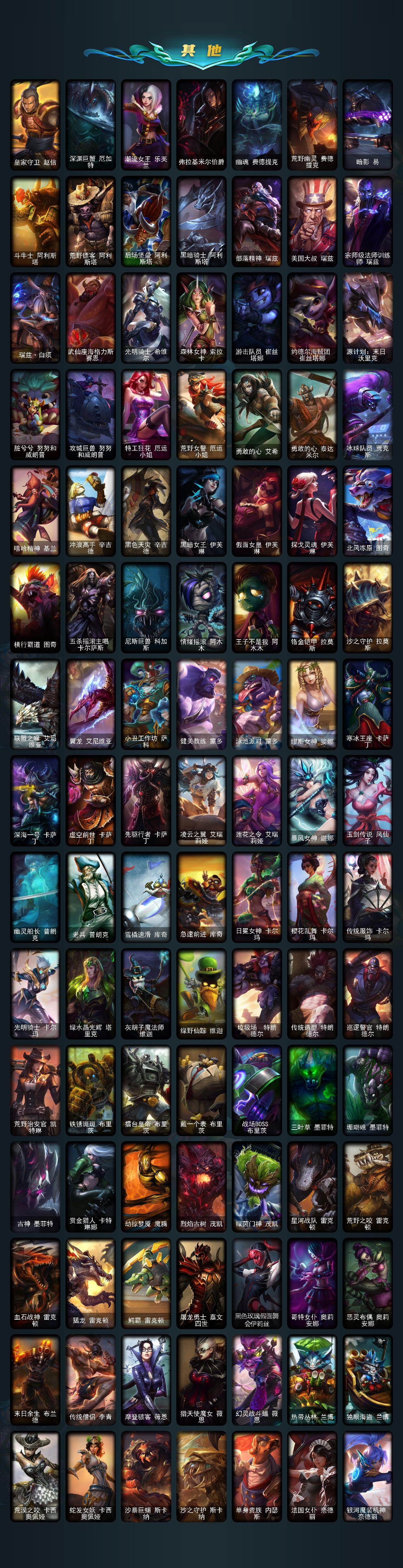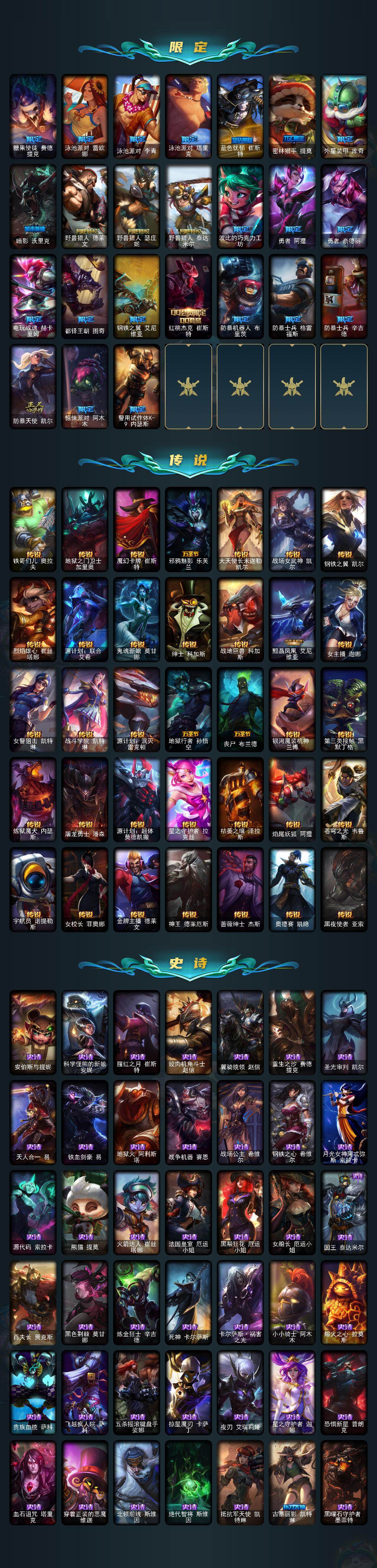 172英雄-449皮肤-172英雄/449皮肤/1终极/2神话/92限定/1臻彩/42炫彩/35传说/113史诗/未定级/十周年纪念 安妮/源代码 乐芙兰/弹幕天使 卡莎 炽天使·勇敢/龙的传人 李青/定海神珍 孙悟空/“你看见过我的熊猫吗?”安妮/碧玉之牙 卡西奥佩娅/玉净夜叉 凯特琳/春晖神女 拉克丝/福牛守护者 嘉文四世/烈焰仙子黛安娜/龙腾虎跃瑟提/觅心游侠 卢锡安/觅心魔灵 奥莉安娜/幸福女神乐芙兰/冰雪风