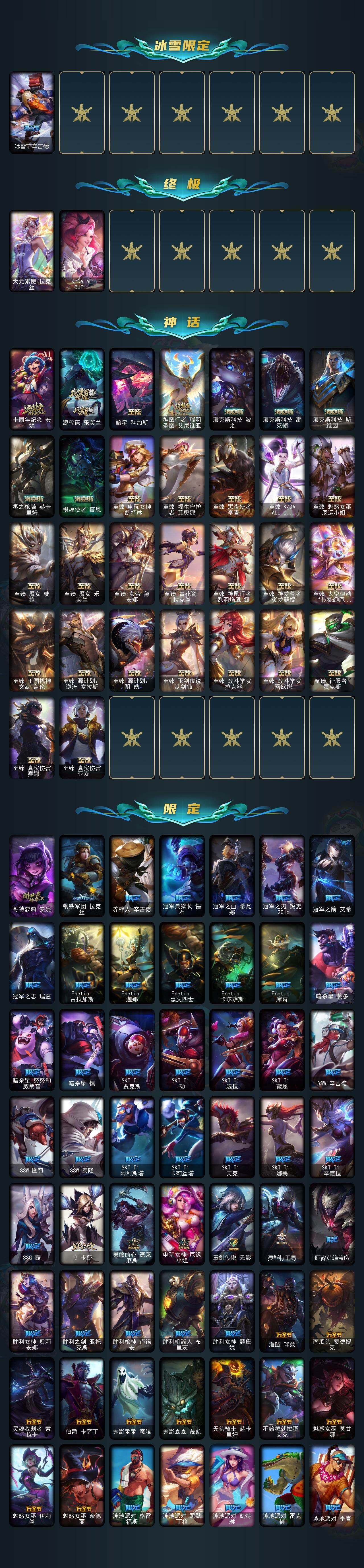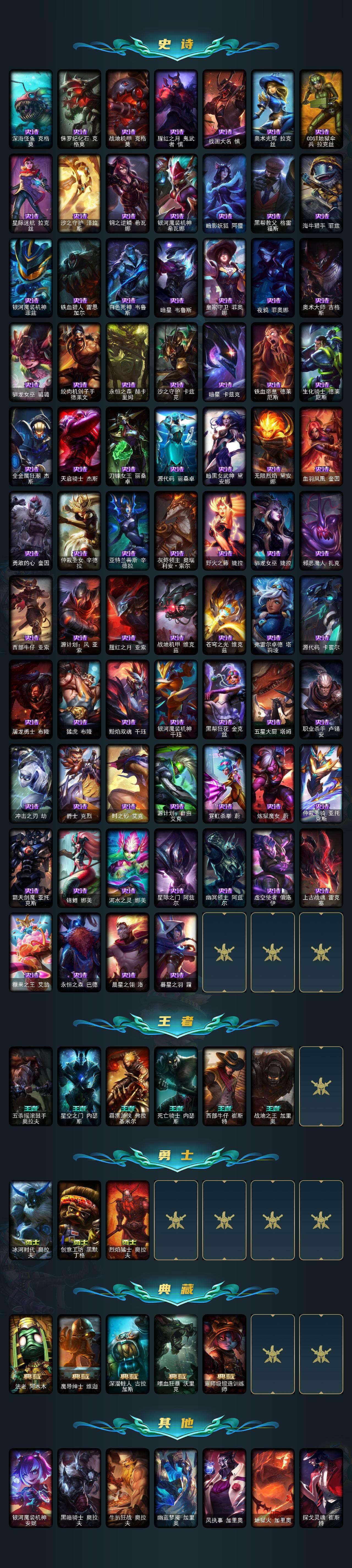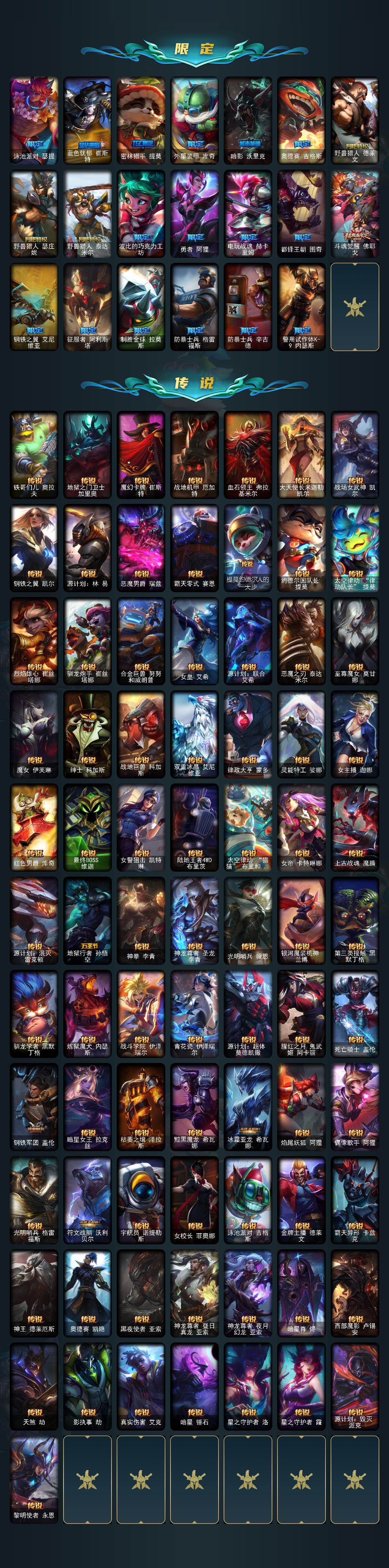 172英雄-804皮肤-172英雄/804皮肤/4终极/31神话/118限定/18臻彩/419炫彩/78传说/179史诗/未定级/十周年纪念 安妮/源代码 乐芙兰/暗星 科加斯/神凰行者 瑞羽圣凰 艾尼维亚/海克斯科技 波比/海克斯科技 雷克顿/海克斯科技 斯维因/零之呛骑 赫卡里姆/摄魂使者 薇恩/至臻 征服者 贾克斯/至臻 真实伤害 赛娜/至臻 真实伤害 亚索/至臻 电玩女神 凯特琳/至臻 福牛守护者 菲奥娜/至