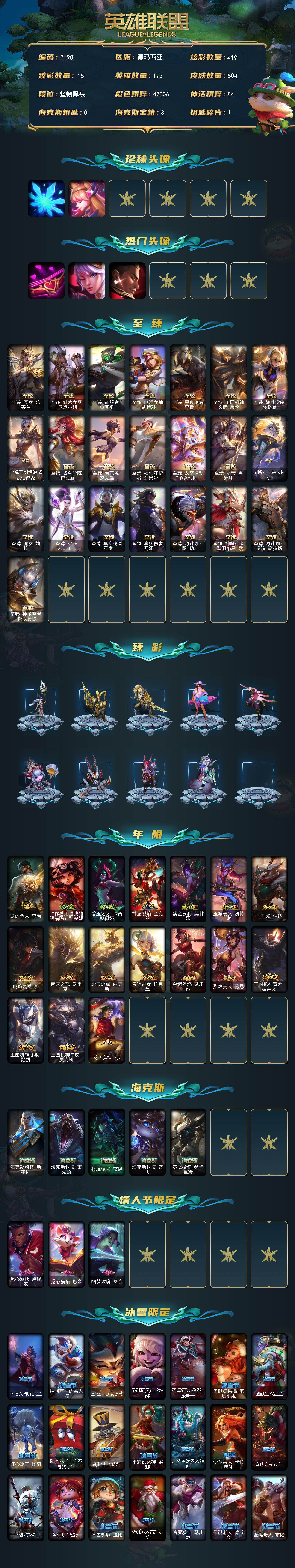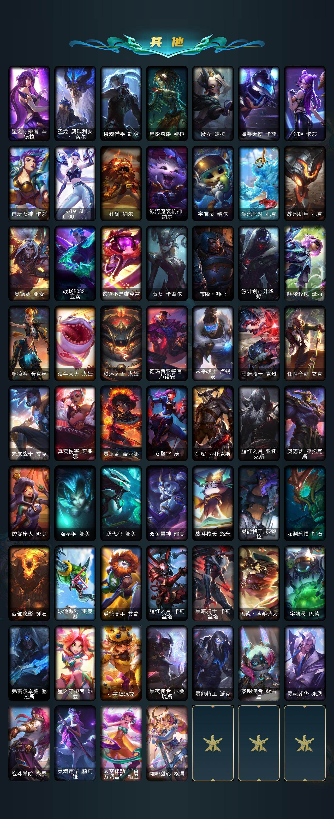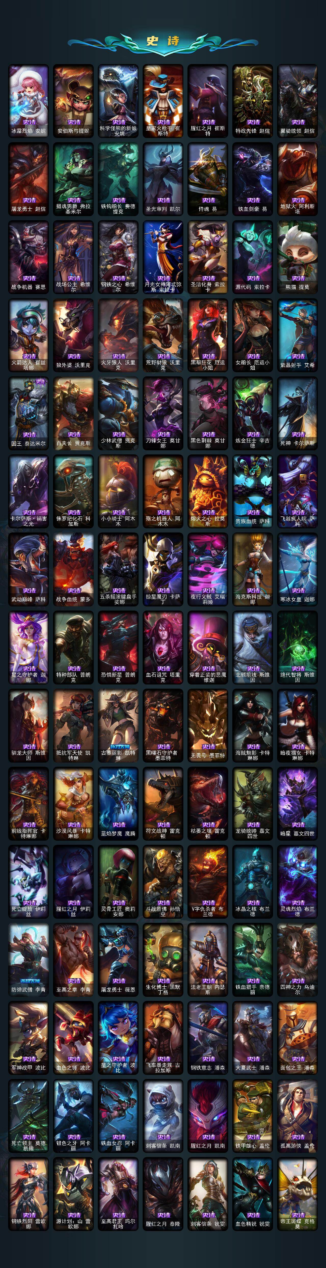 172英雄-804皮肤-172英雄/804皮肤/4终极/31神话/118限定/18臻彩/419炫彩/78传说/179史诗/未定级/十周年纪念 安妮/源代码 乐芙兰/暗星 科加斯/神凰行者 瑞羽圣凰 艾尼维亚/海克斯科技 波比/海克斯科技 雷克顿/海克斯科技 斯维因/零之呛骑 赫卡里姆/摄魂使者 薇恩/至臻 征服者 贾克斯/至臻 真实伤害 赛娜/至臻 真实伤害 亚索/至臻 电玩女神 凯特琳/至臻 福牛守护者 菲奥娜/至