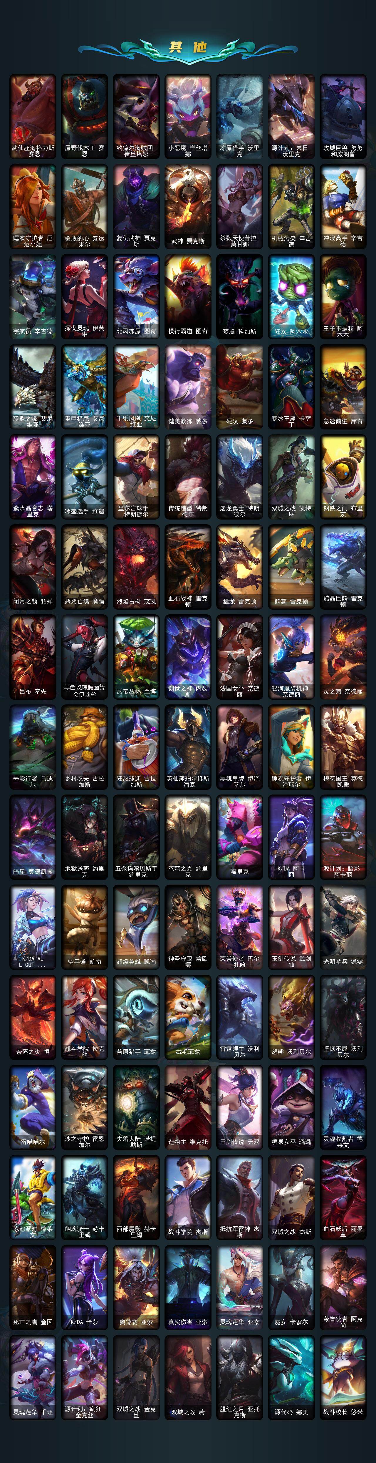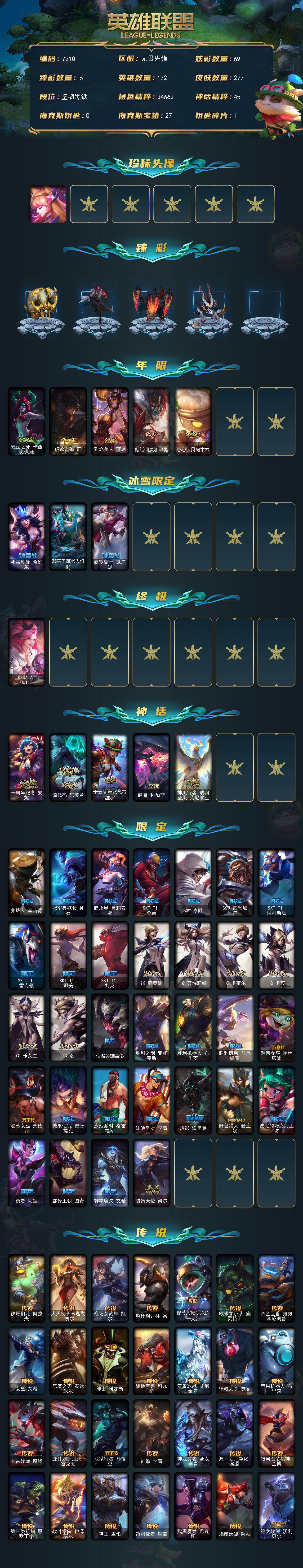 172英雄-277皮肤-172英雄/277皮肤/3终极/5神话/40限定/6臻彩/69炫彩/38传说/62史诗/未定级/十周年纪念 安妮/源代码 乐芙兰/十五周年纪念 希维尔/暗星 科加斯/神凰行者 瑞羽圣凰 艾尼维亚/星守阿狸头像/征服者 阿利斯塔 炫金/西部魔影 卢锡安 贝利尔之怠/山海绘卷 科加斯 朱红/霸天异形 卡兹克 刹那银光/水晶玫瑰斯维因纯洁花蕾/红莲之刃锐雯/碧玉之牙 卡西奥佩娅/虎痴之拳 蔚/烈焰美