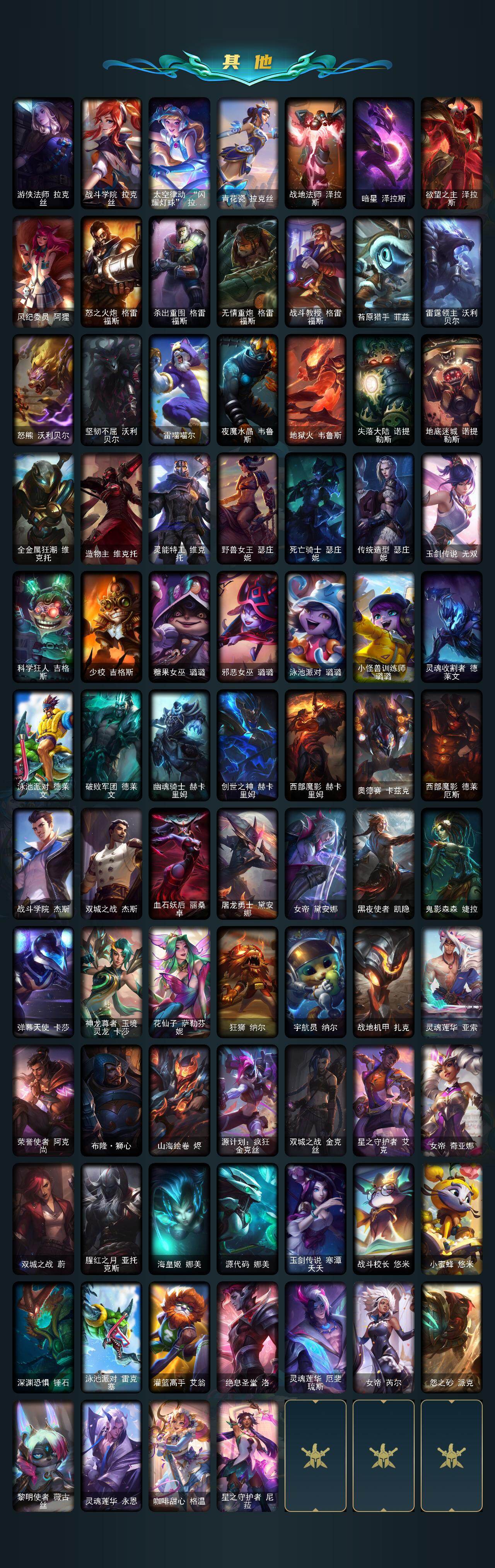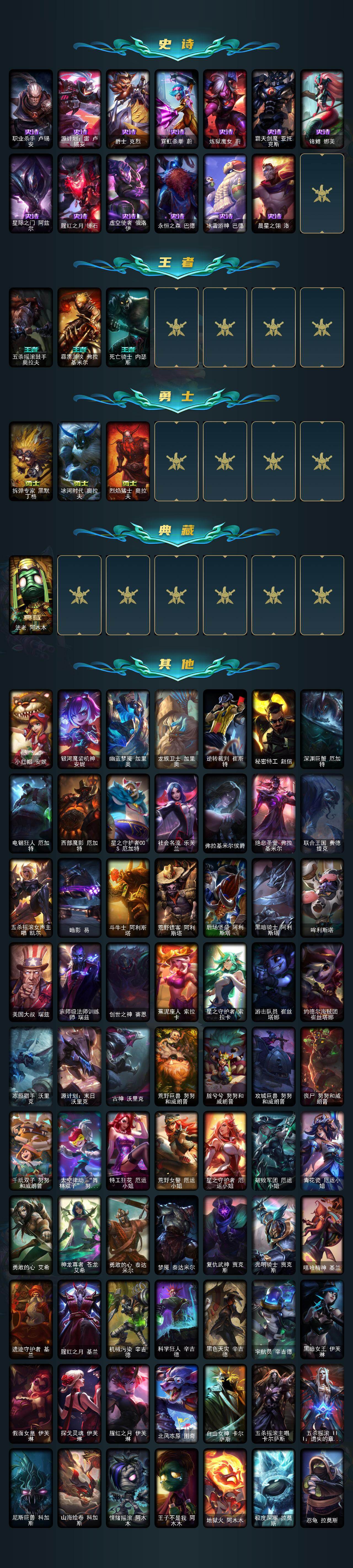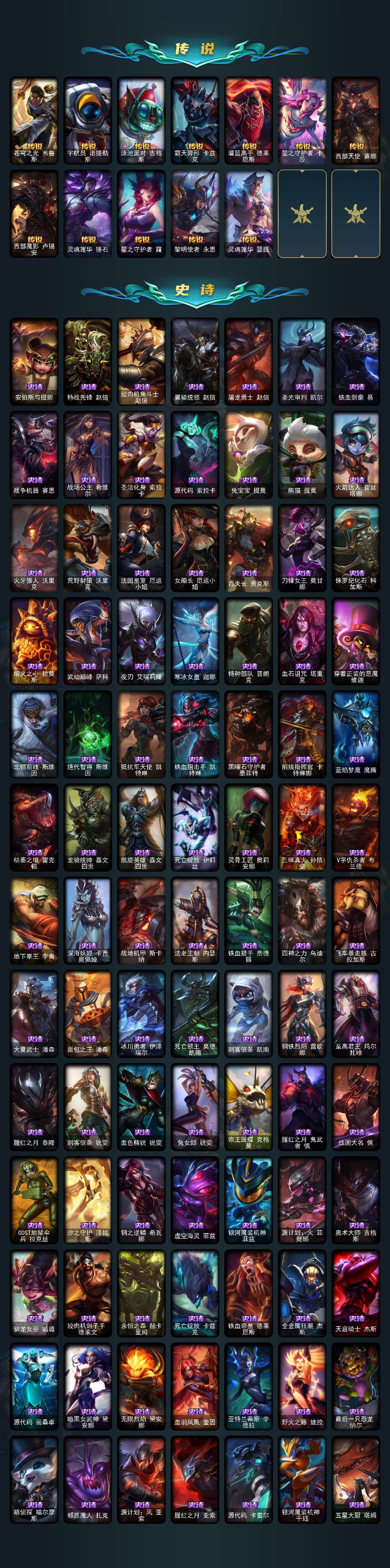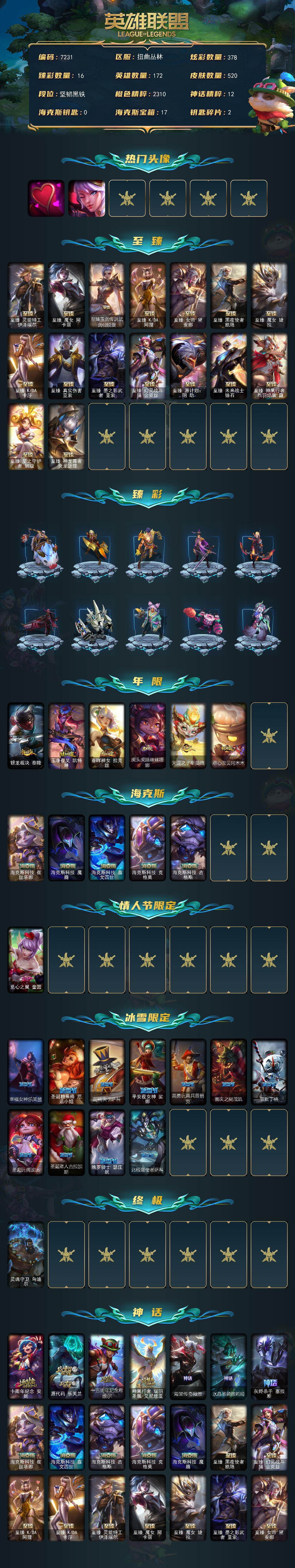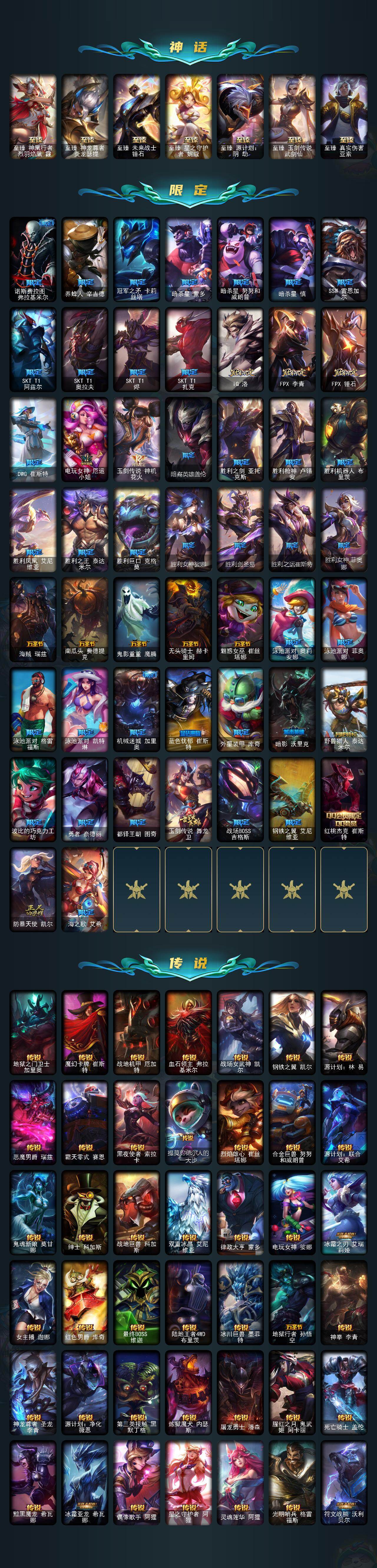172英雄-520皮肤-172英雄/520皮肤/1终极/28神话/69限定/16臻彩/378炫彩/54传说/104史诗/未定级/十周年纪念 安妮/源代码 乐芙兰/十五周年纪念 希维尔/神凰行者 瑞羽圣凰 艾尼维亚/殿堂传奇薇恩/水晶圣骑 塔莉垭/灰烬杀手 塞拉斯/海克斯科技 崔丝塔娜/海克斯科技 嘉文四世/海克斯科技 吉格斯/海克斯科技 克格莫/海克斯科技 魔腾/至臻 真实伤害 亚索/至臻 黑夜使者 凯隐/至臻 幻灵