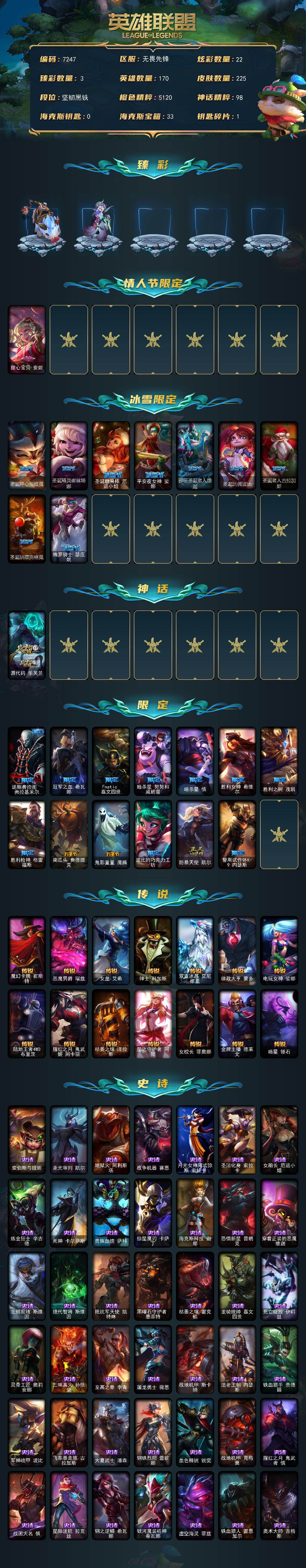 170英雄-225皮肤-170英雄/225皮肤/1神话/23限定/3臻彩/22炫彩/14传说/55史诗/未定级/源代码 乐芙兰/无畏骑士 瑟庄妮 赤子初心/魔女 阿卡丽 虚荣/净雪之月 莫甘娜 冬虹/甜心宝贝 安妮/圣诞开心鬼提莫/圣诞精灵崔丝塔娜/圣诞糖果棒 厄运小姐/平安夜女神 娑娜/邪恶圣诞老人维迦/圣诞玩偶波比/圣诞老人古拉加斯/圣诞驯鹿克格莫/魄罗骑士 瑟庄妮/诺斯费拉图 弗拉基米尔/冠军之血 希瓦娜/f