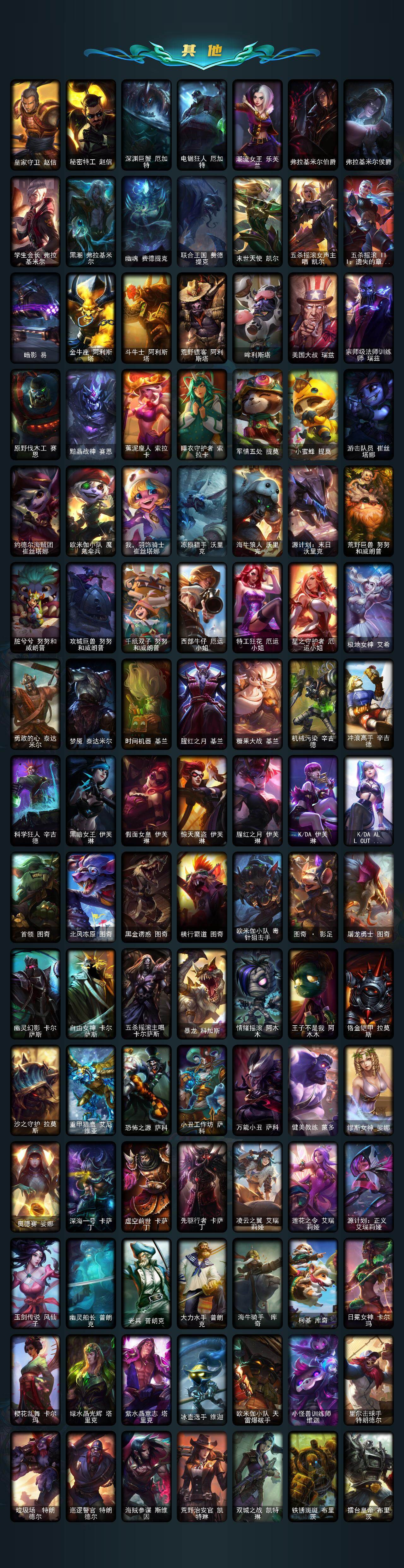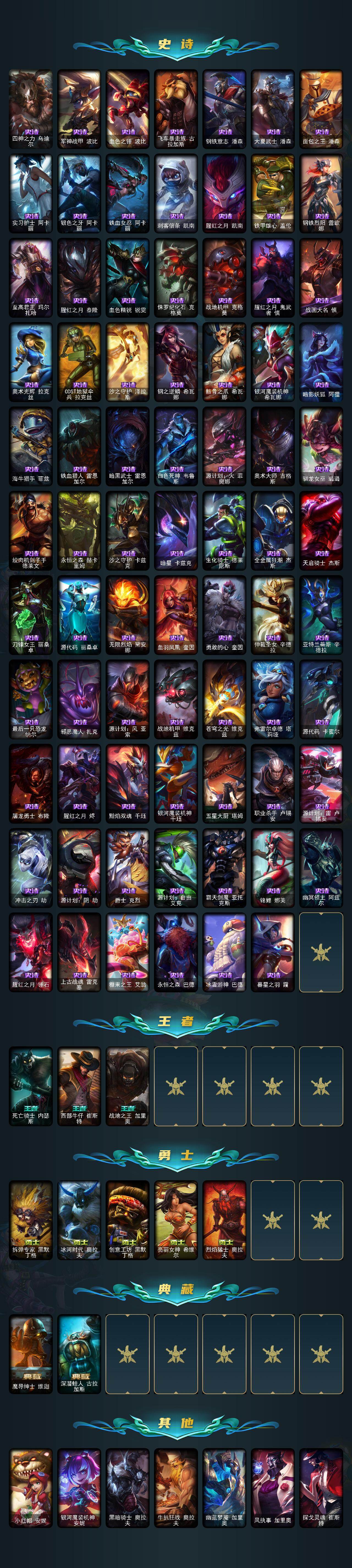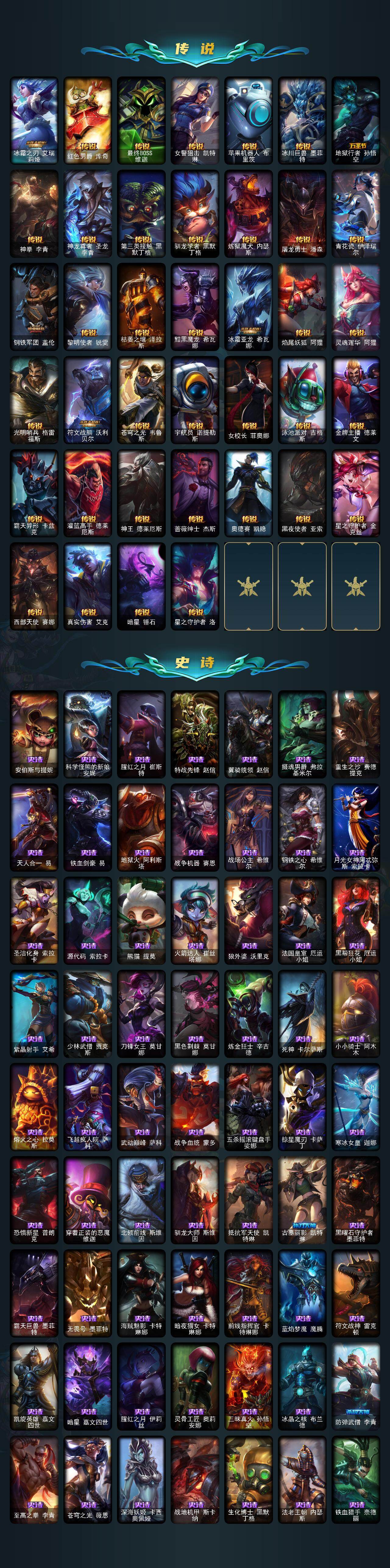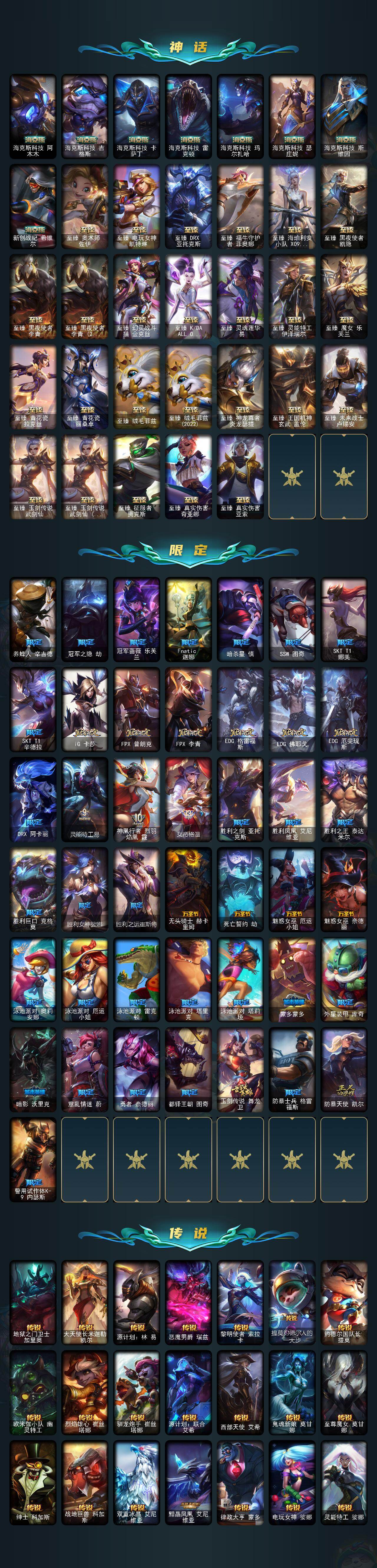 172英雄-598皮肤-172英雄/598皮肤/1终极/41神话/64限定/11臻彩/254炫彩/60传说/139史诗/未定级/十周年纪念 安妮/源代码 乐芙兰/神凰行者 瑞羽圣凰 艾尼维亚/黎明使者 卡尔玛/水晶泰坦诺提勒斯/灰烬杀手 塞拉斯/灰烬骑士 派克/海克斯科技 阿木木/海克斯科技 吉格斯/海克斯科技 卡萨丁/海克斯科技 雷克顿/海克斯科技 玛尔扎哈/海克斯科技 瑟庄妮/海克斯科技 斯维因/新创战纪 希维尔