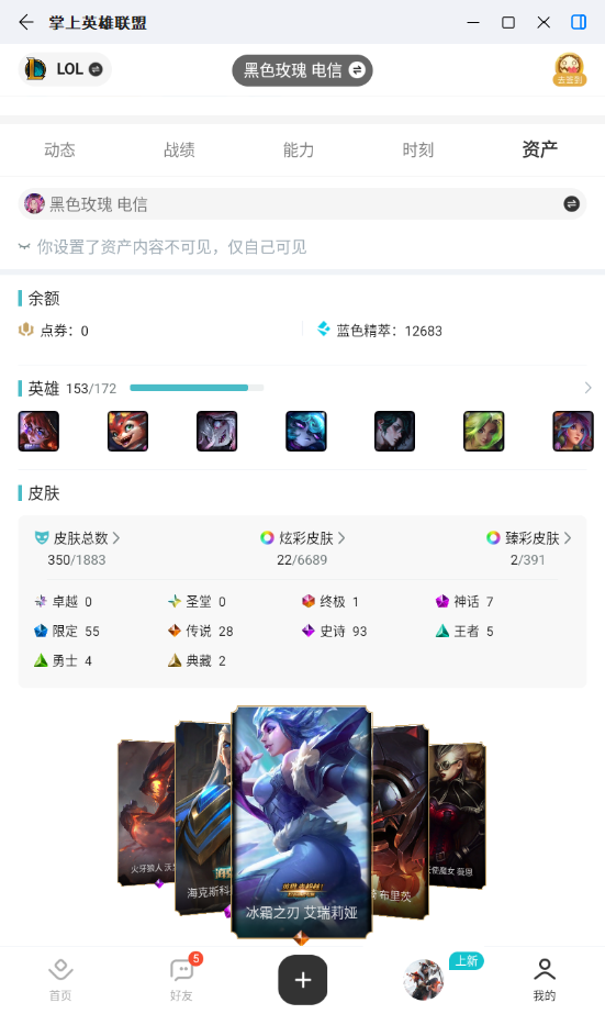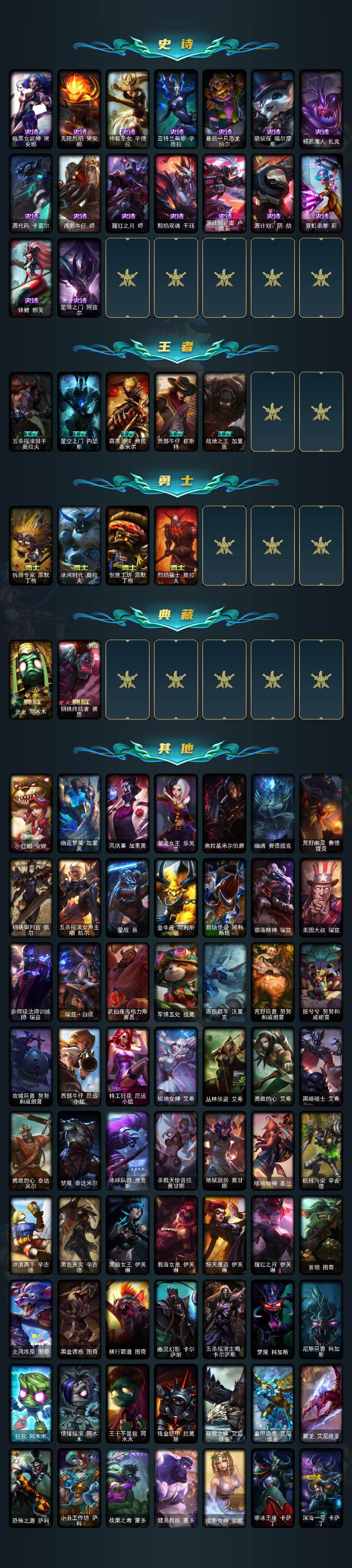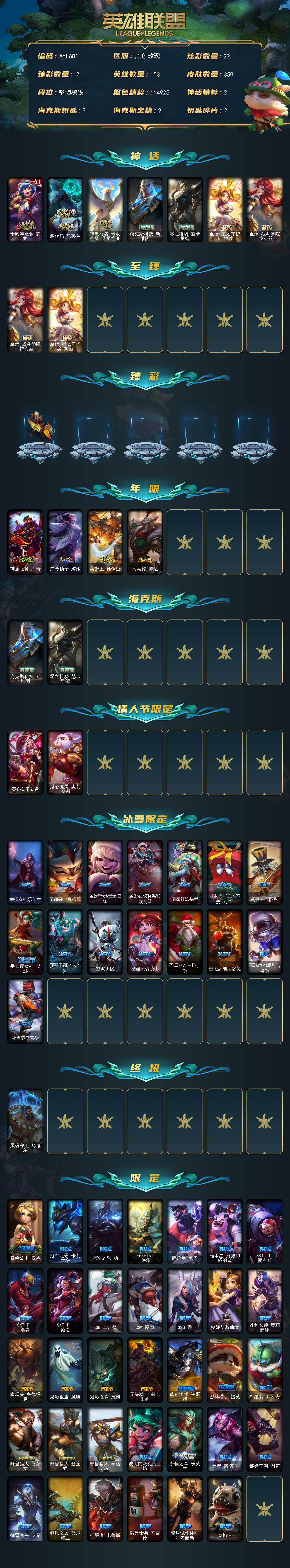 【特价出售/店主推荐】 未定级段位-153英雄-350皮肤-22炫彩-1终极-7神话-55限定-28传说-93史诗 【神话皮肤】:十周年纪念安妮,源代码乐芙兰,神凰行者瑞羽圣凰艾尼维亚,海克斯科技斯维因,零之呛骑赫卡里姆,至臻星之守护者妮蔻,至臻战斗学院拉克丝 【至臻皮肤】:至臻战斗学院拉克丝,至臻星之守护者妮蔻 【臻彩皮肤】:征服者韦鲁斯炫金,战斗学院卡特琳娜盛典礼服 【年限皮肤】:神龙之翼库奇,广寒仙子嫦娥,美猴王孙悟空,司马懿仲达 【海克斯皮肤】:海克斯科技斯维因,零之呛骑赫卡里姆 【情人节限定】:觅心女王艾希,觅心魔灵奥莉安娜 【冰雪限定】:幸福女神乐芙兰,圣诞开心鬼提莫,圣诞精灵崔丝塔娜,圣诞狂欢努努和威朗普,圣诞狂欢基兰,阿木木“主人不要我了”,胡桃夹子萨科,平安夜女神娑娜,邪恶圣诞老人维迦,雪默丁格,圣诞玩偶波比,圣诞老人古拉加斯,圣诞驯鹿克格莫,雪球也能爆炸吉格斯,冰雪节辛吉德 【终极皮肤】:灵魂守卫乌迪尔 【限定皮肤】:舞会公主安妮,冠军之矛卡莉丝塔,冠军之隐劫,fnatic迦娜,暗杀星蒙多,暗杀星努努和威朗普,sktt1贾克斯,sktt1李青,sktt1薇恩,ssw辛吉德,ssw图奇,ssg霞,安妮梦游仙境,胜利女神奥莉安娜,南瓜头费德提克,鬼影重重魔腾,鬼影森森茂凯,无头骑士赫卡里姆,蓝色忧郁崔斯特,密林猎手提莫,外星装甲库奇,野兽猎人德莱文,野兽猎人瑟庄妮,野兽猎人泰达米尔,波比的巧克力工坊,永恒之森乐芙兰,勇者奈德丽,都铎王朝图奇,御星魔矢艾希,钢铁之翼艾尼维亚,征服者韦鲁斯,防暴士兵辛吉德,警用试作体k9内瑟斯,克格汪 【传说皮肤】:铁哥们儿奥拉夫,战地机甲厄加特,血石领主弗拉基米尔,大天使长米迦勒凯尔,恶魔男爵瑞兹,约德尔国队长提莫,合金巨兽努努和威朗普,女皇艾希,源计划联合艾希,鬼魂新娘莫甘娜,战地巨兽科加斯,双重冰晶艾尼维亚,冰霜之刃艾瑞莉娅,红色男爵库奇,最终boss维迦,陆地王者4wd布里茨,冰川巨兽墨菲特,第三类接触黑默丁格,炼狱魔犬内瑟斯,屠龙勇士潘森,黯黑魔龙希瓦娜,符文战熊沃利贝尔,苍穹之光韦鲁斯,宇航员诺提勒斯,女校长菲奥娜,灌篮高手德莱厄斯,蔷薇绅士杰斯,星之守护者金克丝 【史诗皮肤】:安伯斯与提妮,皇家火呛手崔斯特,特战先锋赵信,翼骑统领赵信,圣光审判凯尔,铁血剑豪易,地狱火阿利斯塔,战争机器赛恩,战场公主希维尔,钢铁之心希维尔,源代码索拉卡,火牙狼人沃里克,女船长厄运小姐,紫晶射手艾希,国王泰达米尔,百夫长贾克斯,刀锋女王莫甘娜,炼金狂士辛吉德,死神卡尔萨斯,卡尔萨斯祸害之光,侏罗纪化石科加斯,小小骑士阿木木,全金属狂潮拉莫斯,飞越疯人院萨科,武动巅峰萨科,战争血统蒙多,掠星魔刃卡萨丁,夜刃艾瑞莉娅,海克斯科技迦娜,恐惧新星普朗克,穿着正装的恶魔维迦,绝代智将斯维因,抵抗军天使凯特琳,古墓丽影凯特琳,铁血狙击手凯特琳,黑曜石守护者墨菲特,海贼魅影卡特琳娜,前线指挥官卡特琳娜,沙漠风暴卡特琳娜,蓝焰梦魔魔腾,暗星嘉文四世,死亡绽放伊莉丝,v字仇杀者布兰德,防弹武僧李青,屠龙勇士薇恩,深海妖姬卡西奥佩娅,法老王朝内瑟斯,铁血猎手奈德丽,军神战甲波比,血色之锤波比,死亡领主莫德凯撒,银色之牙阿卡丽,铁血女忍阿卡丽,刺客信条凯南,腥红之月凯南,孤高游侠盖伦,钢铁烈阳蕾欧娜,源计划山蕾欧娜,血色精锐锐雯,兔女郎锐雯,帝王斑蝶克格莫,侏罗纪化石克格莫,腥红之月鬼武者慎,战国大名慎,odst地狱伞兵拉克丝,星际迷航拉克丝,钢之逆鳞希瓦娜,骸骨之爪希瓦娜,铁血猎人雷恩加尔,暗黑武士雷恩加尔,白色死神韦鲁斯,永恒之森赫卡里姆,沙之守护卡兹克,生化骑士德莱厄斯,全金属狂潮杰斯,天启骑士杰斯,源代码丽桑卓,暗黑女武神黛安娜,无限烈焰黛安娜,仲裁圣女辛德拉,亚特兰蒂斯辛德拉,最后一只恐龙纳尔,萌侦探喵尔摩斯,邪恶魔人扎克,源代码卡蜜尔,西部牛仔烬,腥红之月烬,黯焰双魂千珏,源计划雷卢锡安,源计划阴劫,霓虹杀拳蔚,锦鲤娜美,星际之门阿兹尔 【王者皮肤】:五杀摇滚鼓手奥拉夫,星空之门内瑟斯,霹雳游侠弗拉基米尔,西部牛仔崔斯特,战地之王加里奥 【勇士皮肤】:拆弹专家黑默丁格,冰河时代奥拉夫,创意工坊黑默丁格,烈焰猛士奥拉夫 【典藏皮肤】:法老阿木木,钢铁终结者赛恩 【其他皮肤1】:小红帽安妮,幽蓝梦魇加里奥,风执事加里奥,潮流女王乐芙兰,弗拉基米尔伯爵,幽魂费德提克,荒野幽灵费德提克,钢铁审判官凯尔,五杀摇滚女声主唱凯尔,星战易,金牛座阿利斯塔,后场堡垒阿利斯塔,部落精神瑞兹,美国大叔瑞兹,宗师级法师训练师瑞兹,瑞兹白须,武仙座海格力斯赛恩,军情五处提莫,冻原猎手沃里克,荒野巨兽努努和威朗普,脏兮兮努努和威朗普,攻城巨兽努努和威朗普,西部牛仔厄运小姐,特工狂花厄运小姐,极地女神艾希,丛林侠盗艾希,勇敢的心艾希,黑暗骑士艾希,勇敢的心泰达米尔,梦魇泰达米尔,冰球队员贾克斯,杀戮天使昔拉莫甘娜,地狱厨房莫甘娜,嘻哈精神基兰,机械污染辛吉德,冲浪高手辛吉德,黑色天灾辛吉德,黑暗女王伊芙琳,假面女皇伊芙琳,惊天魔盗伊芙琳,腥红之月伊芙琳,首领图奇,北风冻原图奇,黑金诱惑图奇,横行霸道图奇,幽灵幻影卡尔萨斯,五杀摇滚主唱卡尔萨斯,梦魇科加斯,尼斯巨兽科加斯,狂欢阿木木,情绪摇滚阿木木,王子不是我阿木木,铬金铠甲拉莫斯,联盟之喙艾尼维亚,重甲猎鹰艾尼维亚,翼龙艾